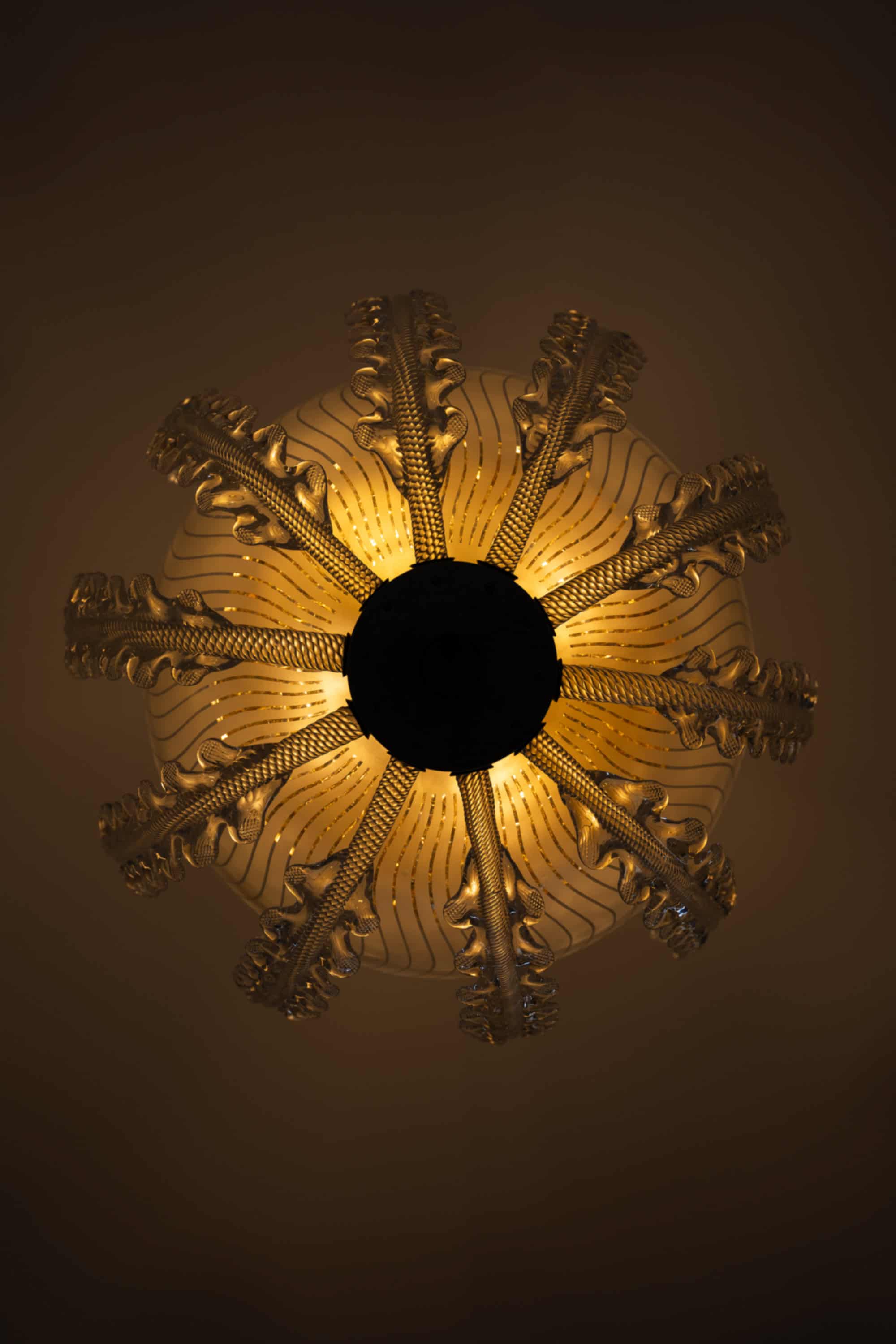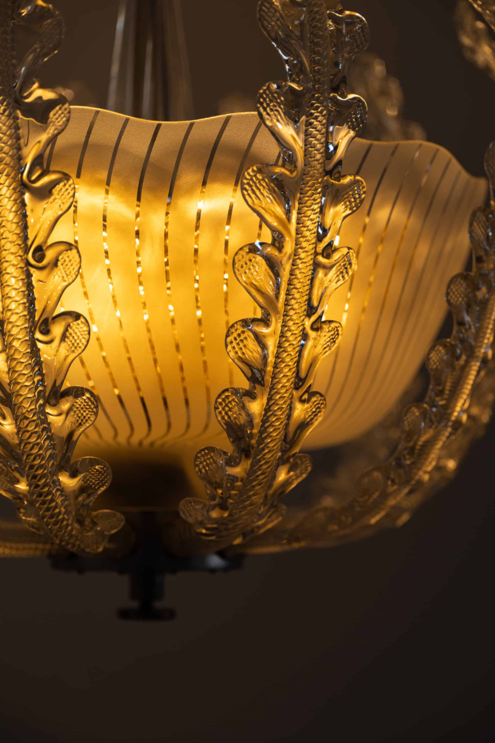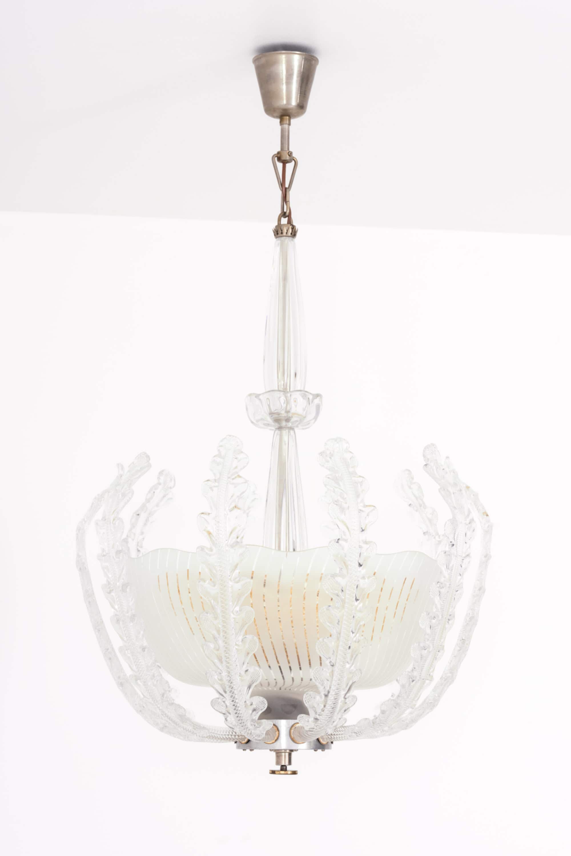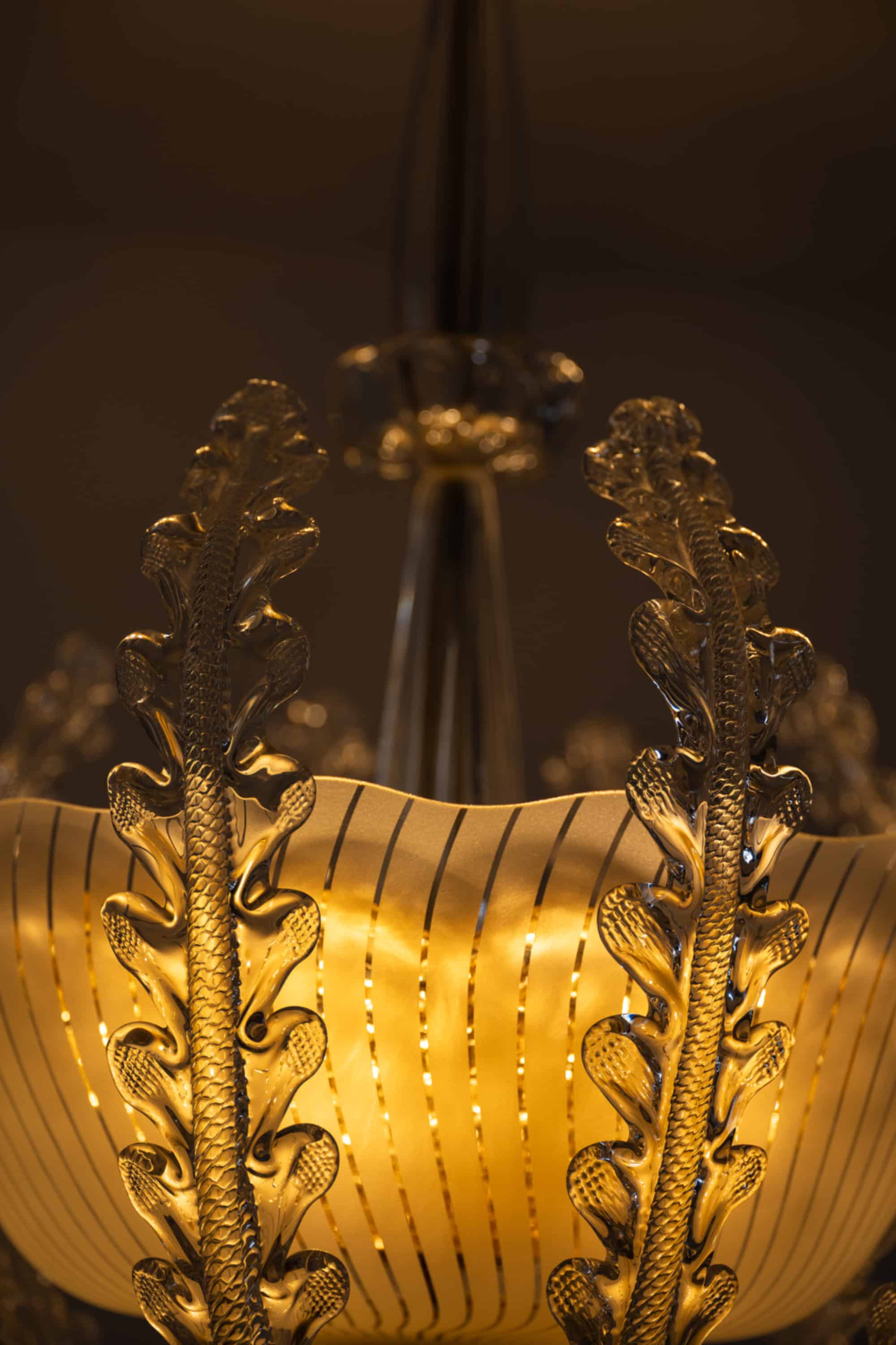 The lamp is composed of a central frosted glass bowl with finely executed vertical incised lines, creating a soft diffusion of light. Surrounding the shade is an elaborate framework of clear glass elements, formed as stylized, leaf-like structures with pronounced texture and curvature. These elements rise gracefully around the bowl, giving the fixture a dynamic, almost botanical character while maintaining symmetry and balance. The central stem is executed in clear glass with subtle vertical fluting, adding further refinement and continuity to the overall design.