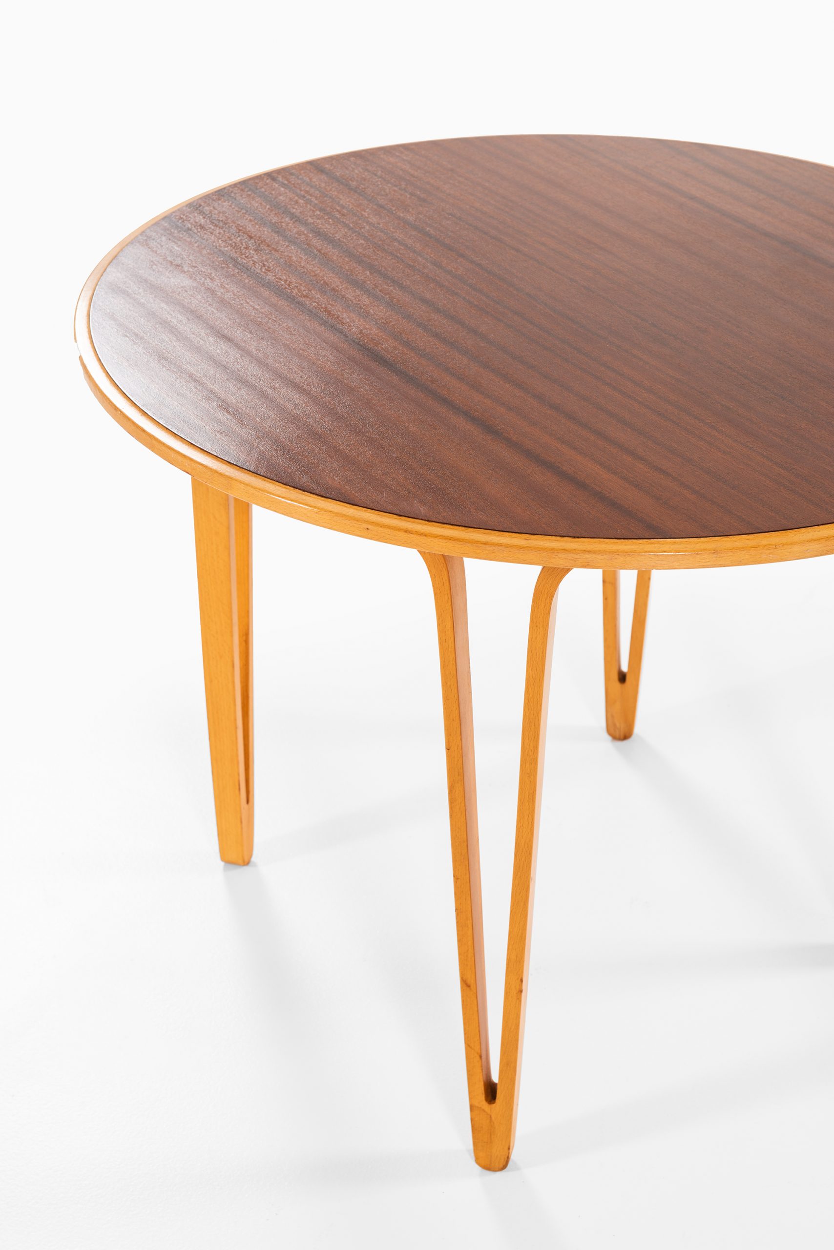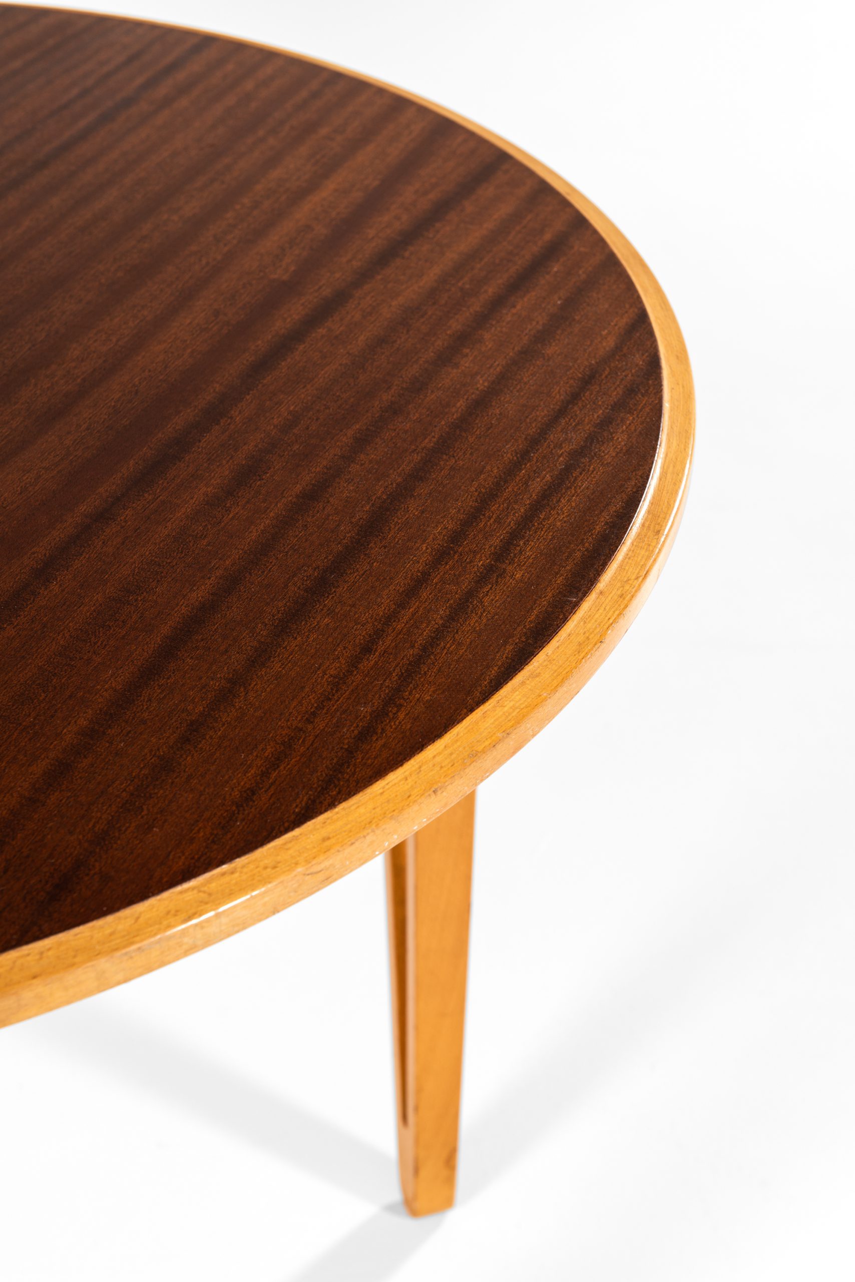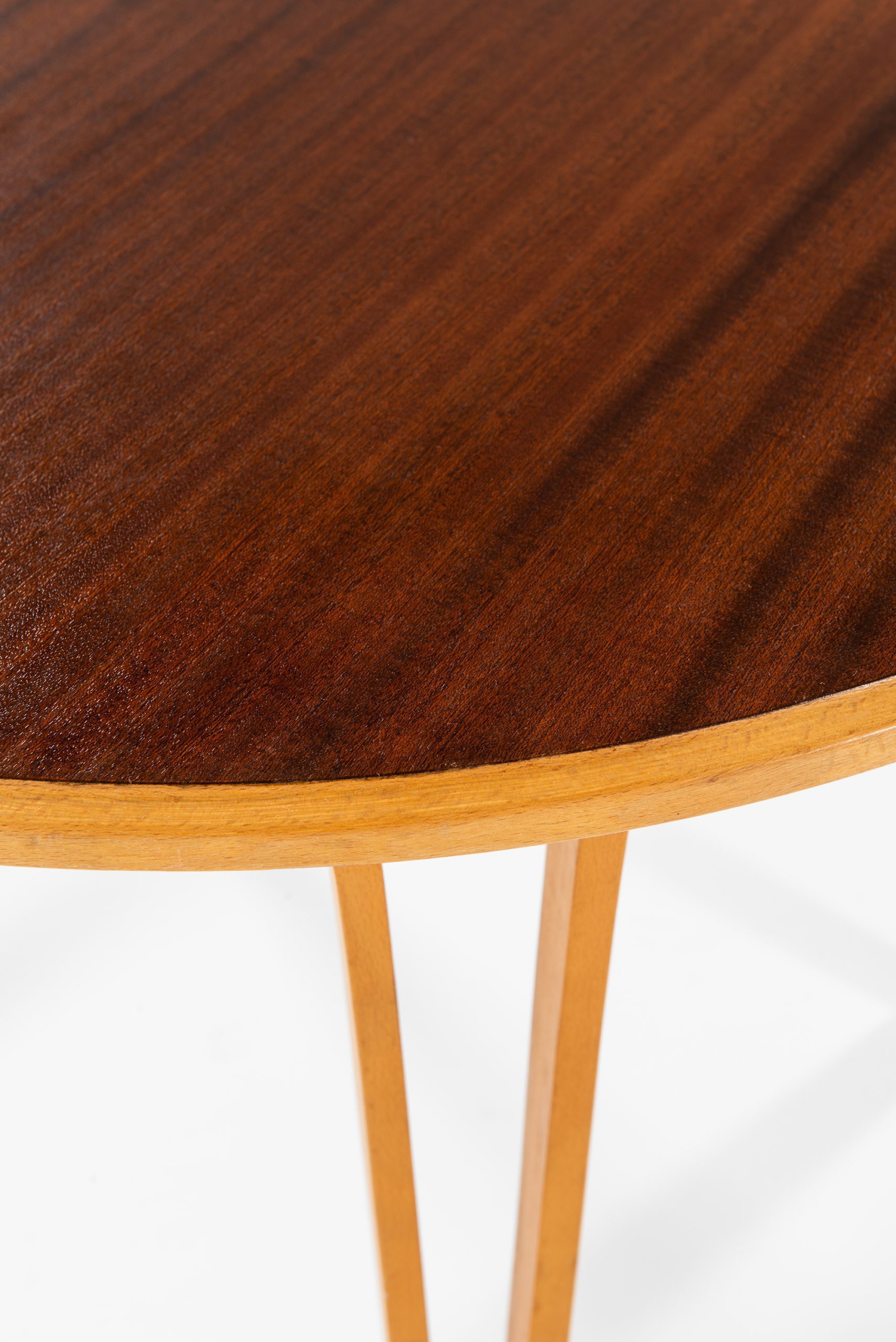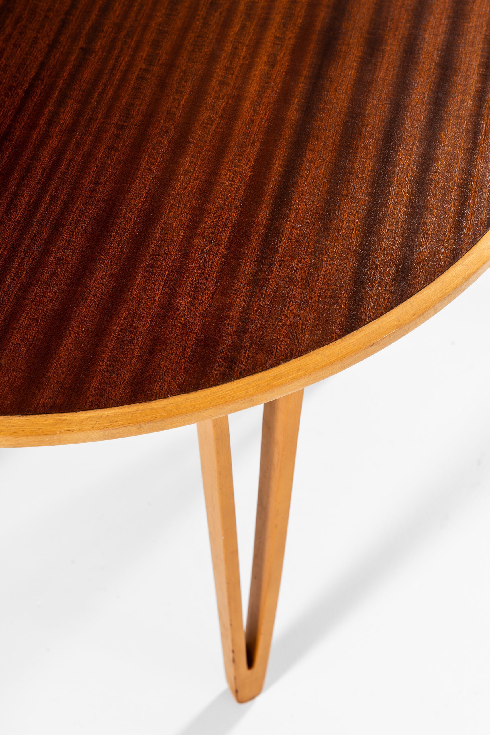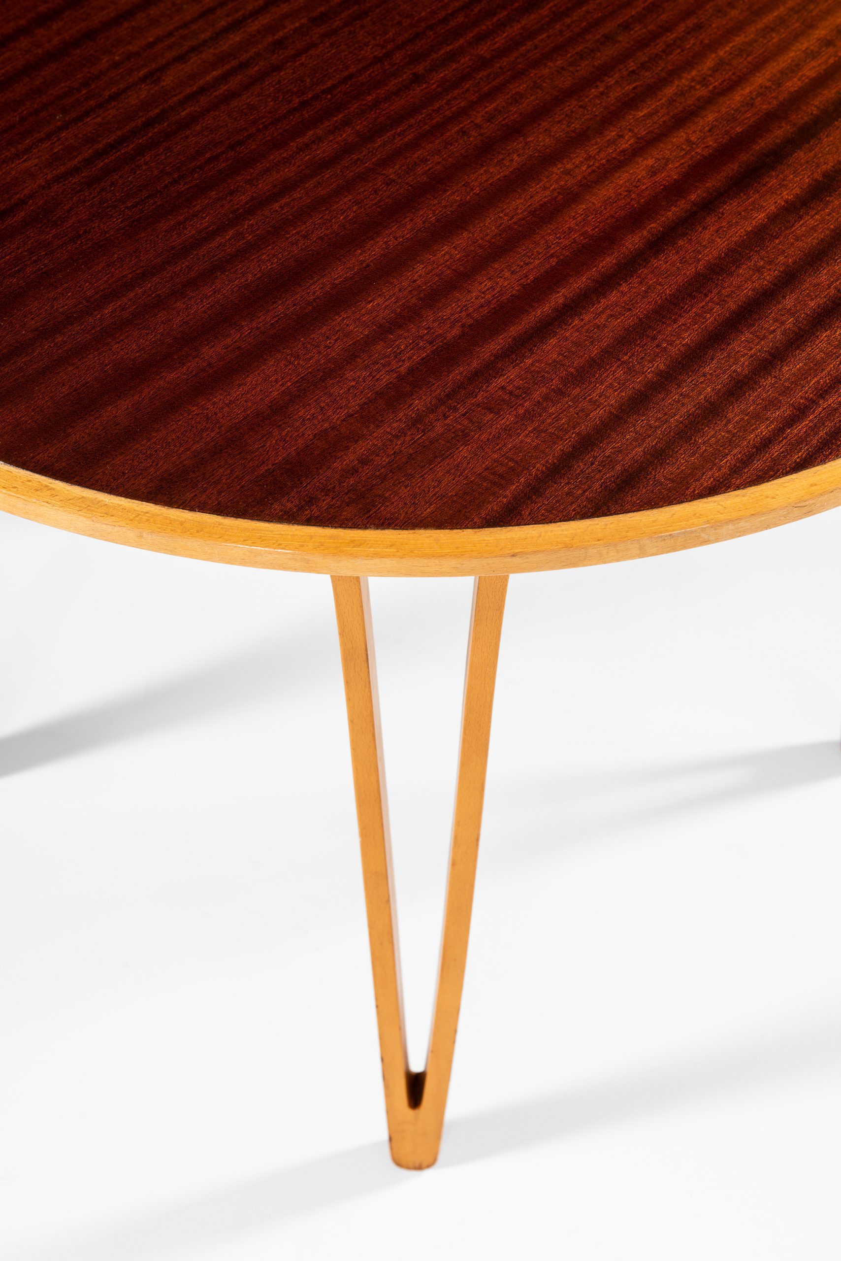 This is a rare Swedish side table or coffee table produced by Gemla during the 1940s. The design reflects the transitional aesthetic of early mid-century Scandinavian furniture, where decorative craftsmanship and modernist reduction were often combined to produce functional, elegant forms.