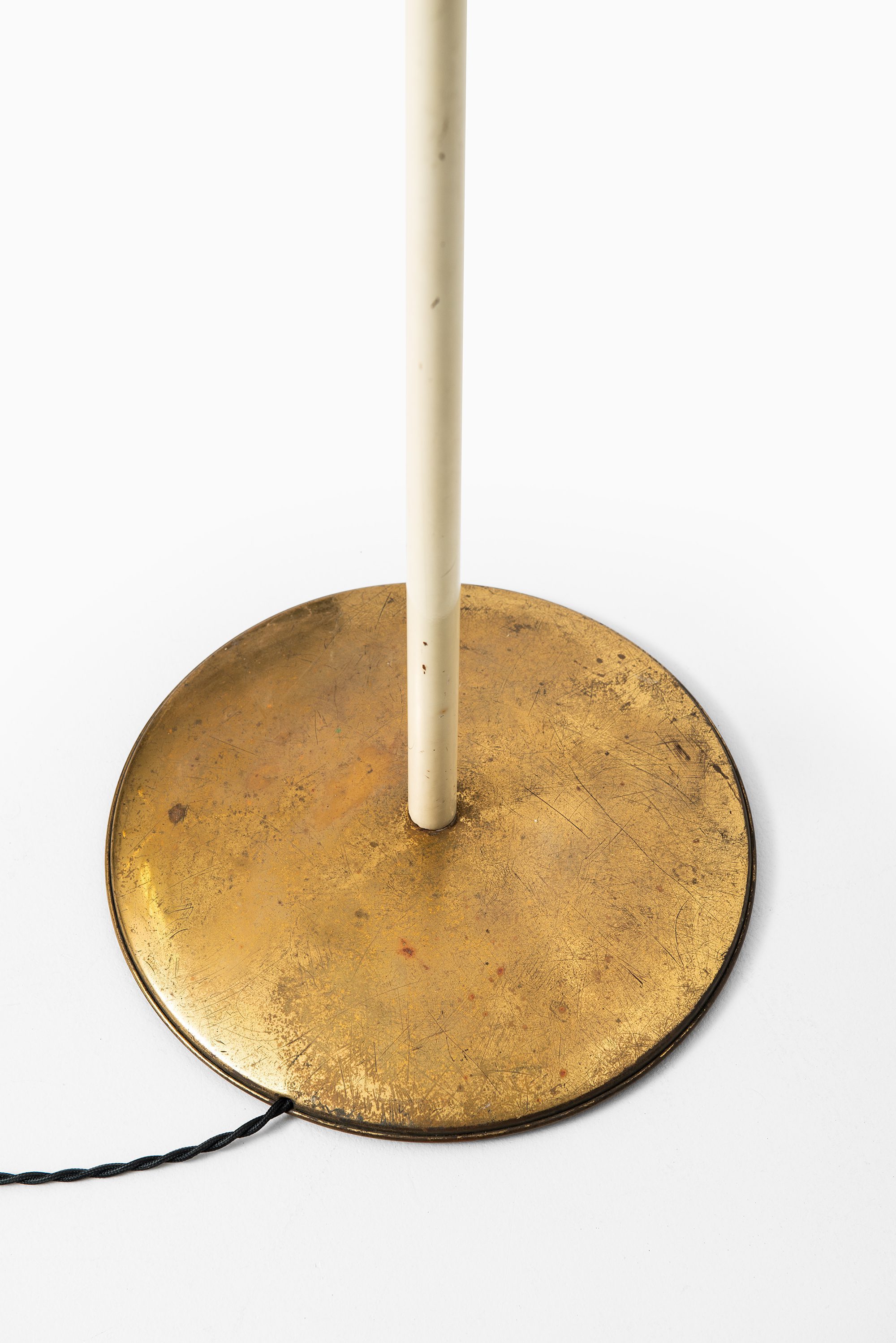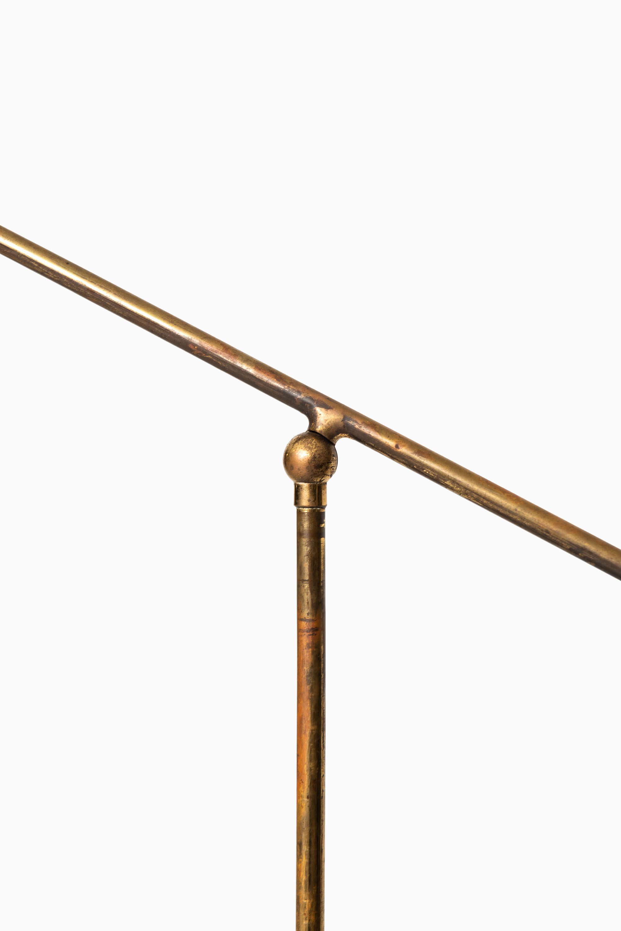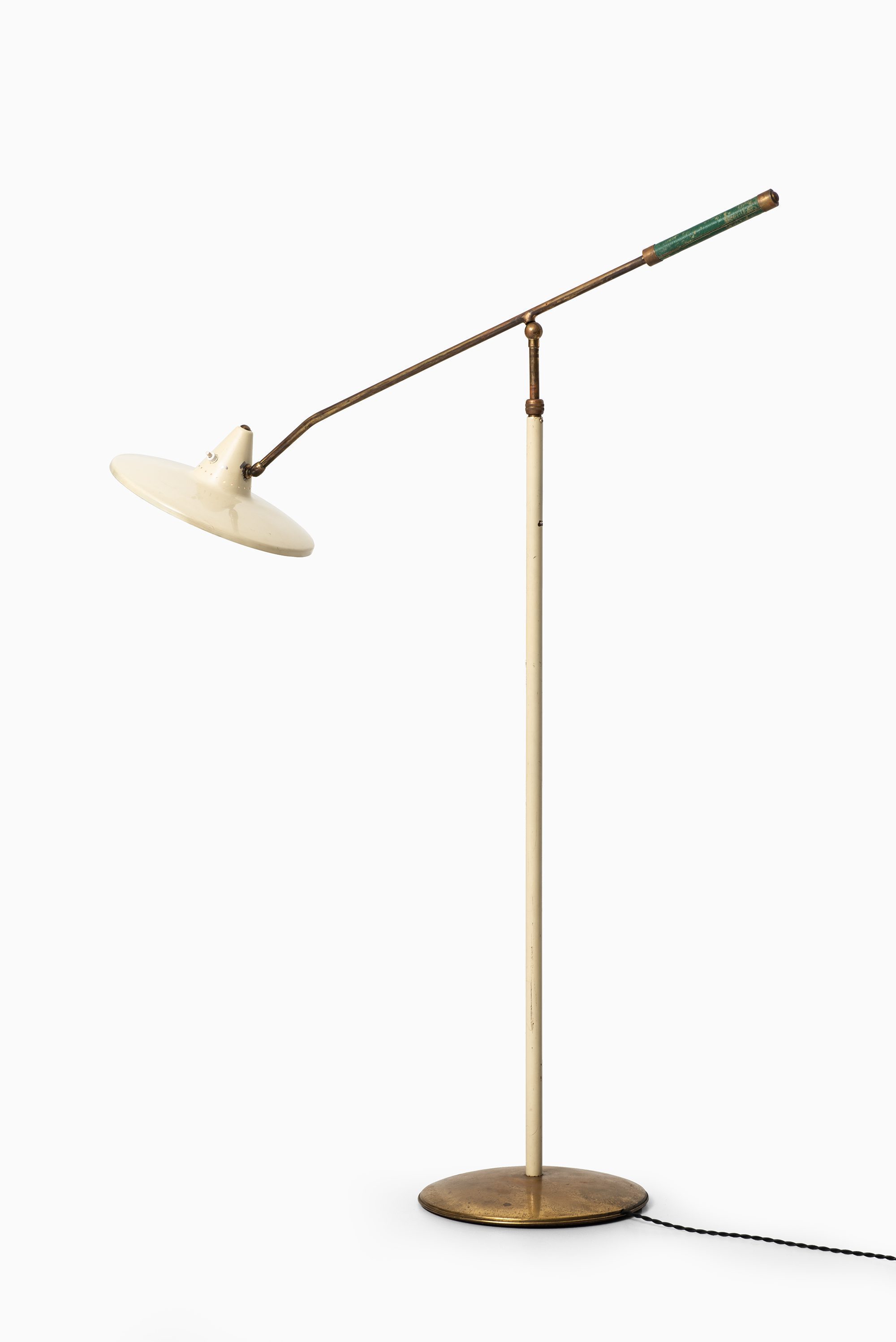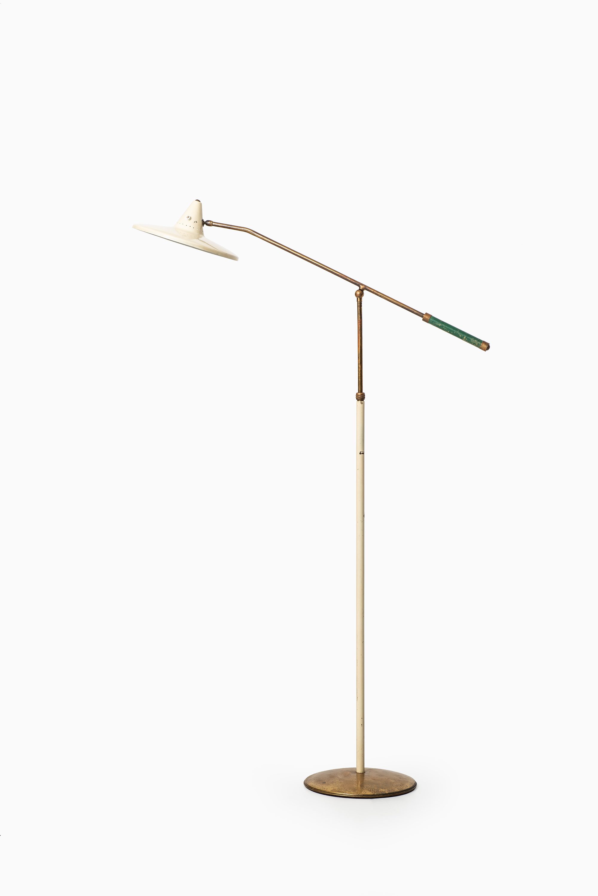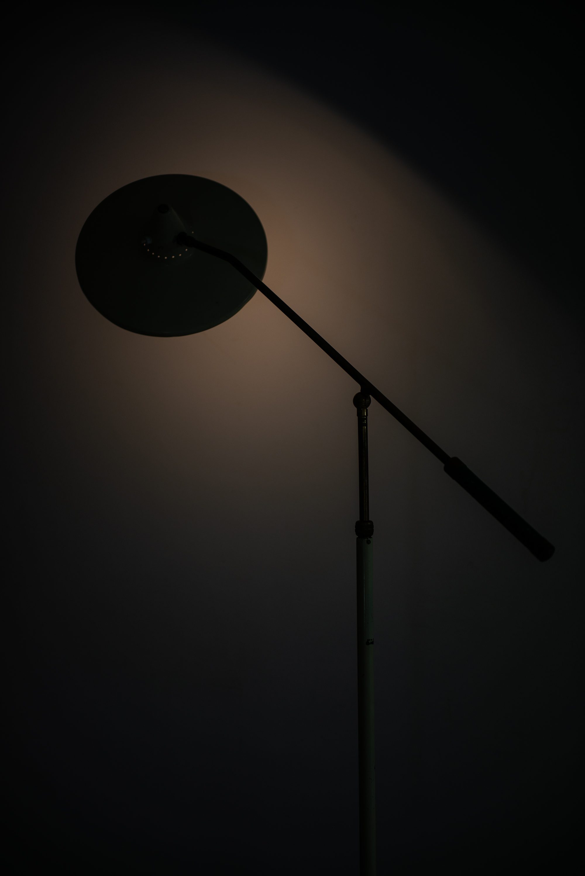 This rare adjustable floor lamp is attributed to Giuseppe Ostuni and produced by Stilnovo in Italy during the 1950s. It is a fine example of mid-century Italian design, combining functionality with refined details and high-quality materials. The lamp is executed in brass, lacquer, and leather, which together give it a distinctive tactile and visual character.