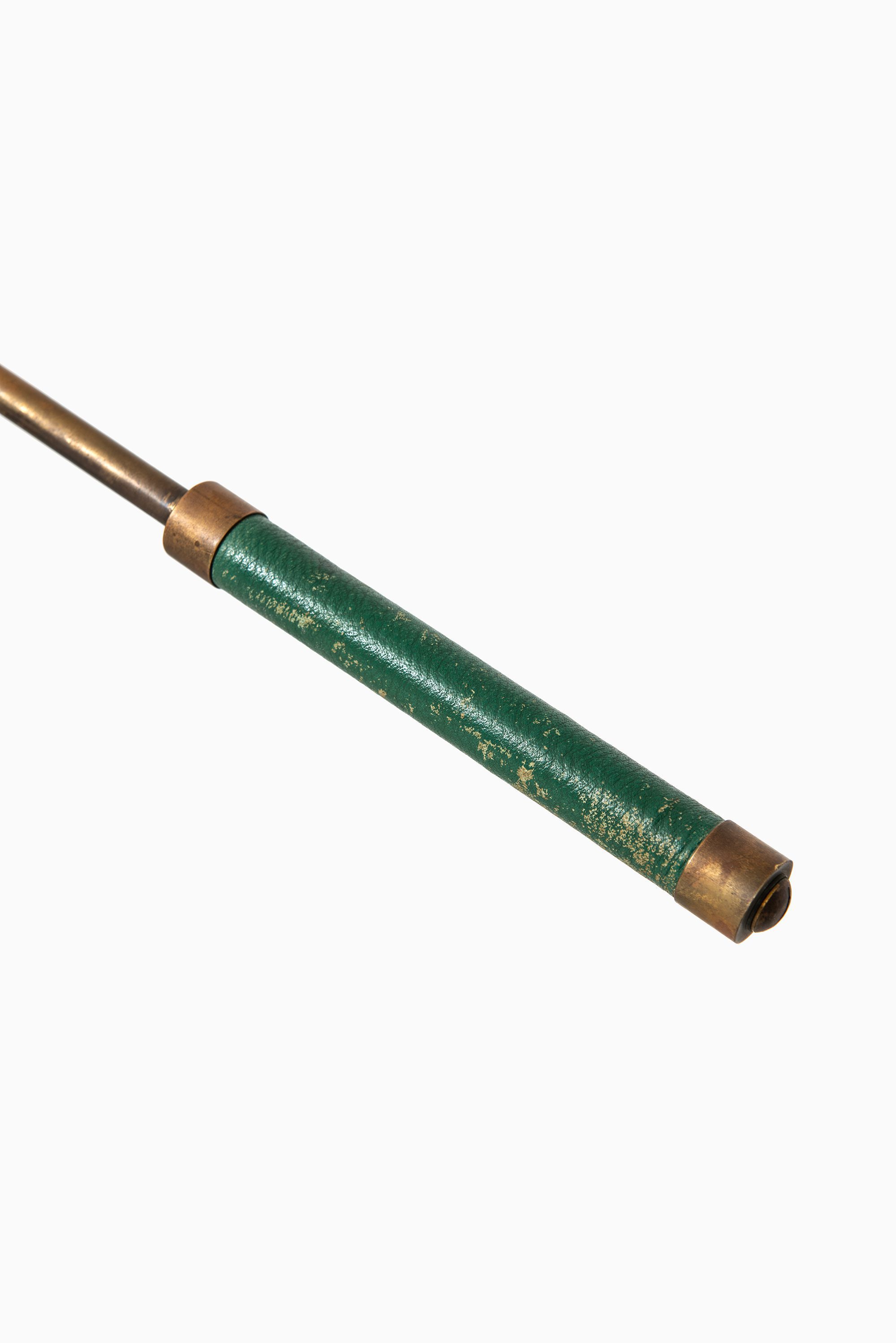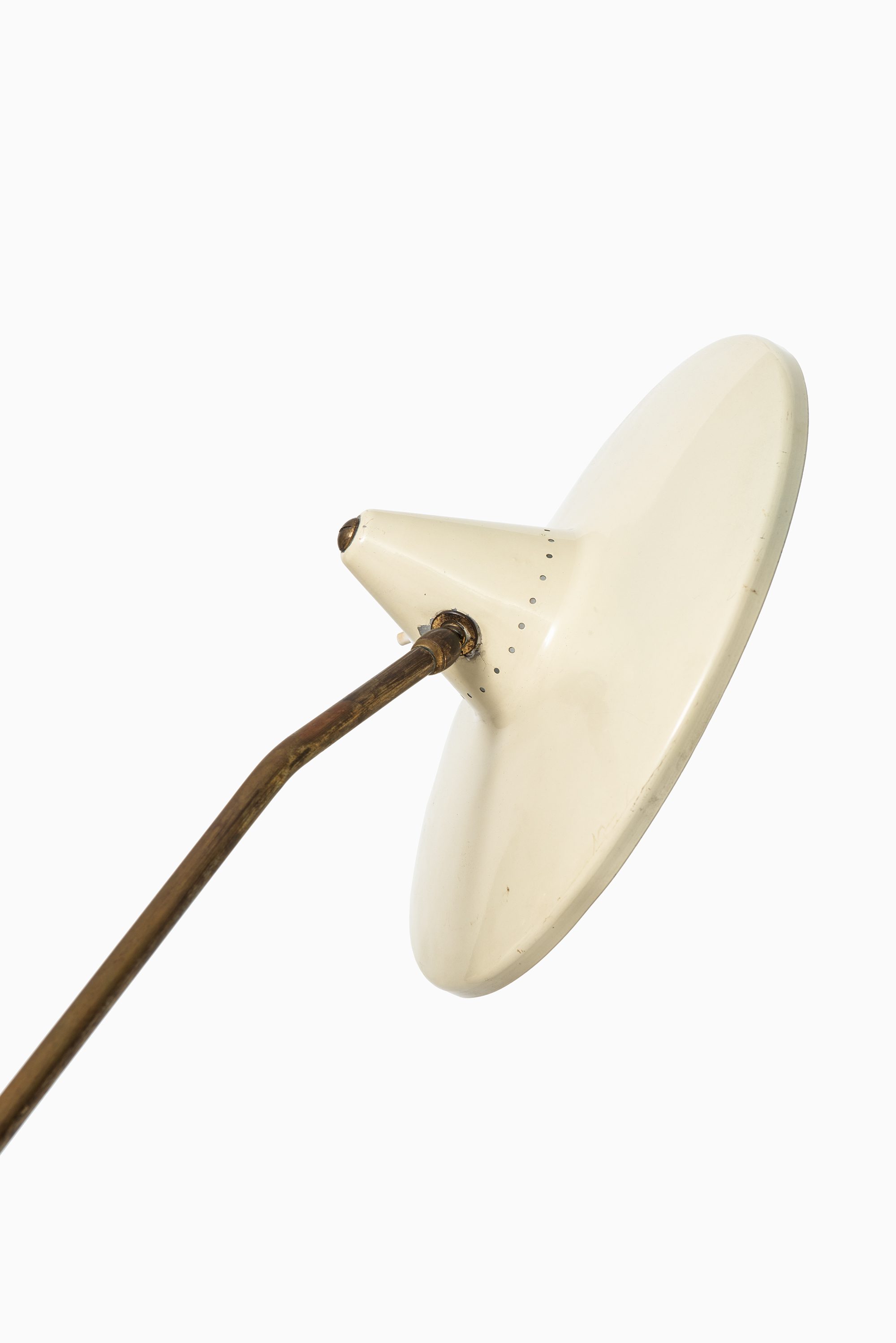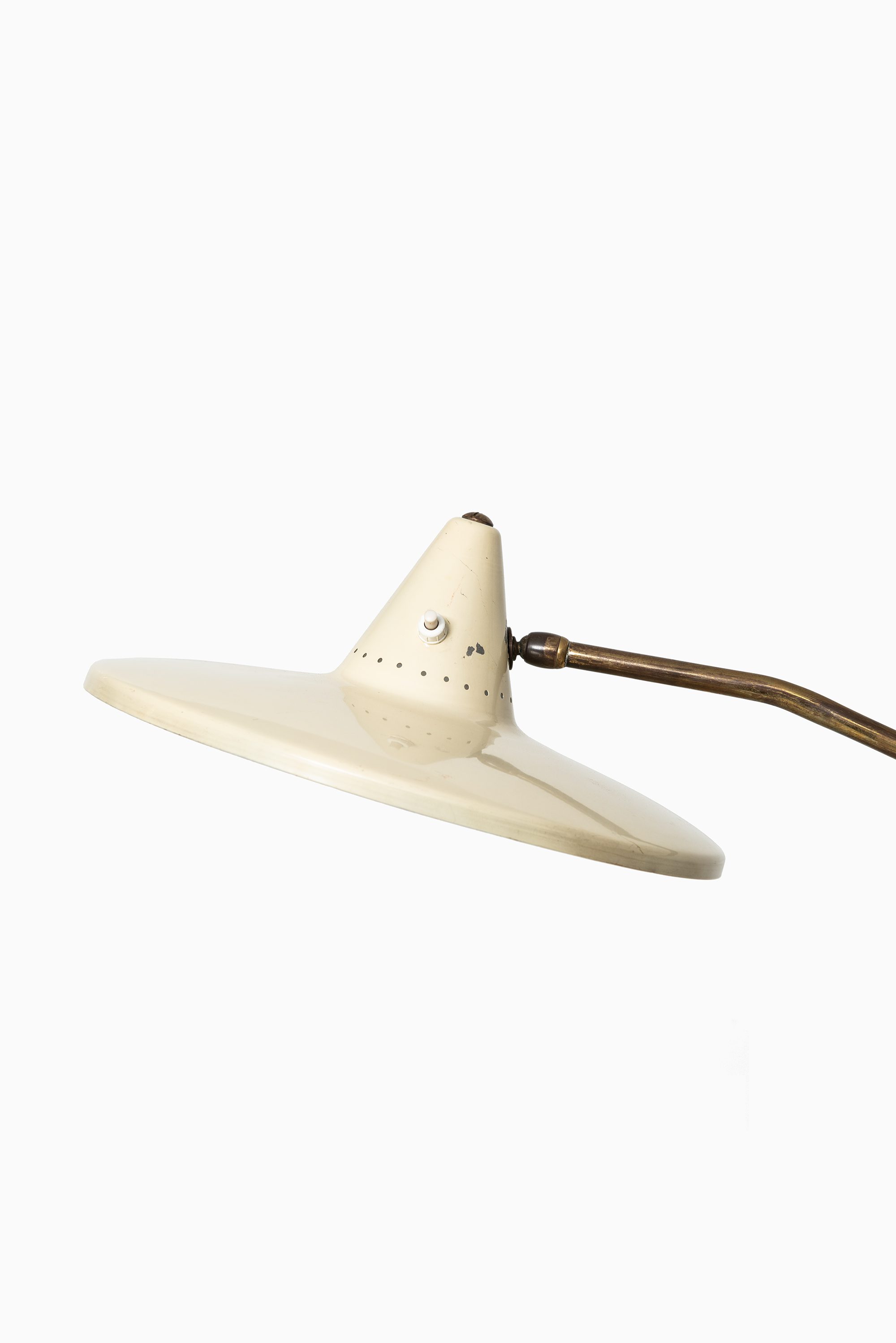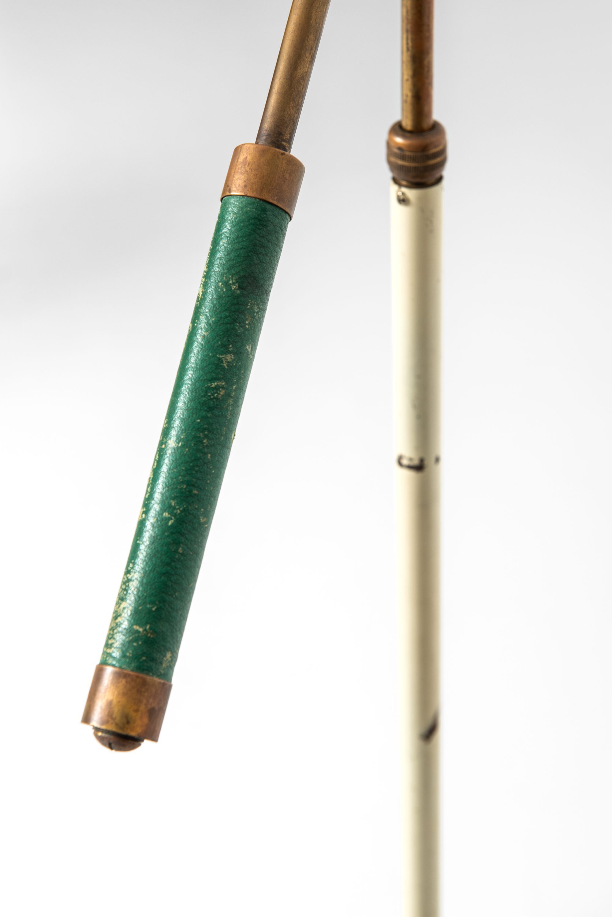 The design features an elegantly balanced structure with an adjustable arm, allowing for directional light. The conical lacquered metal shade is paired with brass fittings, while the counterweight handle is wrapped in green leather, adding both grip and a contrasting texture. The stem rests on a circular brass base with visible patina, typical of its age, and contributes to the stability of the piece. The lacquer has aged to a warm off-white tone, showing minor wear consistent with use and time. These traces of usage add authenticity and reflect the lamp’s history.