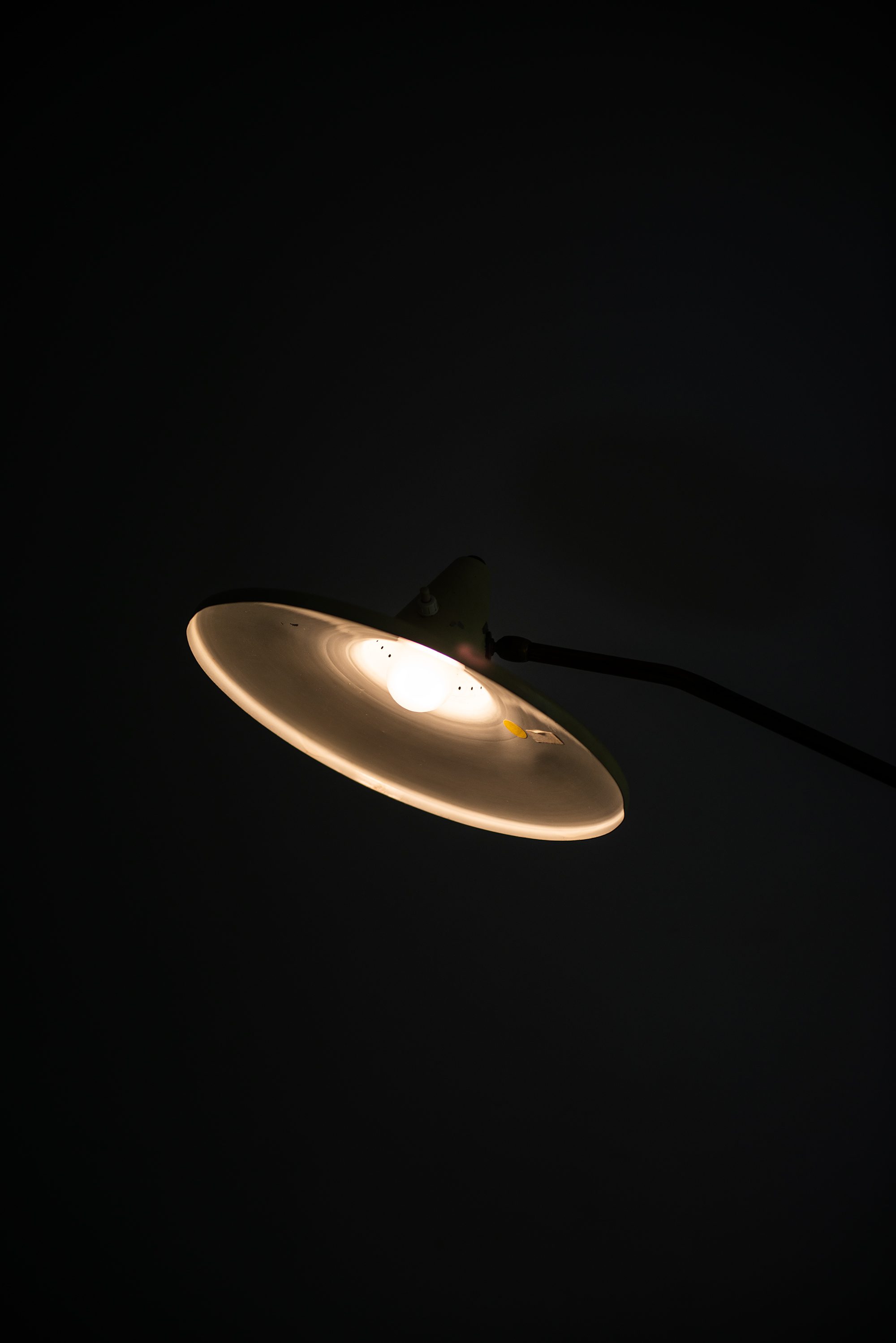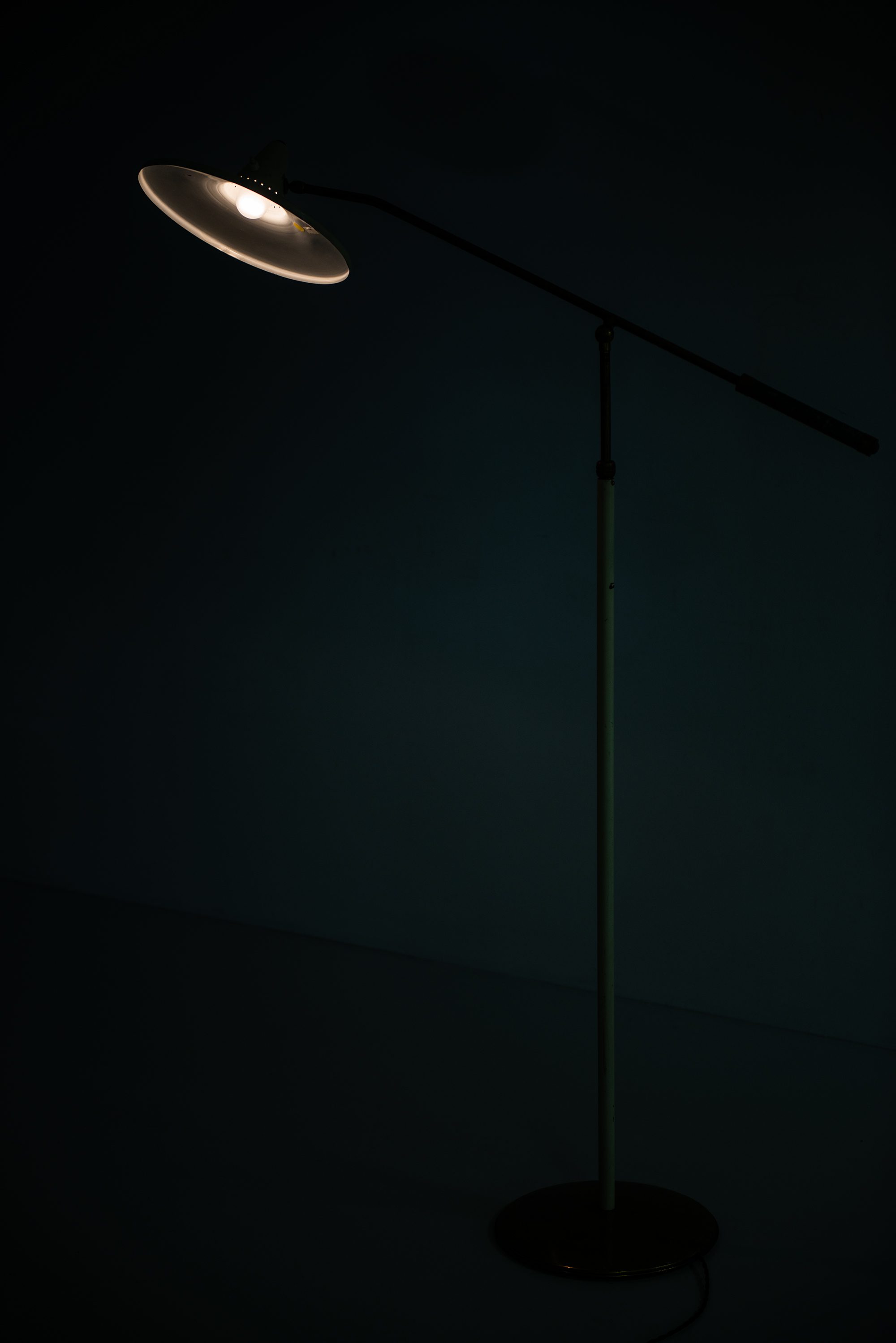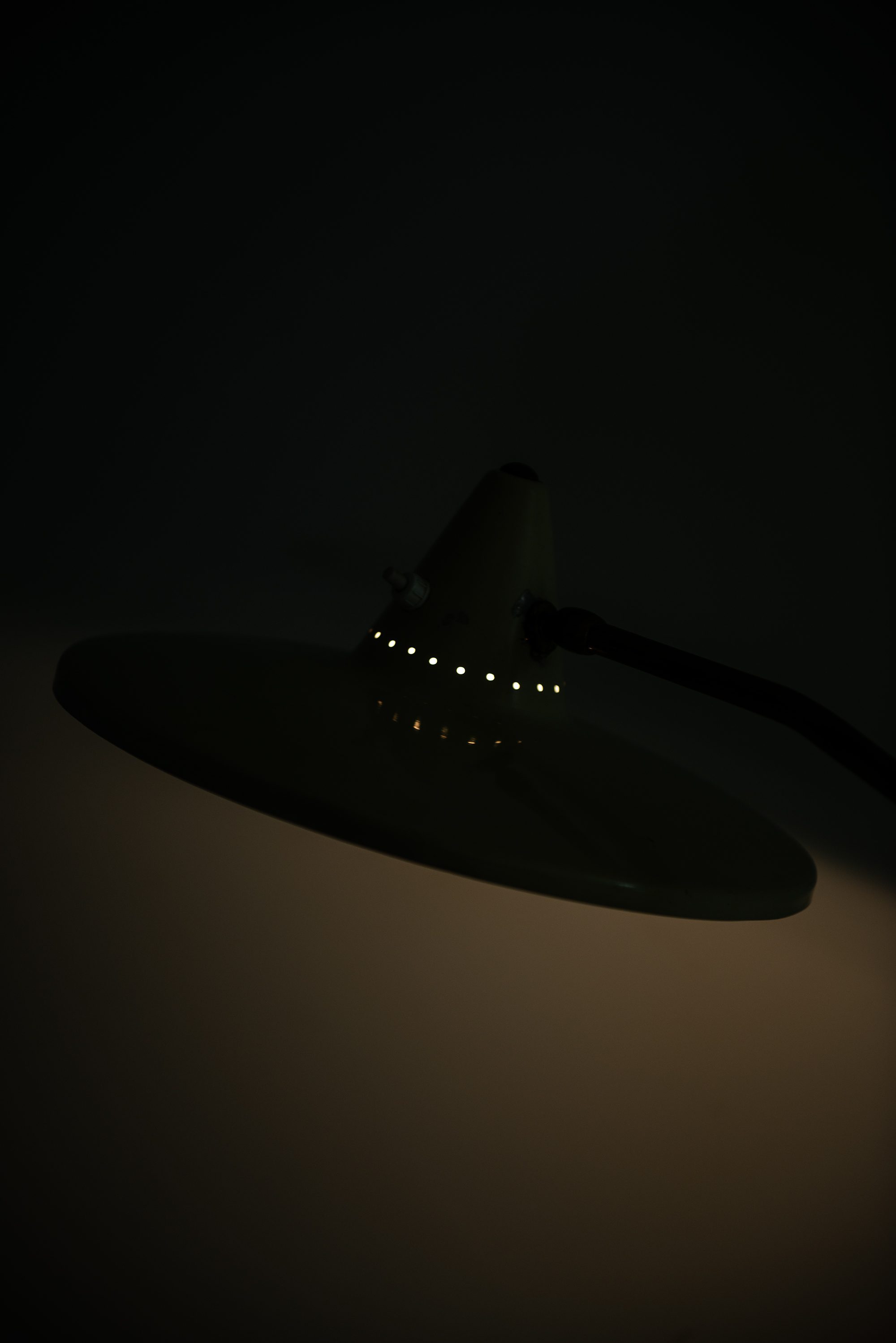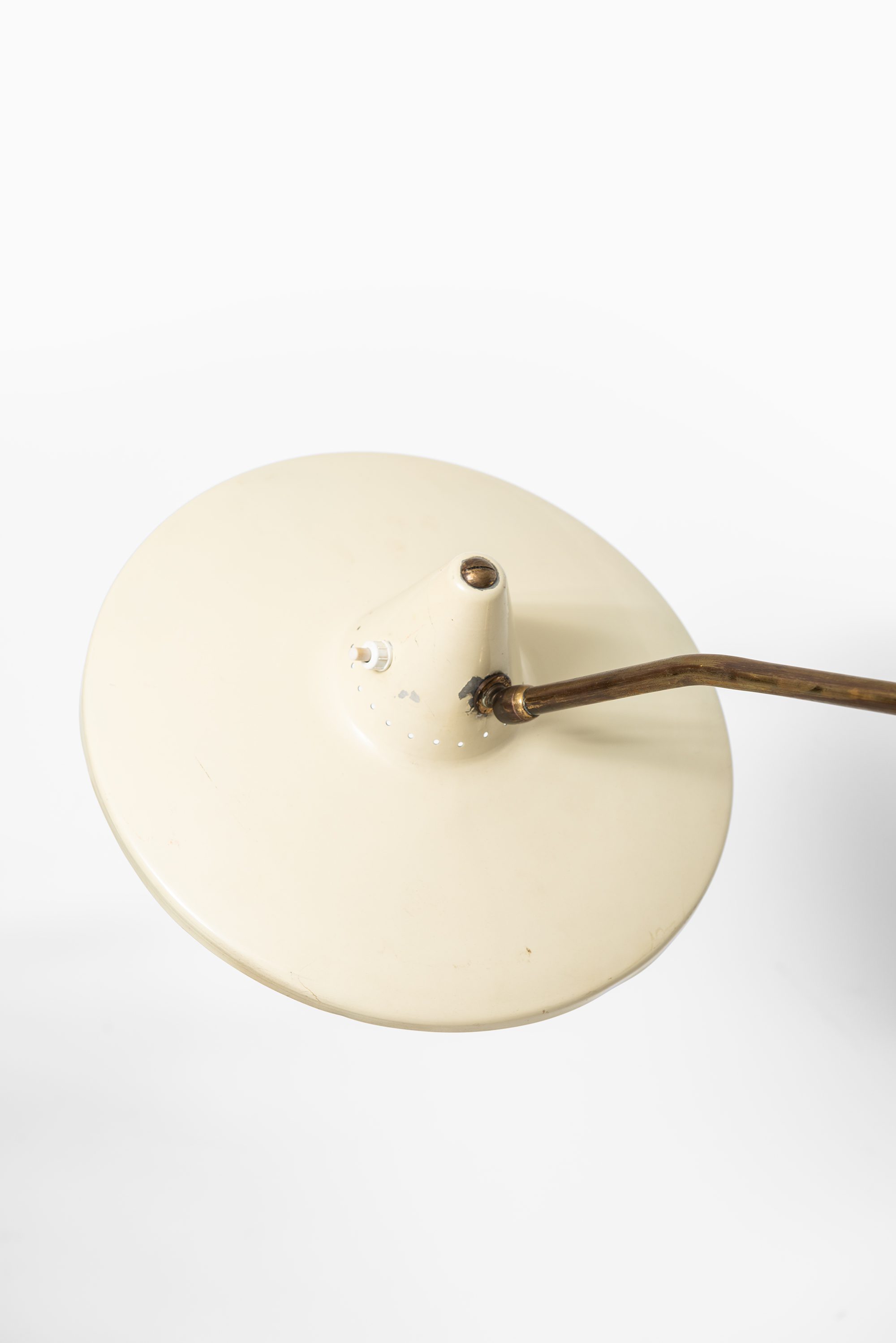 The design features an elegantly balanced structure with an adjustable arm, allowing for directional light. The conical lacquered metal shade is paired with brass fittings, while the counterweight handle is wrapped in green leather, adding both grip and a contrasting texture. The stem rests on a circular brass base with visible patina, typical of its age, and contributes to the stability of the piece. The lacquer has aged to a warm off-white tone, showing minor wear consistent with use and time. These traces of usage add authenticity and reflect the lamp’s history.
