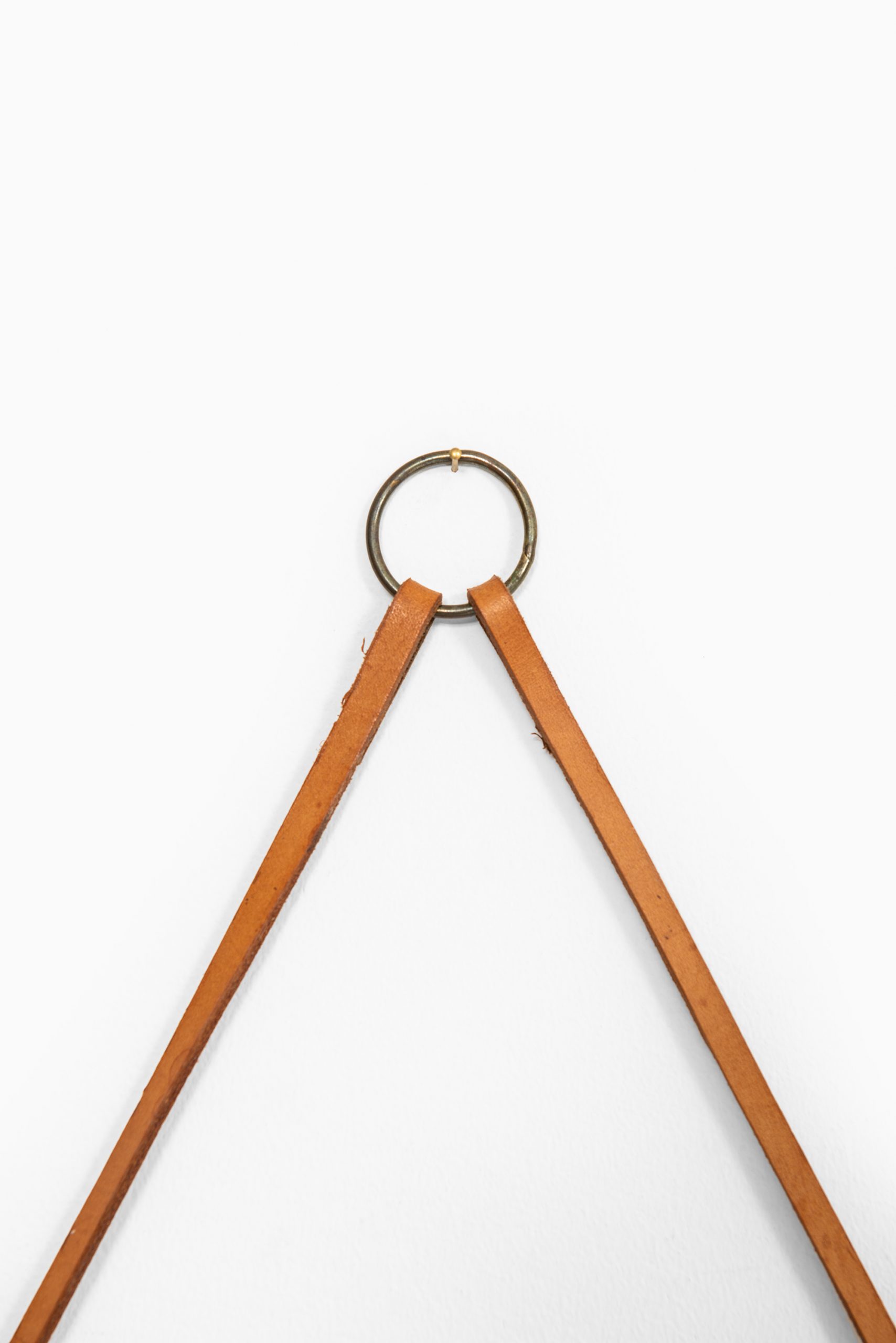 A defining element of this mirror is its integrated leather hanging strap, which attaches to a brass ring at the top. The strap is looped through the outer rim of the frame and secured with brass hardware, allowing the mirror to hang freely while introducing a subtle yet functional decorative detail. The brass and leather components have developed a mild patina, enhancing the authenticity of the piece and reflecting its vintage status.