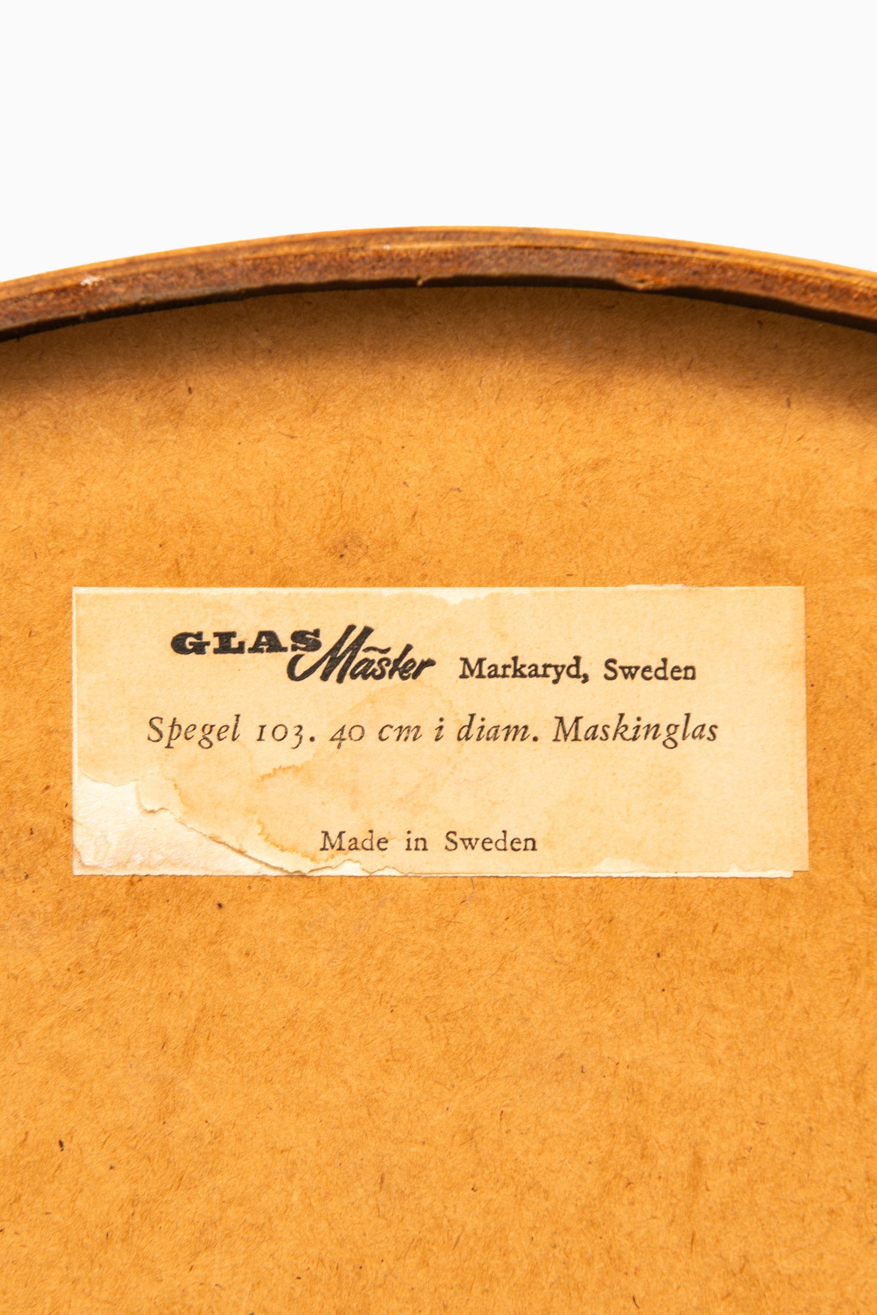 Glas Mäster of Markaryd was a regional Swedish glass and mirror producer active during the mid-20th century, contributing to the broader Scandinavian design movement with objects that emphasized utility, honest materials, and understated elegance. This mirror, labeled with the original manufacturing tag, was marketed as “Spegel 103” with a 40 cm diameter and made using maskinglas, a term used for high-quality mirror glass.