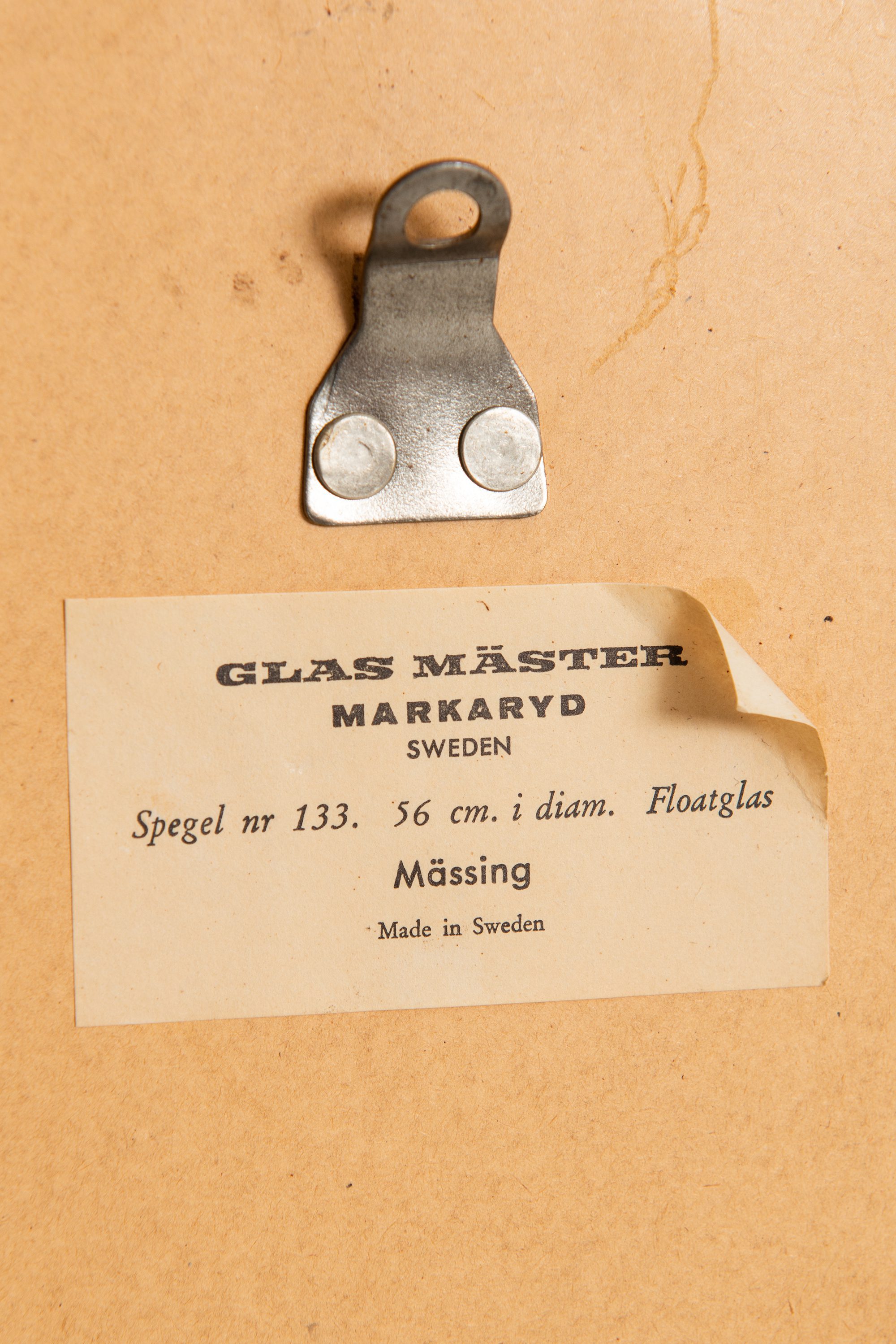 This is a pair of circular wall mirrors produced in the 1960s by Glas Mäster, a glassworks located in Markaryd, Sweden. Each mirror belongs to model number 133 and is constructed using float glass and a brass frame, typical of Scandinavian mid-century craftsmanship.