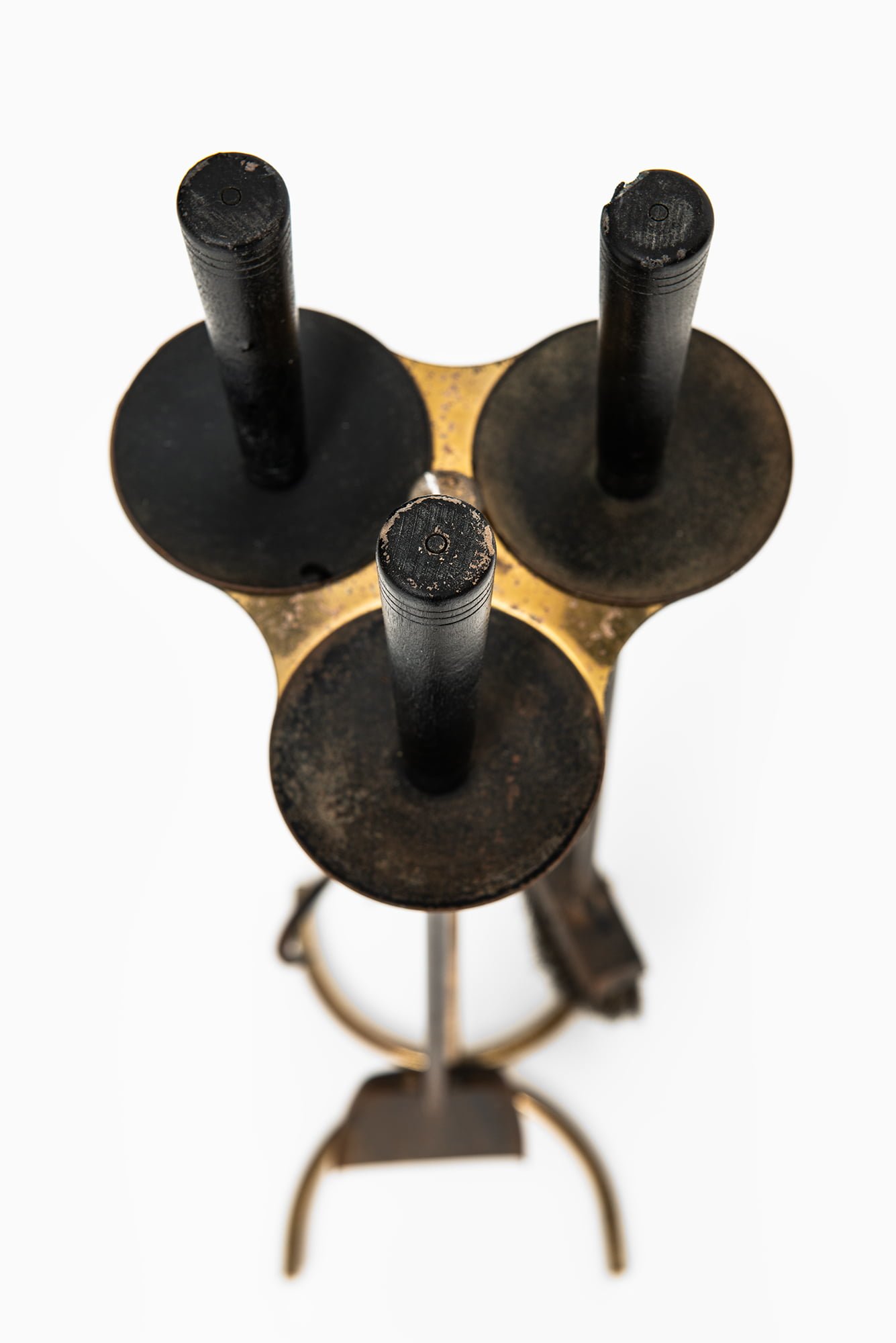 The set consists of a standing frame with accompanying tools, executed in a combination of brass, iron, and wood. The central stand is formed from slender brass rods with a softly curved, three-legged base that provides stability while maintaining a light visual presence. The brass has developed a warm, uneven patina with darker spotting and oxidation, giving the surface a rich, time-earned character. The tools are made of iron with darkened surfaces and visible wear, while the handles are finished in black-stained wood with a slightly tapered cylindrical shape.