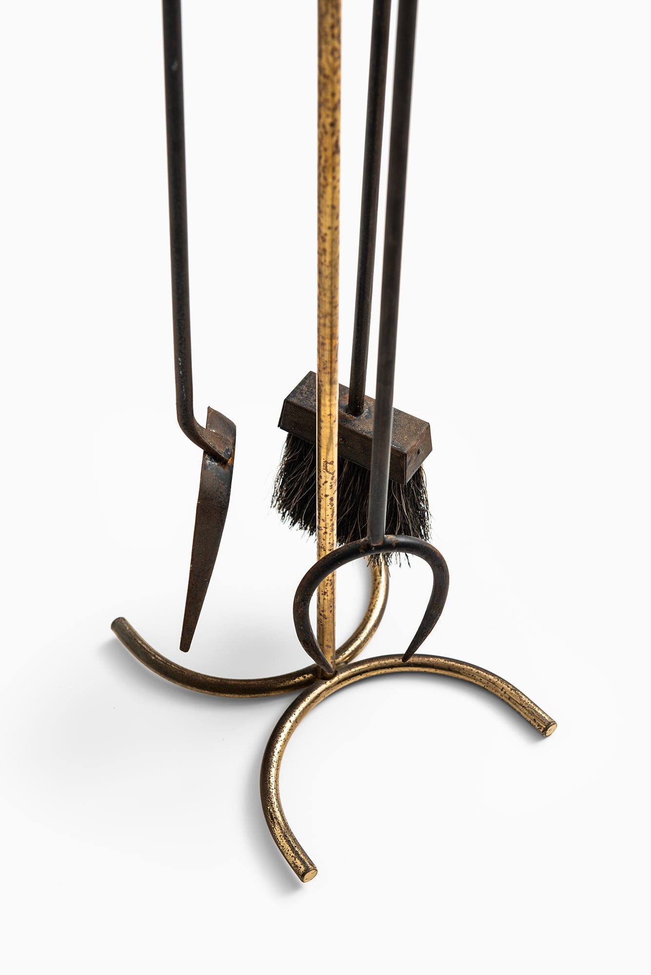 The individual elements include a poker, shovel, and brush, each hanging freely from the stand. The brush features dark natural bristles set into a rectangular wooden block, showing clear signs of use. The iron components display surface rust and wear consistent with prolonged functional use near a fireplace, while remaining structurally intact. The contrast between the golden brass, dark iron, and blackened wood creates a restrained yet expressive material palette typical of Scandinavian mid-century design.