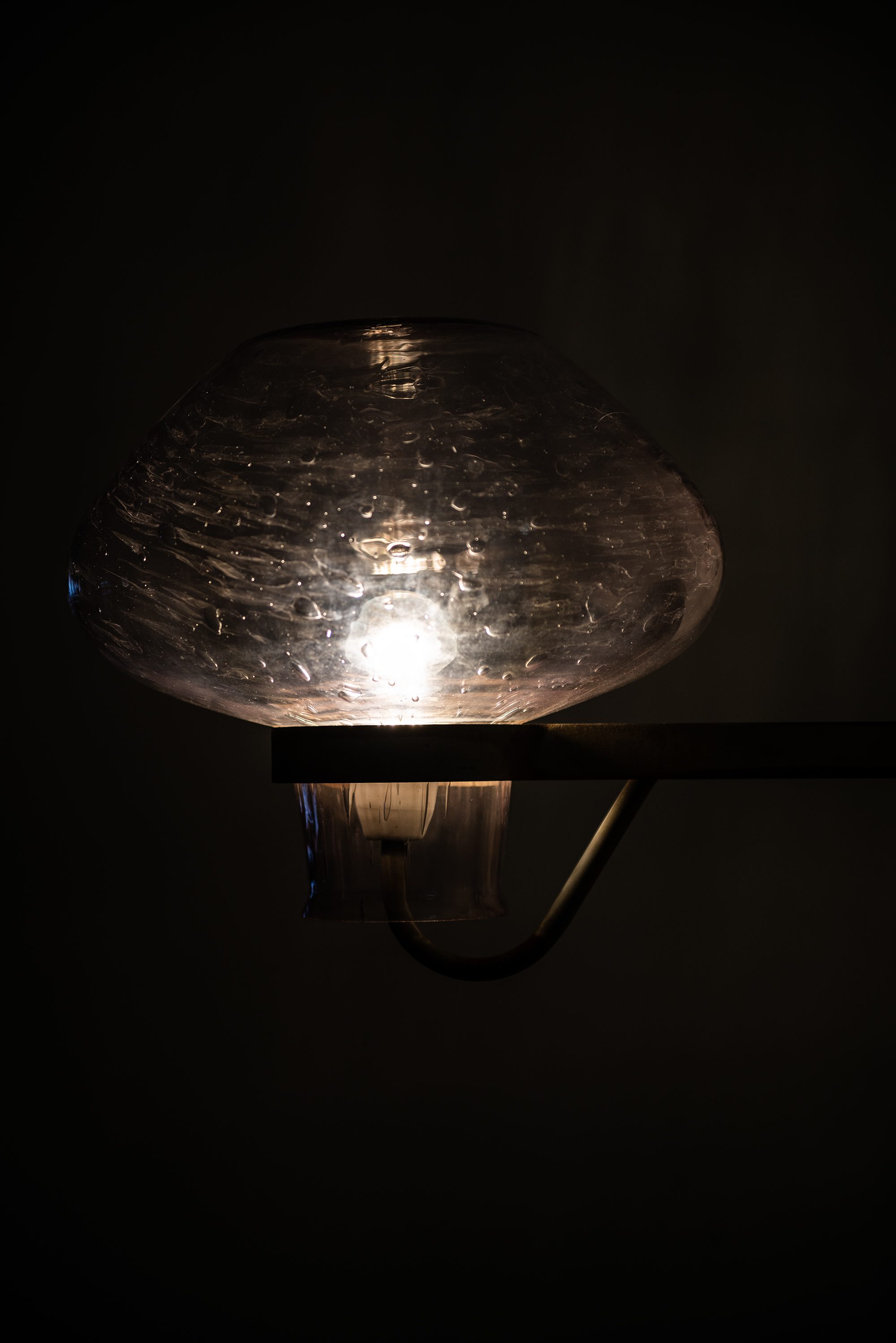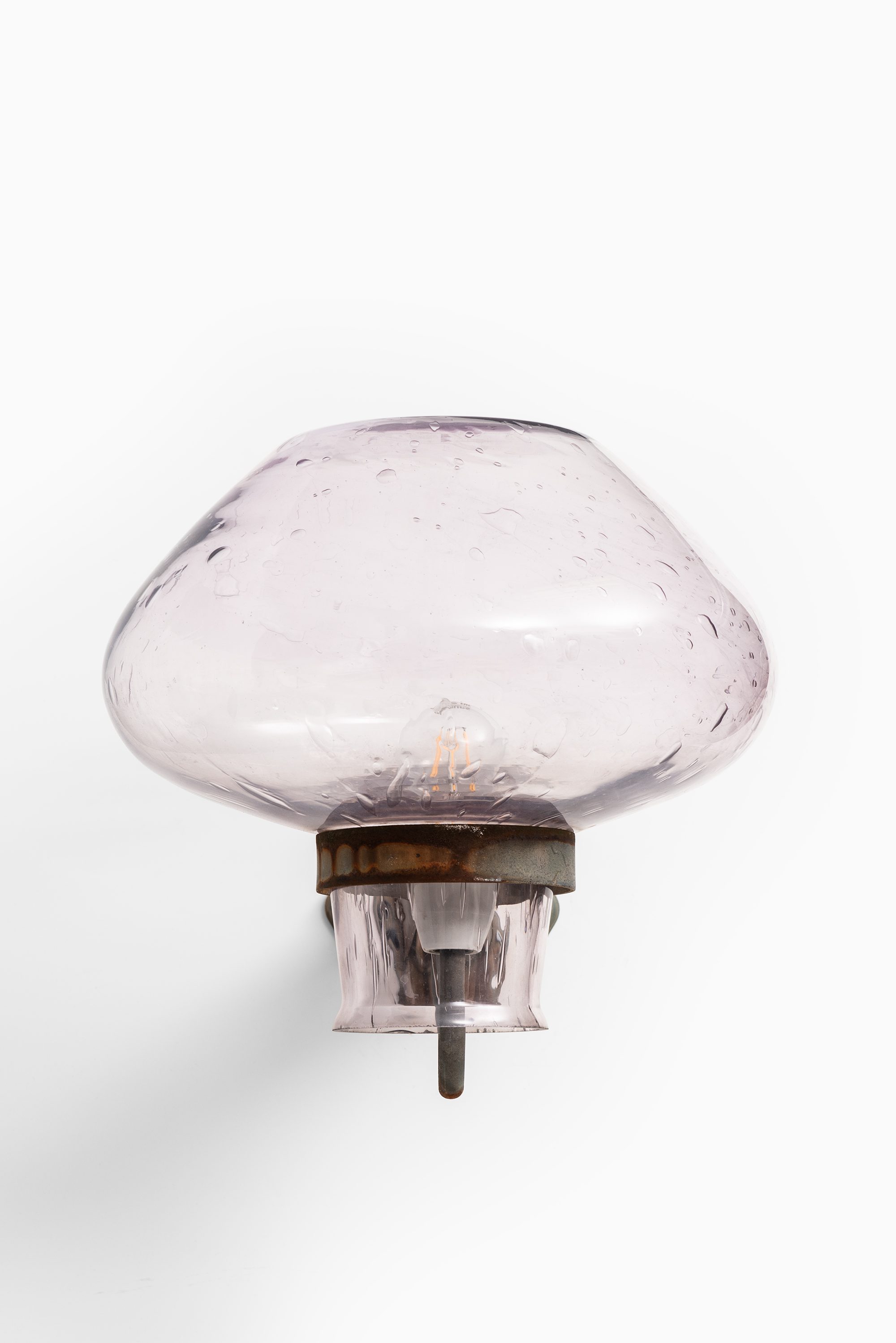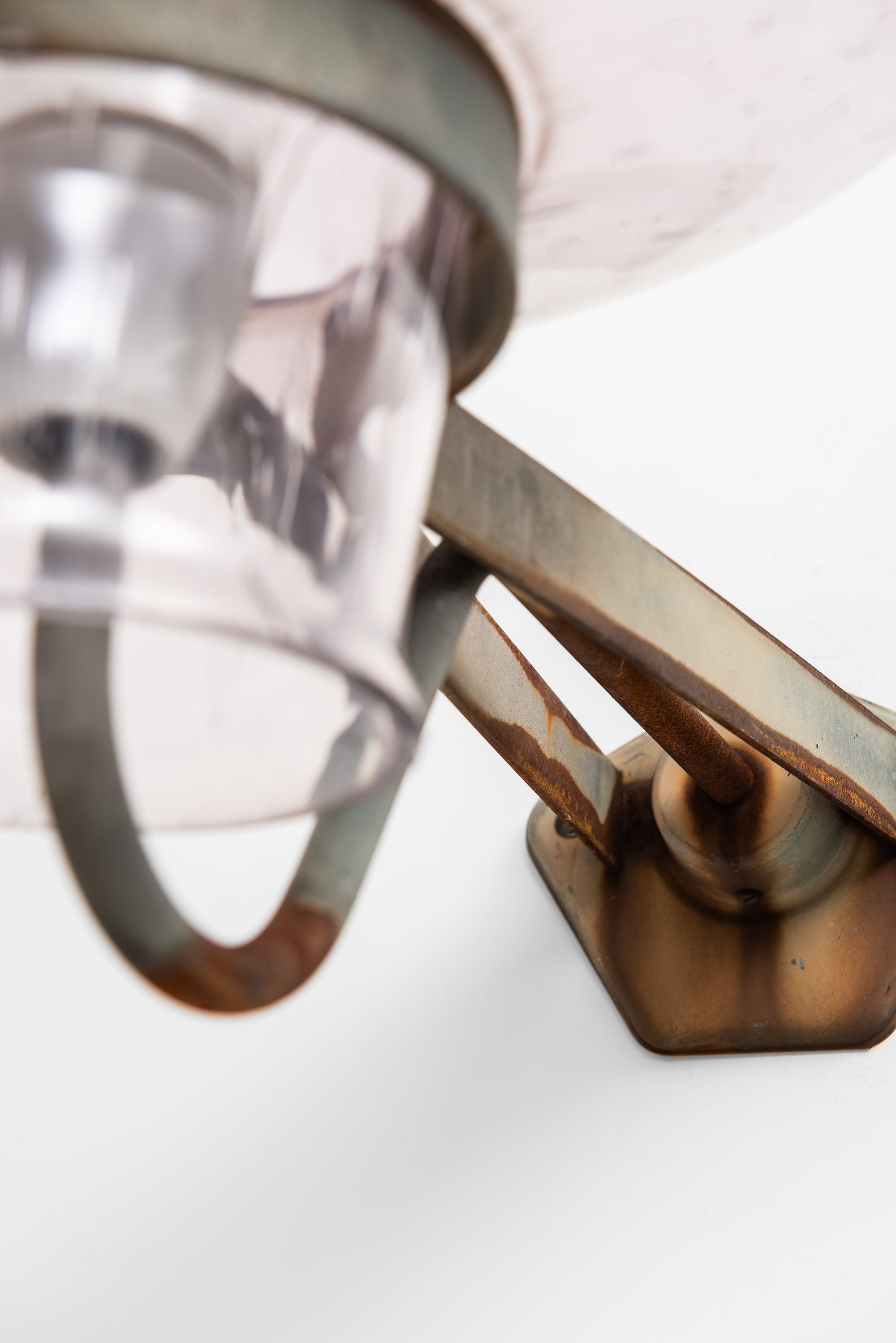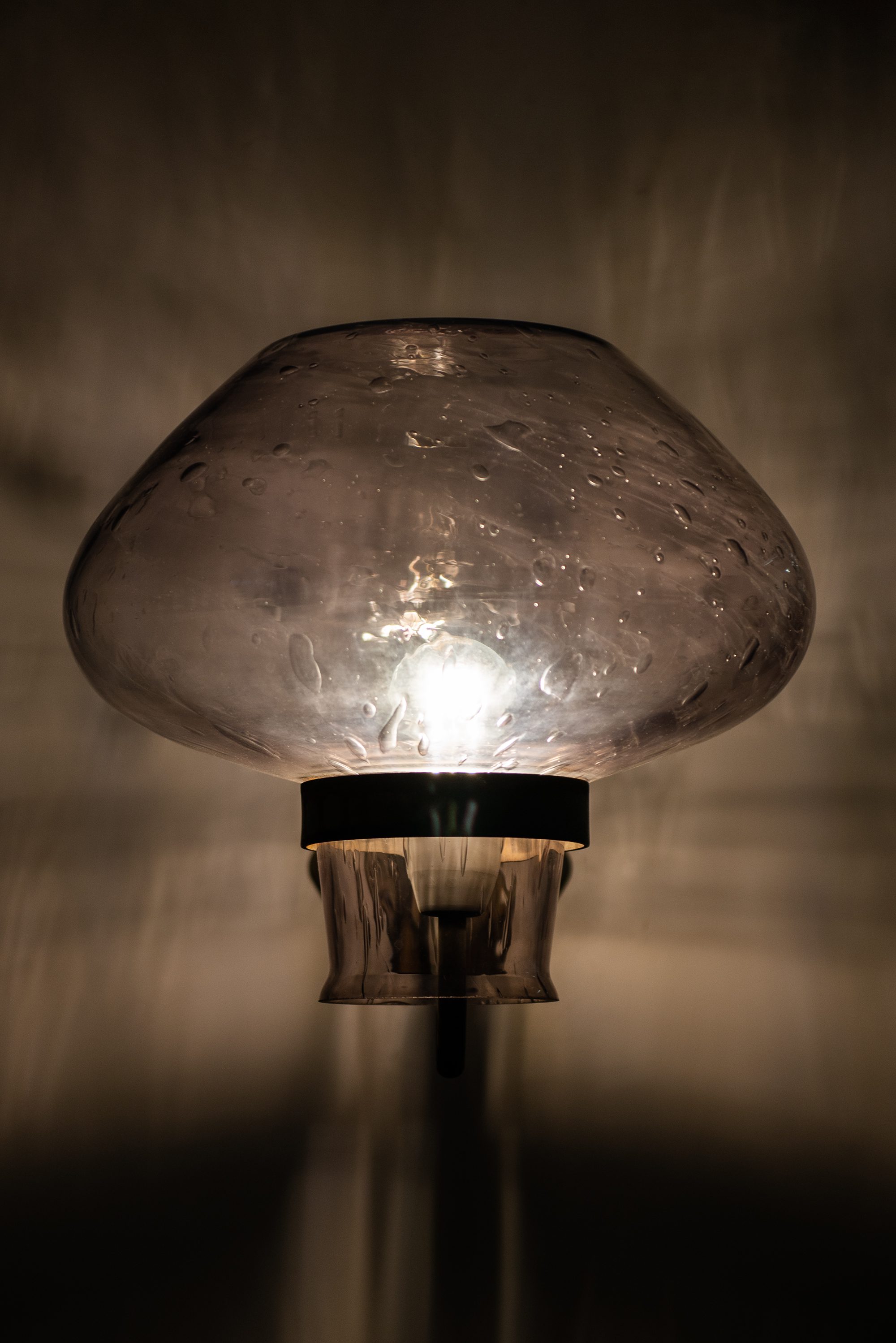 The steel wall bracket has a geometric, hexagonal backplate and a gently curved arm that supports the bulb housing and shade. Over time, the metal has developed a distinctive patina, reflecting both its age and original outdoor use. The interplay between the industrial character of the steel and the sculptural, fluid form of the glass embodies the Scandinavian modernist ideal of balancing functionality with material beauty.