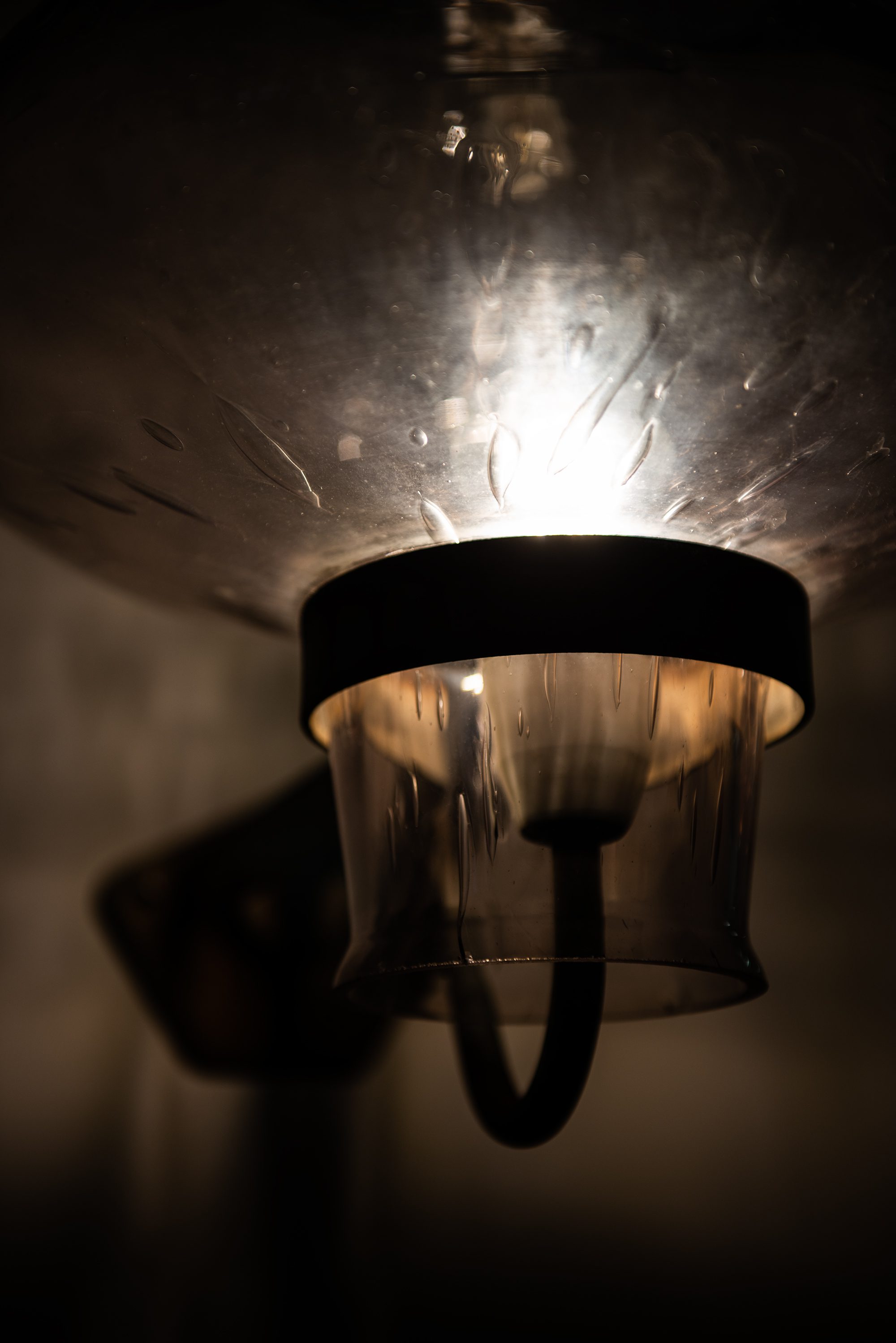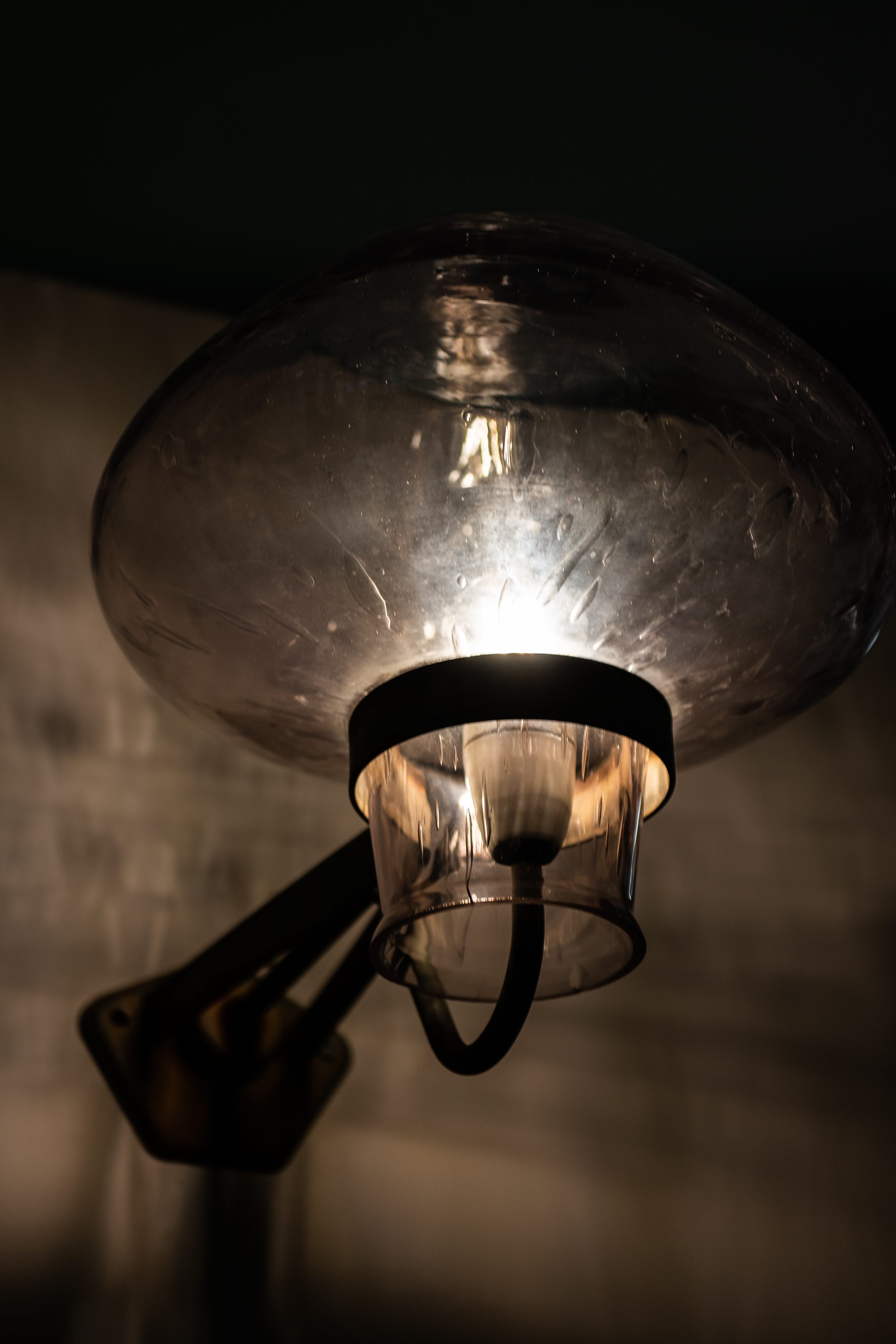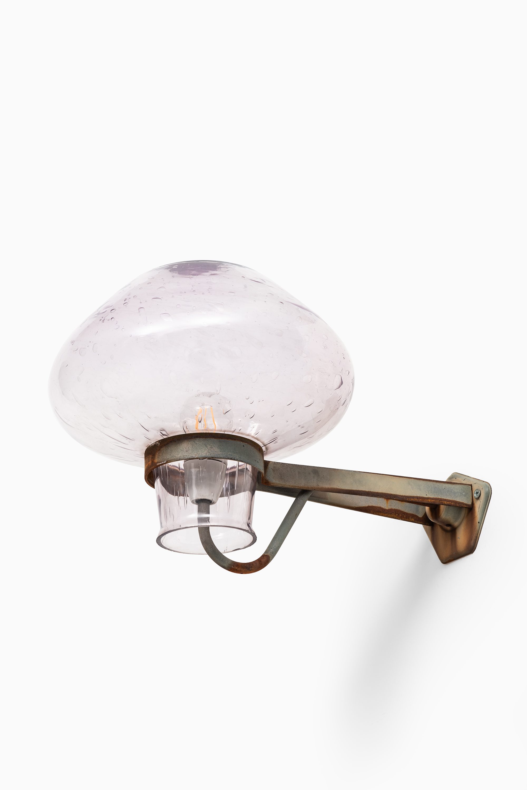 This rare and large outdoor wall lamp was designed by the influential Swedish architect Gunnar Asplund and produced by ASEA in Sweden during the 1940s. It is a significant example of early modern Scandinavian lighting design, combining a functionalist approach with architectural precision. The lamp features a robust steel structure paired with a large, organic mouth-blown glass shade. The glass has a soft, irregular form with subtle curvature and natural air bubbles, characteristic of traditional glassblowing techniques. Its slightly tinted, translucent surface diffuses light gently while showcasing the artisanal craftsmanship behind its production.