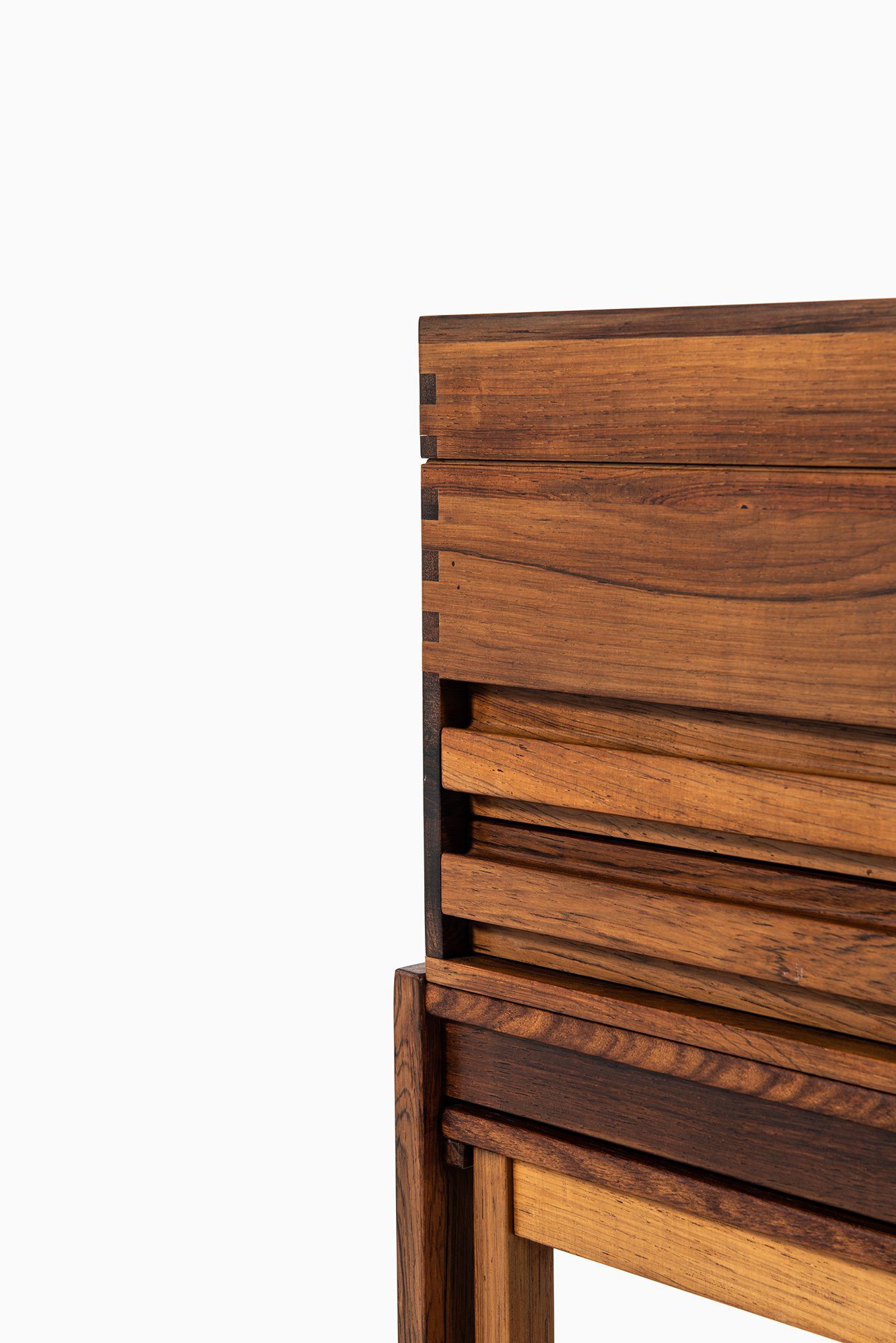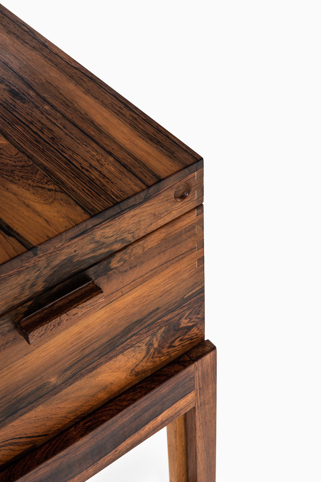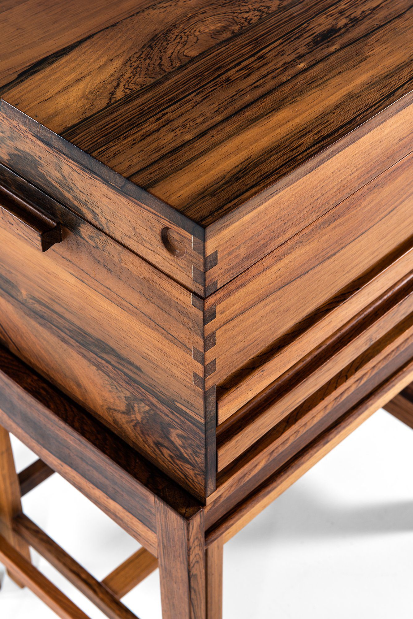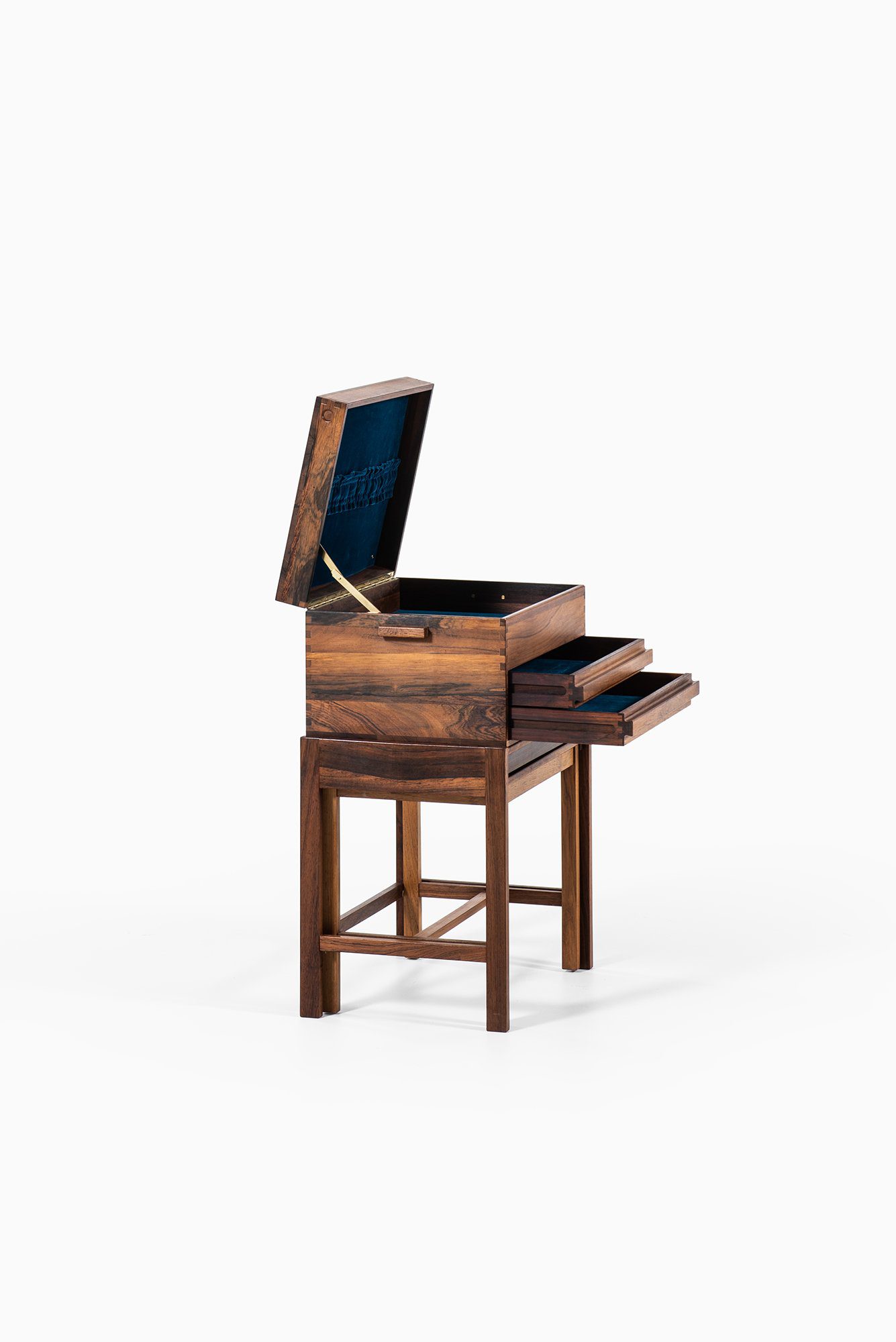 This rare side table with integrated storage box was designed by Gunnar Myrstrand and produced by Källemo in Sweden during the 1960s. The piece is executed in rosewood, exhibiting a vivid and expressive grain with alternating dark brown, warm reddish, and near-black streaks. The natural variation of the wood is consistently used across the surfaces, giving the object a cohesive yet visually dynamic appearance.