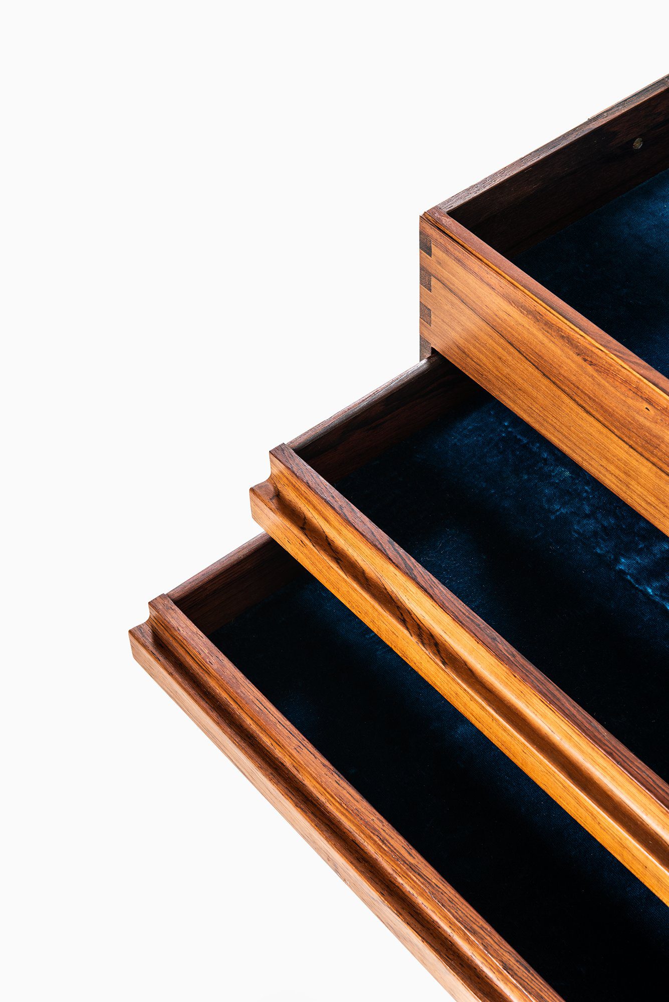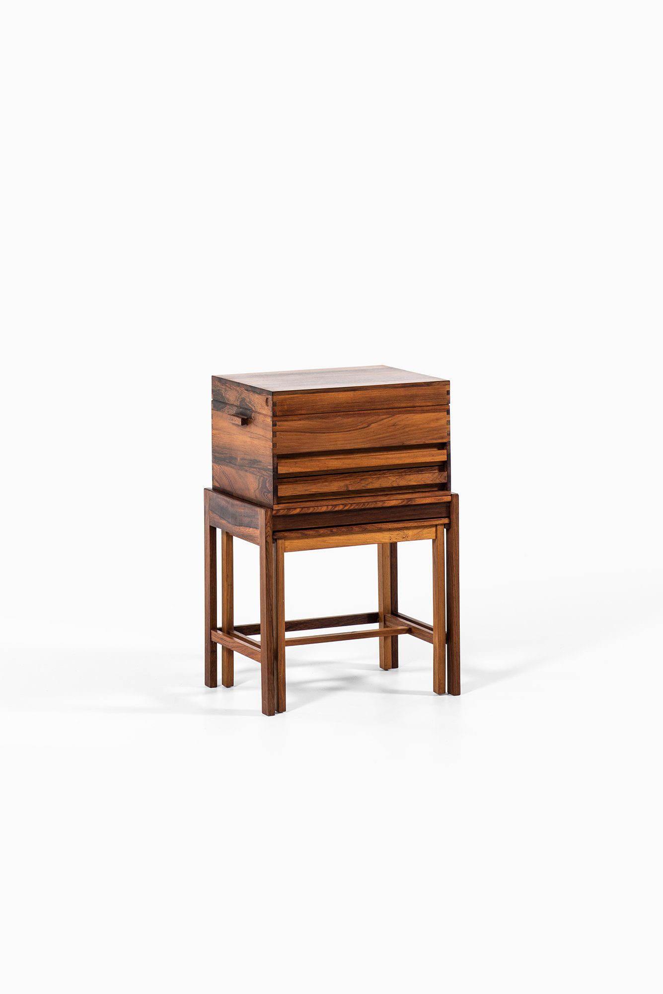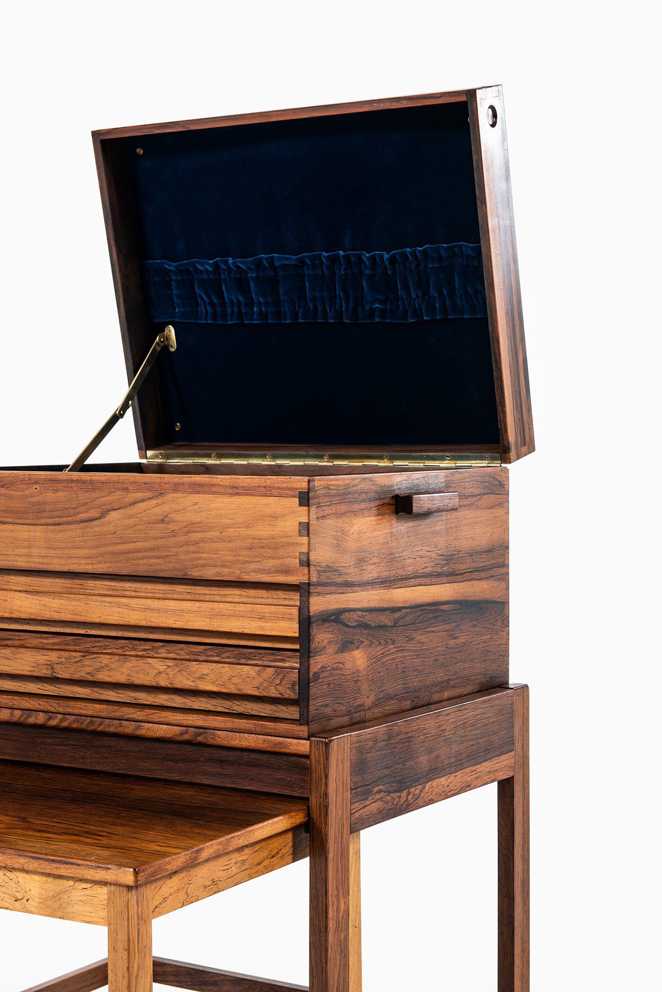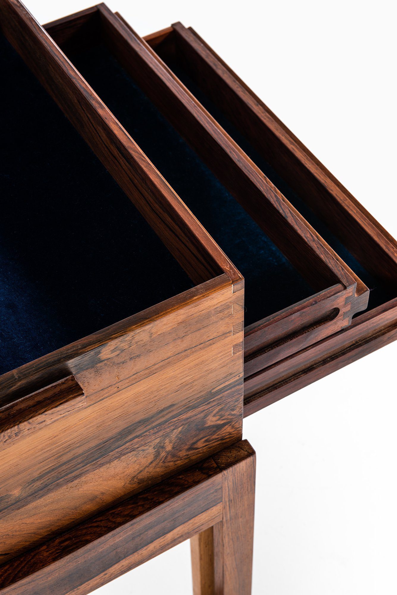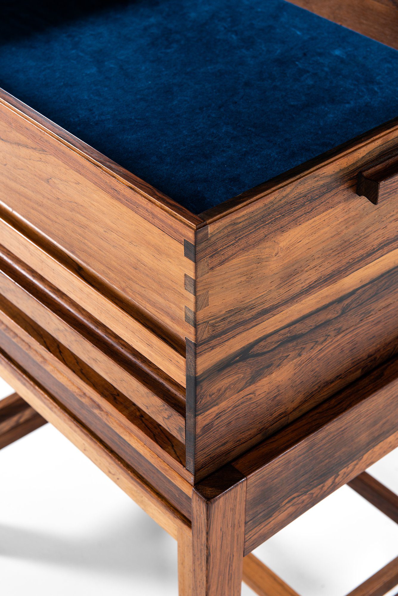 This rare side table with integrated storage box was designed by Gunnar Myrstrand and produced by Källemo in Sweden during the 1960s. The piece is executed in rosewood, exhibiting a vivid and expressive grain with alternating dark brown, warm reddish, and near-black streaks. The natural variation of the wood is consistently used across the surfaces, giving the object a cohesive yet visually dynamic appearance.