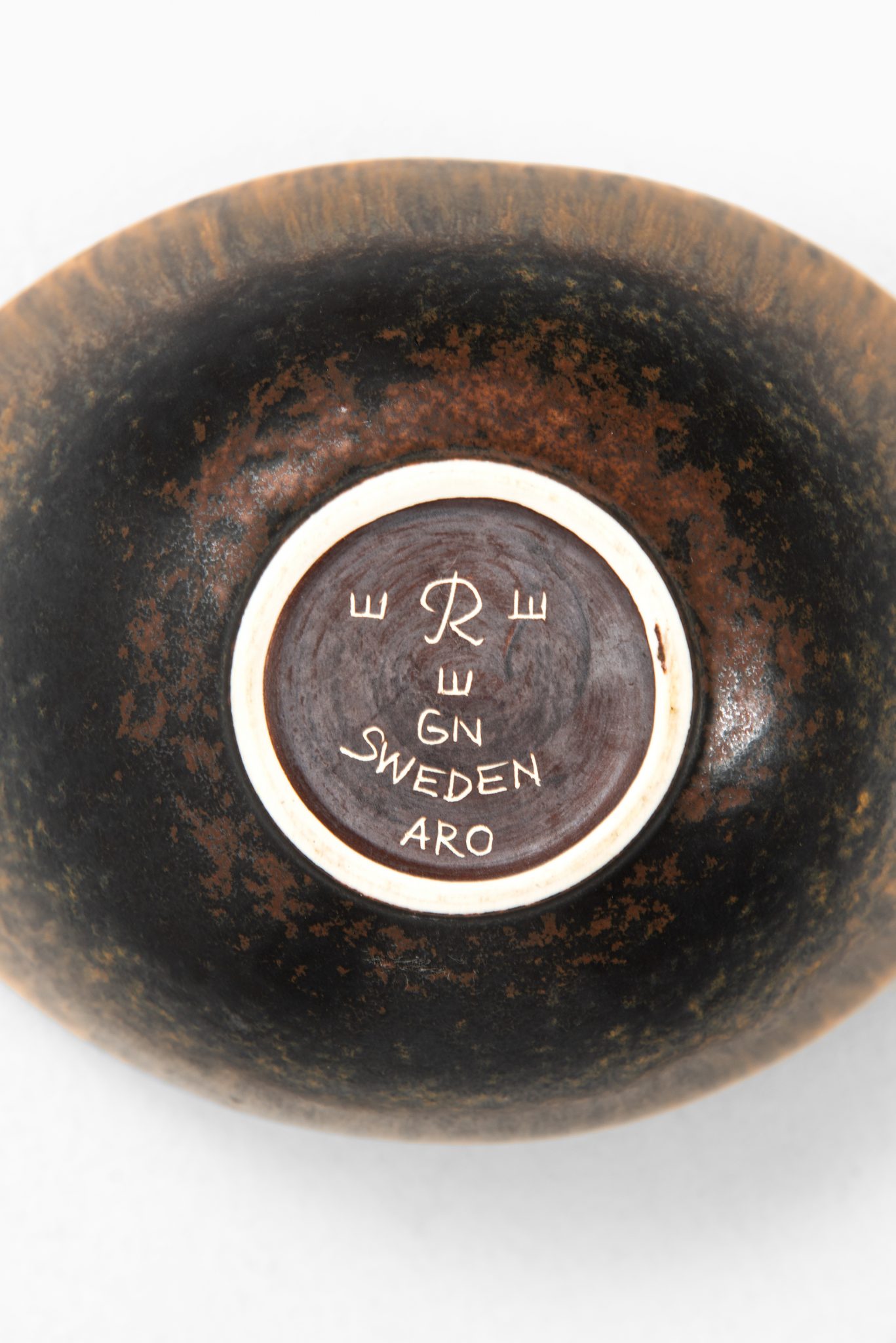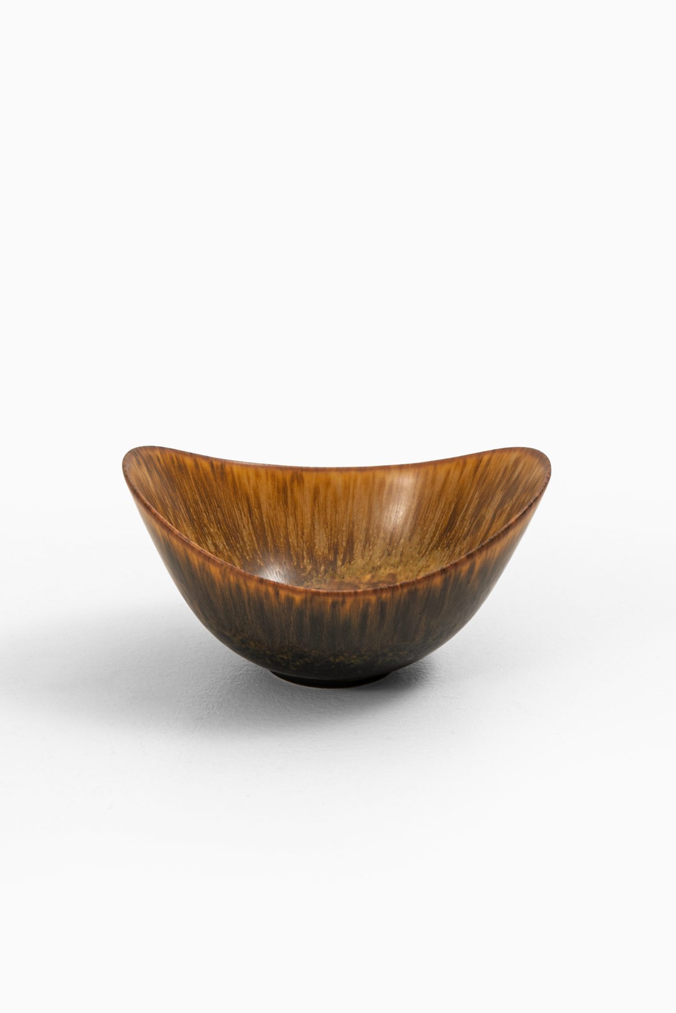 This is a ceramic bowl, model ARO, designed by Gunnar Nylund and produced by Rörstrand in Sweden during the 1960s. The bowl is characterized by its asymmetrical organic form with a gently flared rim that curves upward at opposing ends. The body of the bowl is shallow and elliptical, tapering elegantly down to a small circular foot that provides subtle elevation and stability.