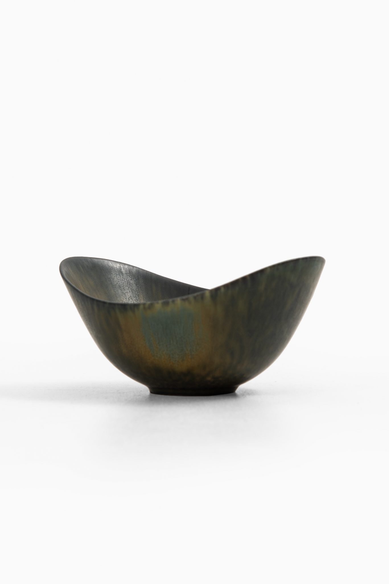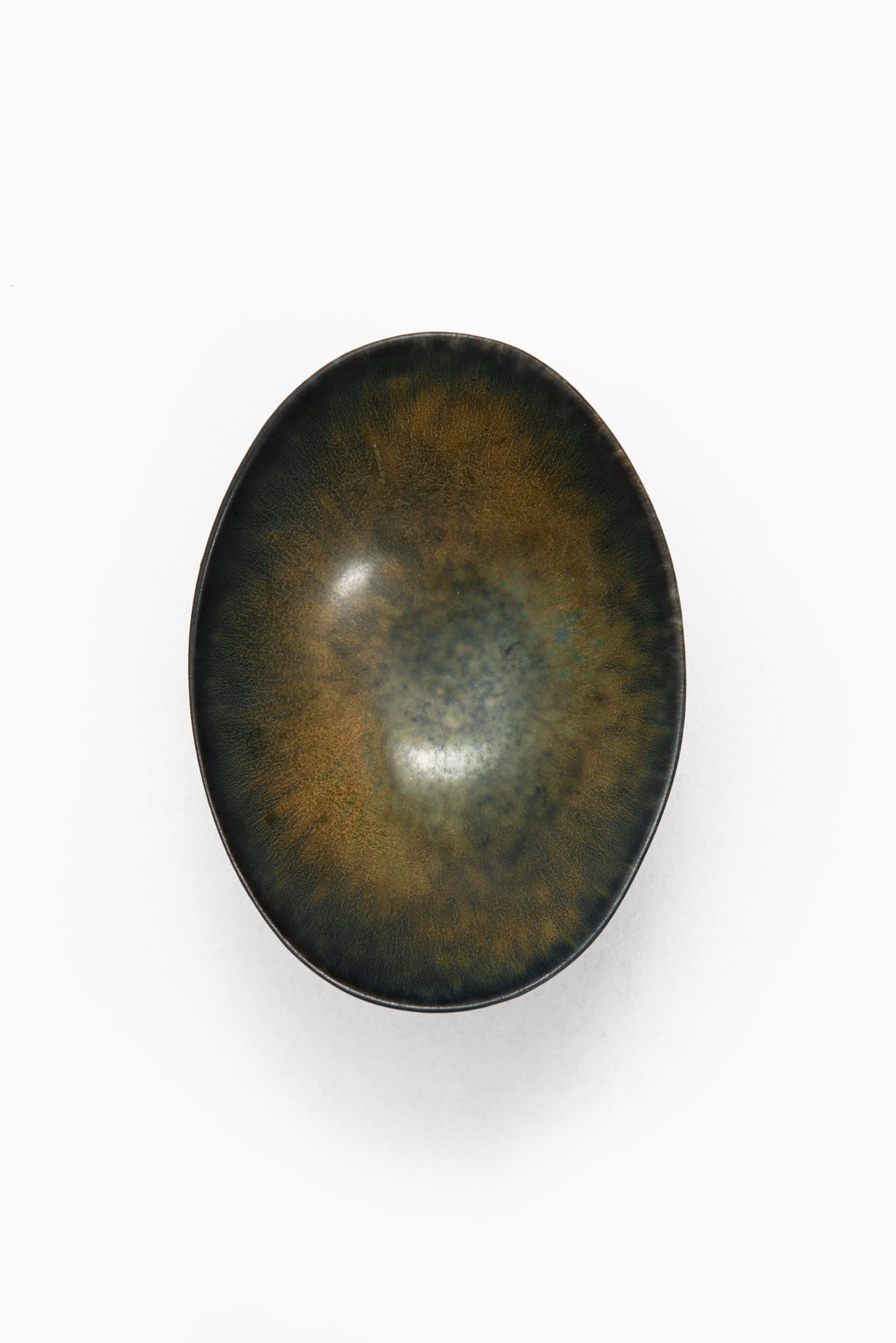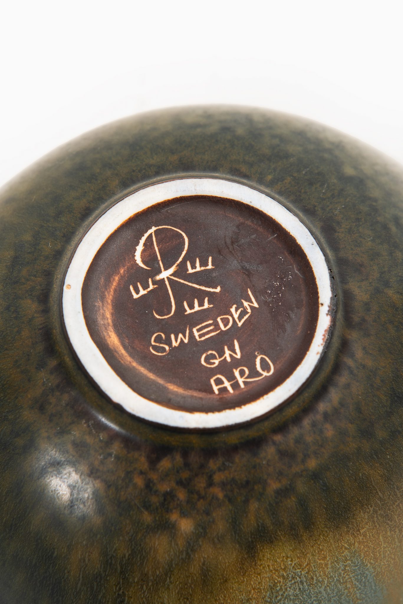 The glaze on this piece is rendered in deep moss green and earth tones, blending into an almost smoky, iridescent brown toward the base. The surface is animated by a finely speckled pattern that radiates inward toward the center, where the glaze deepens into darker, almost charcoal-like hues with greenish-blue undertones. This tonal interplay creates a sense of optical texture and depth, a signature of Nylund’s refined glazing techniques. The outer surface mirrors this variegation with subtle vertical movement and a smooth, semi-gloss finish. The base of the piece is marked with the Rörstrand hallmark, the three-crown emblem, and the model identifier “ARO” along with Gunnar Nylund’s monogram “GN”.