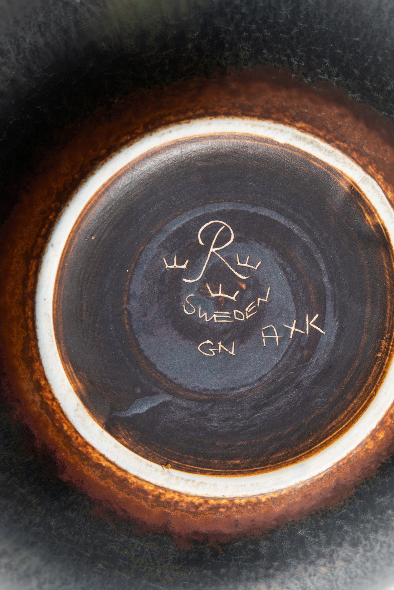The surface features a complex glaze in shades of dark brown, black, and ochre, producing a mottled, almost metallic effect that varies subtly across the curved form. The interior transitions from deep umber tones at the rim to a lighter, luminous center, highlighting the depth of the glaze. The base is inscribed with the Rörstrand mark, the three crowns of Sweden, and the designer’s initials GN along with the model code AXK.