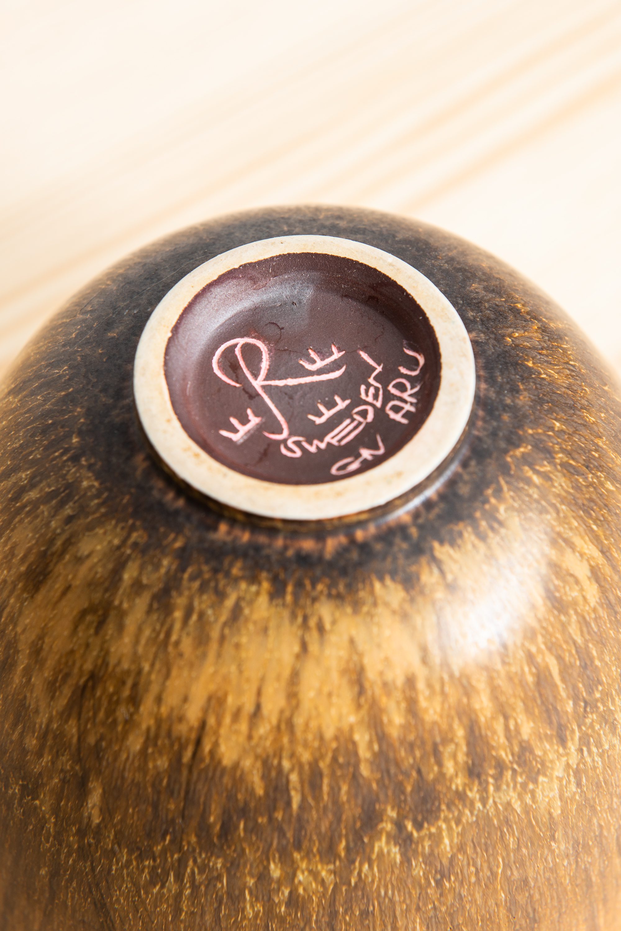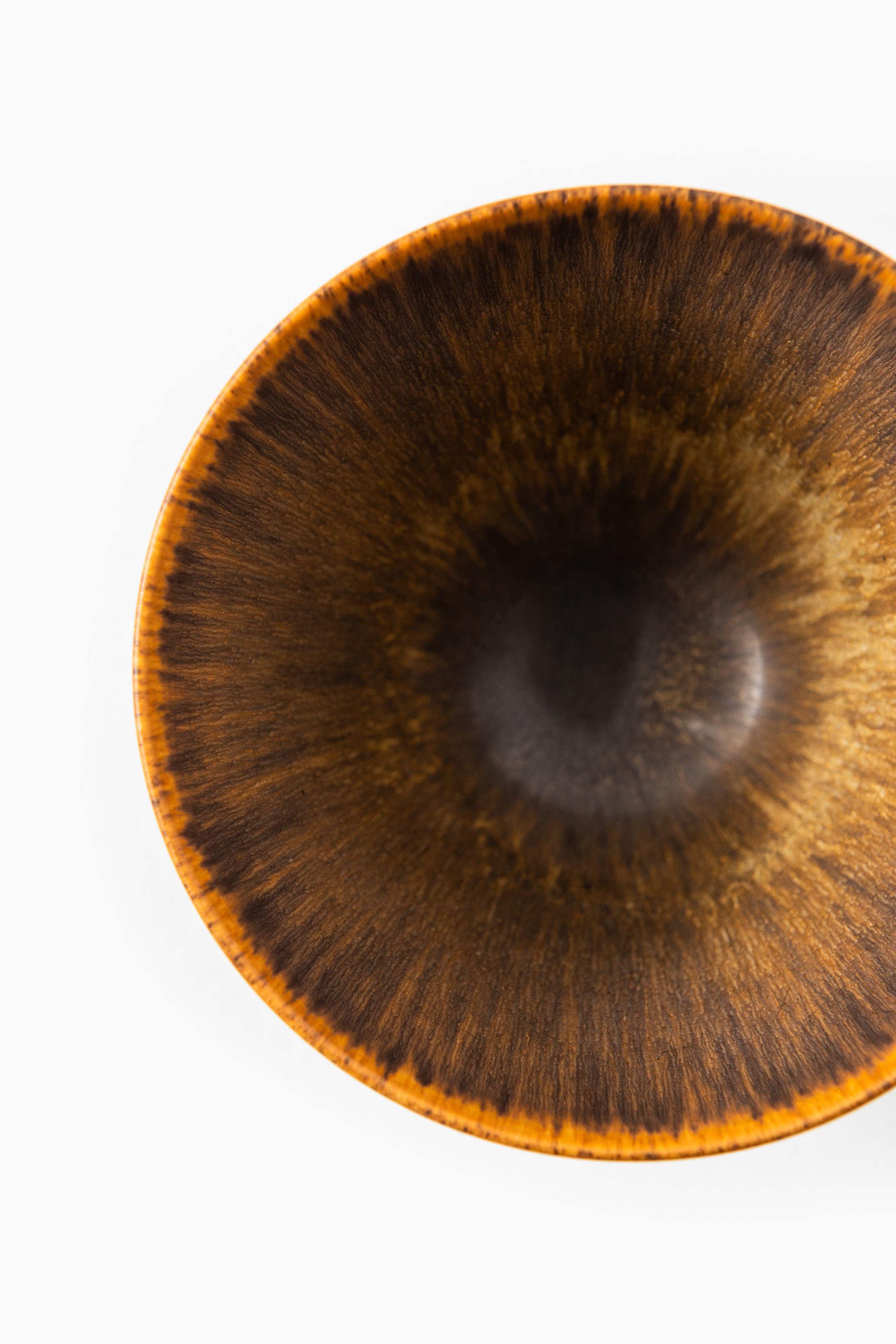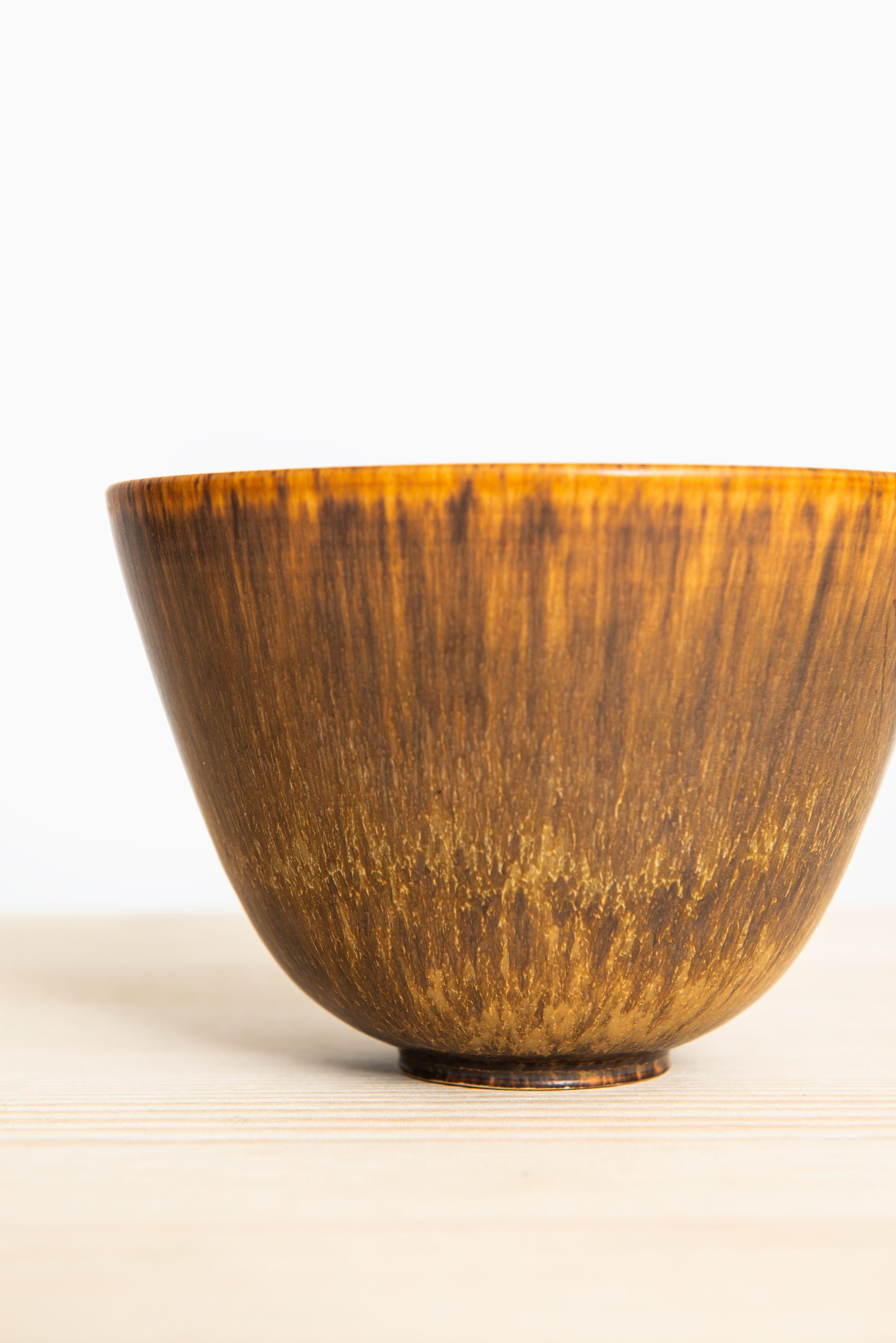 The bowl features a gently curved, rounded profile that tapers towards a small circular foot, creating a balanced and elegant silhouette. Its surface is finished in a rich, textured glaze that transitions from deep brown to warm golden hues, reminiscent of natural wood or animal fur. This nuanced, almost organic finish is typical of Nylund’s approach, where glaze becomes an integral part of the form rather than mere decoration. The interior reflects a slightly lighter tone, providing subtle contrast and enhancing the vessel’s depth.