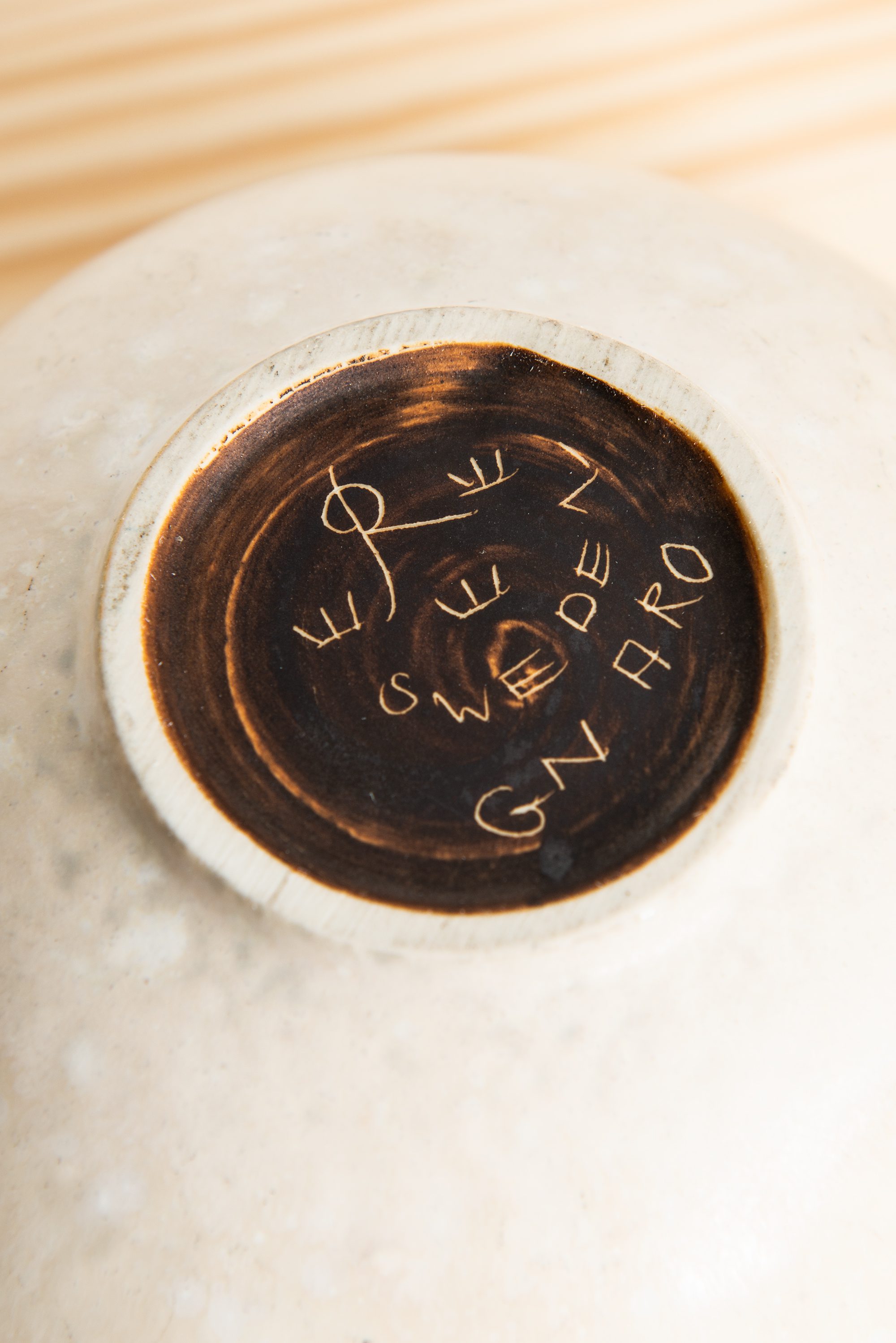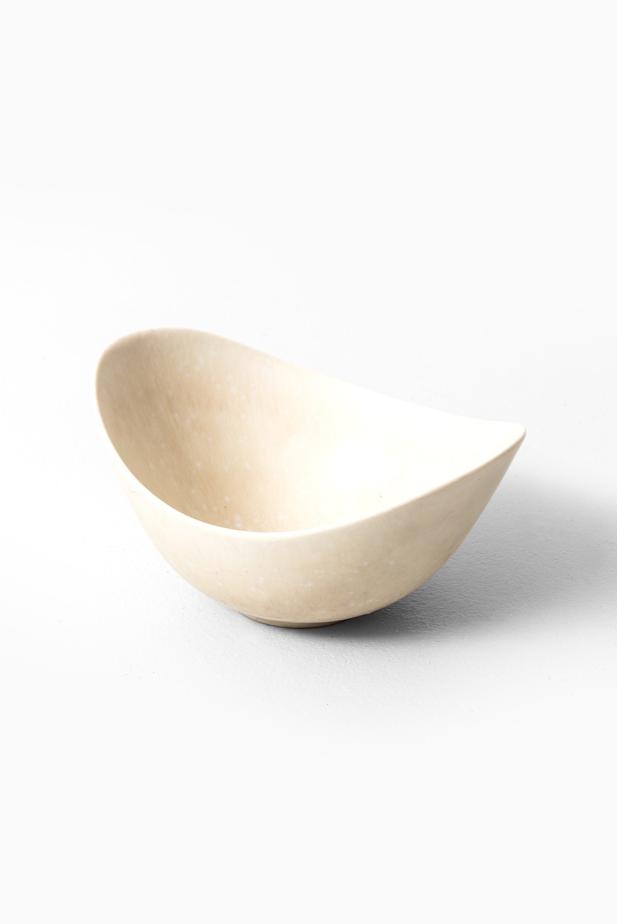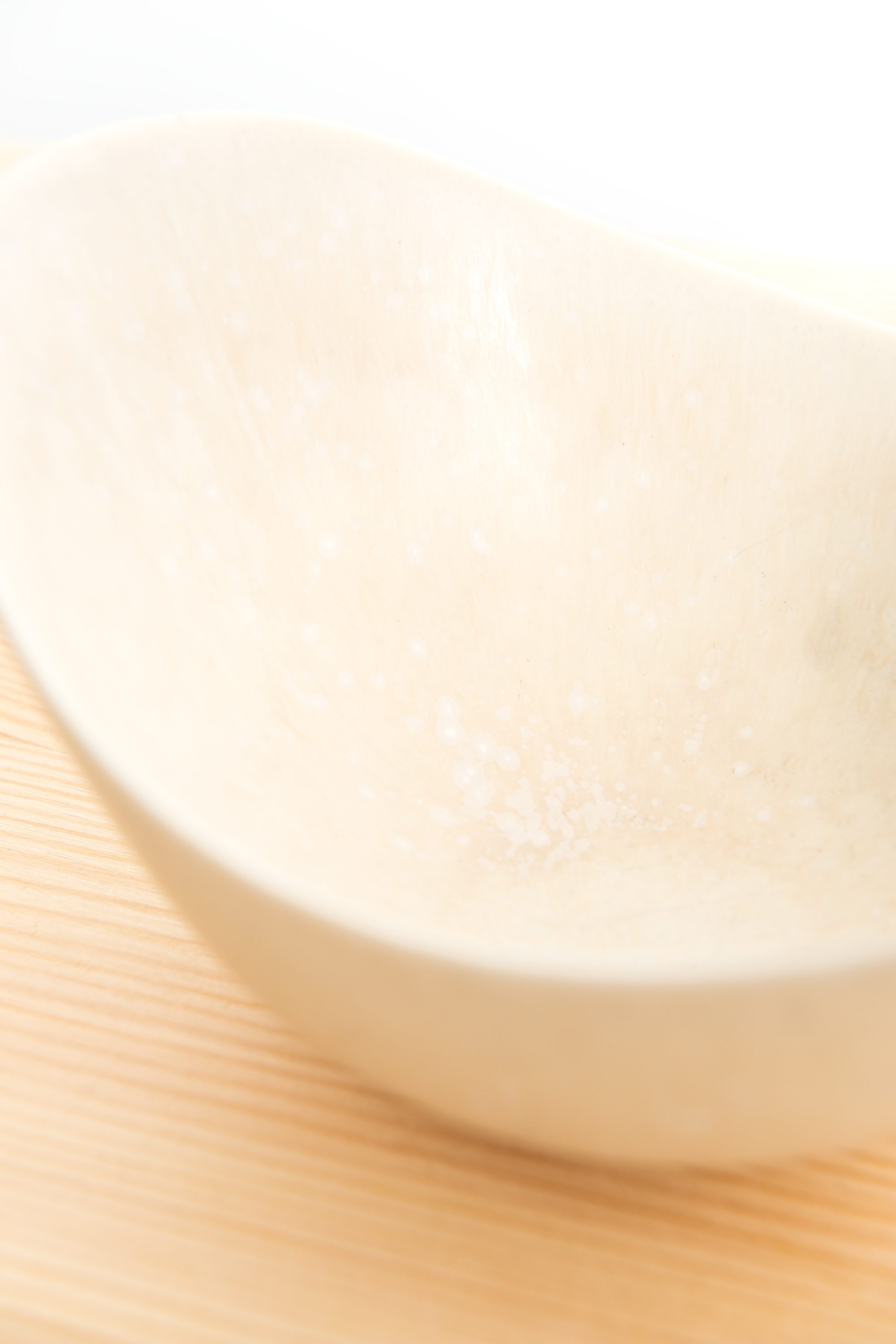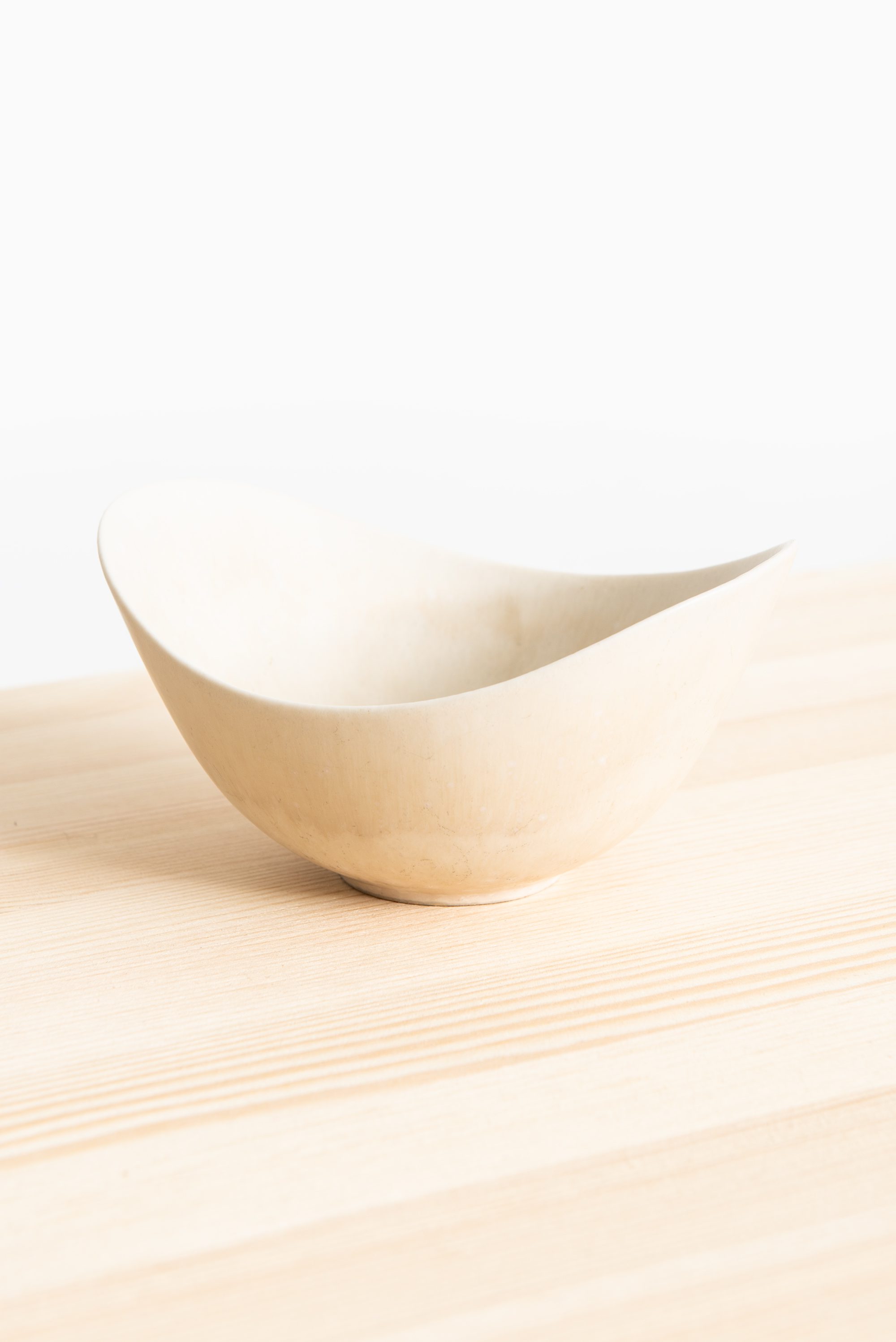 This ceramic bowl, model ARO, was designed by Gunnar Nylund for Rörstrand in Sweden during the 1960s. The bowl features a soft, asymmetrical form with flowing organic lines that gently rise toward one edge, creating a sense of movement and balance. It is finished in a matte ivory glaze with subtle speckling that enhances the natural tone and texture of the ceramic material.