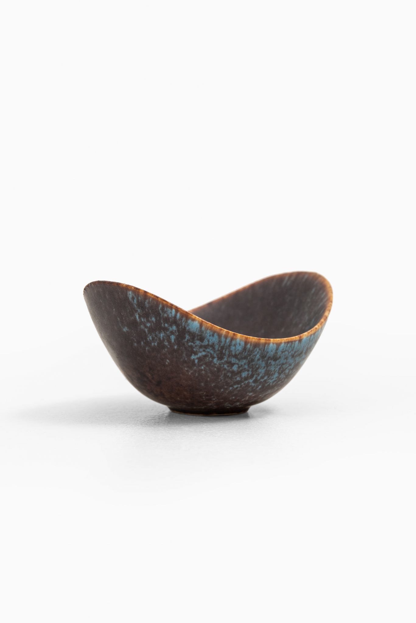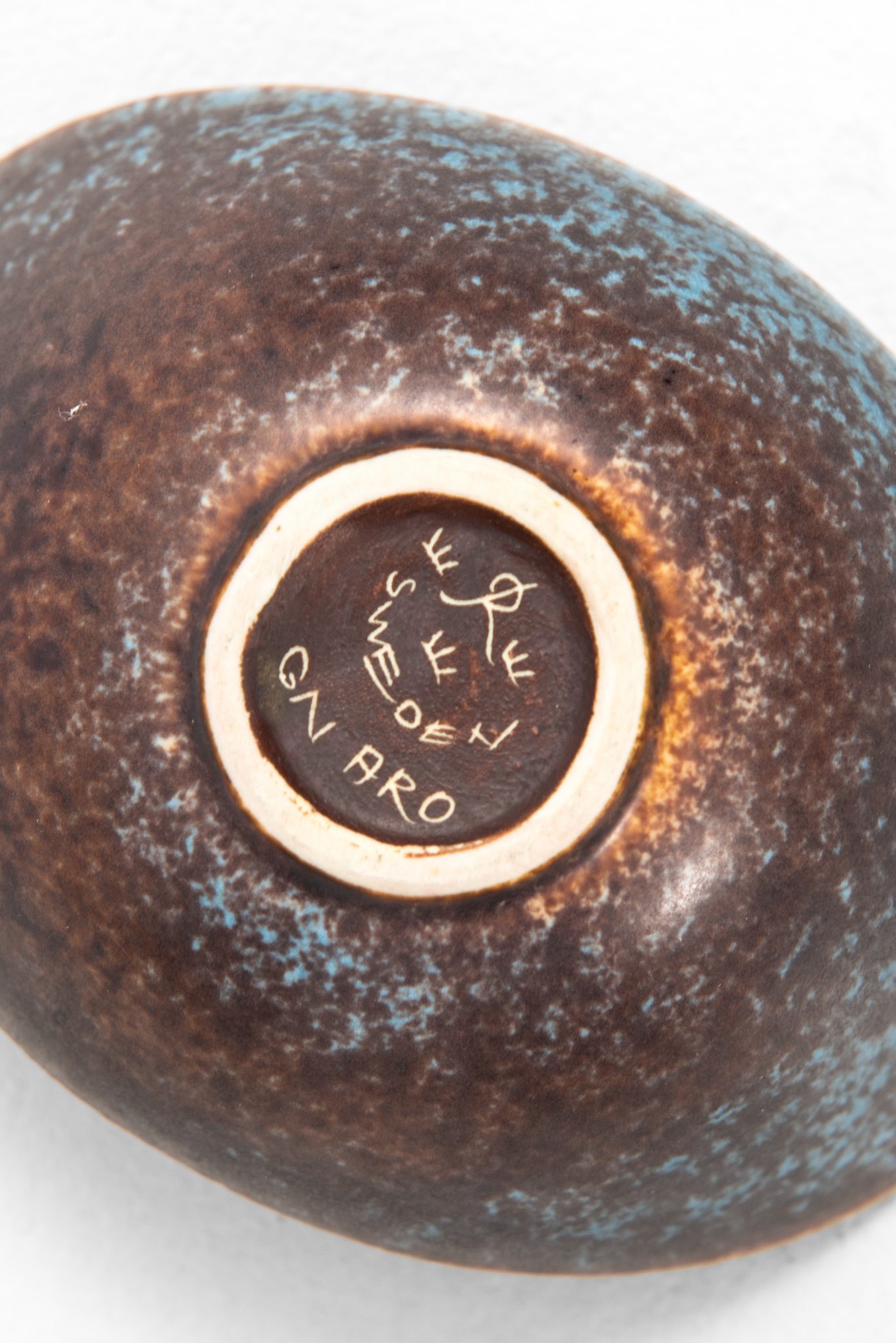 This is a ceramic bowl, model ARO, designed by Gunnar Nylund and produced by Rörstrand in Sweden during the 1960s. The bowl is a compact sculptural form with a gently organic, elliptical shape. Its silhouette undulates slightly at the rim, curving inward with soft asymmetry that enhances its tactile and visual appeal. The outer surface transitions seamlessly into the inner cavity, forming a continuous and harmonious volume characteristic of Nylund’s refined approach to ceramic form.