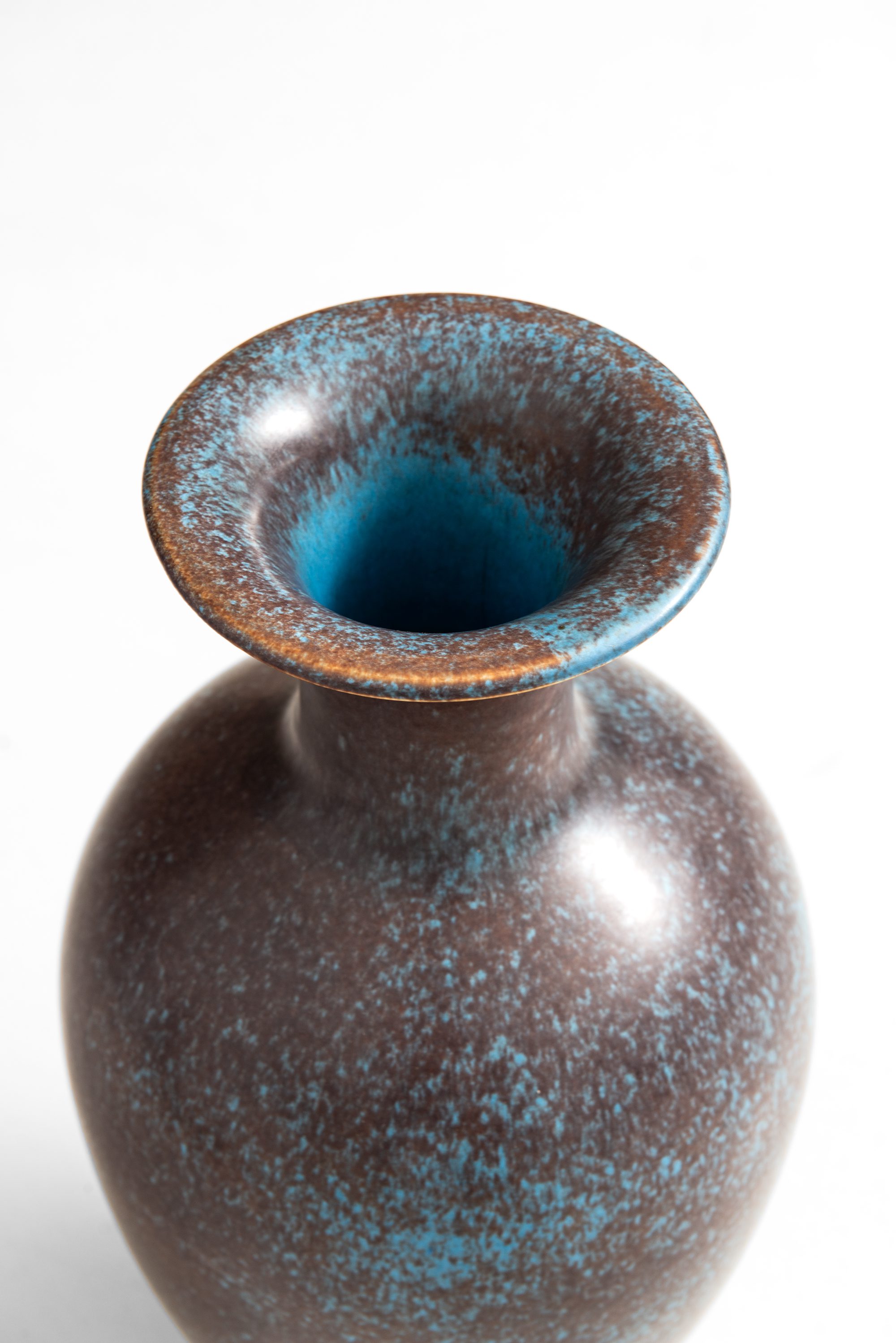 The vase features a softly rounded body that rises into a narrow neck and a wide, flared rim, creating an elegant silhouette that feels both balanced and dynamic. The surface is covered in a deep, speckled glaze that transitions from earthy brown tones to vibrant turquoise blue, revealing subtle depth and variation under changing light. This unique glaze treatment, characteristic of Nylund’s mid-century work, highlights his mastery in combining texture, color, and form to evoke natural movement.