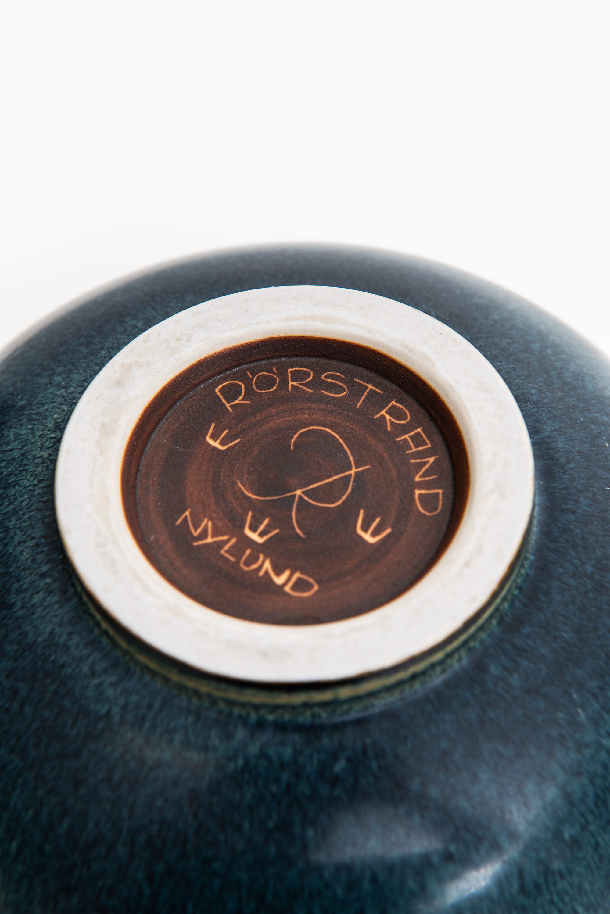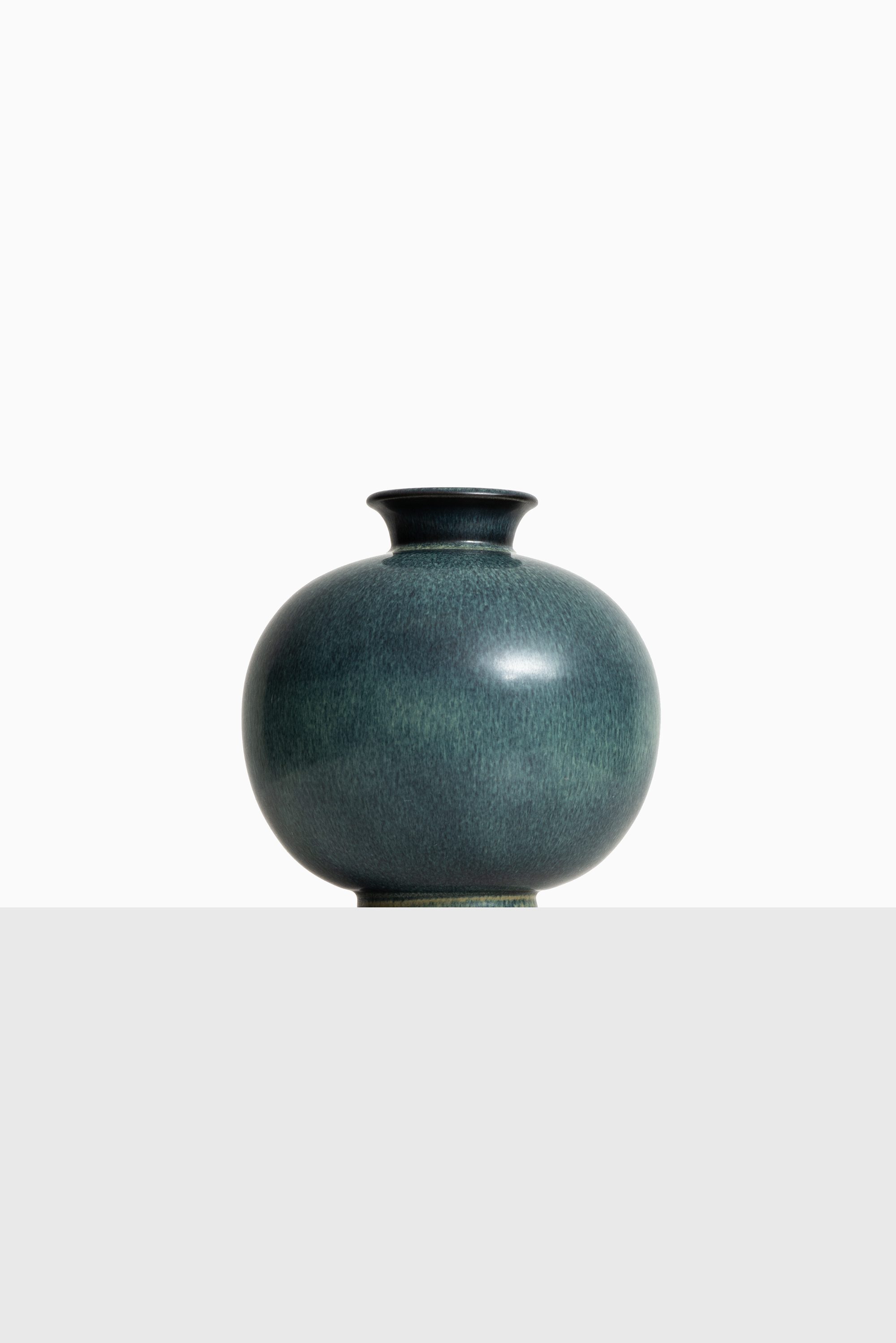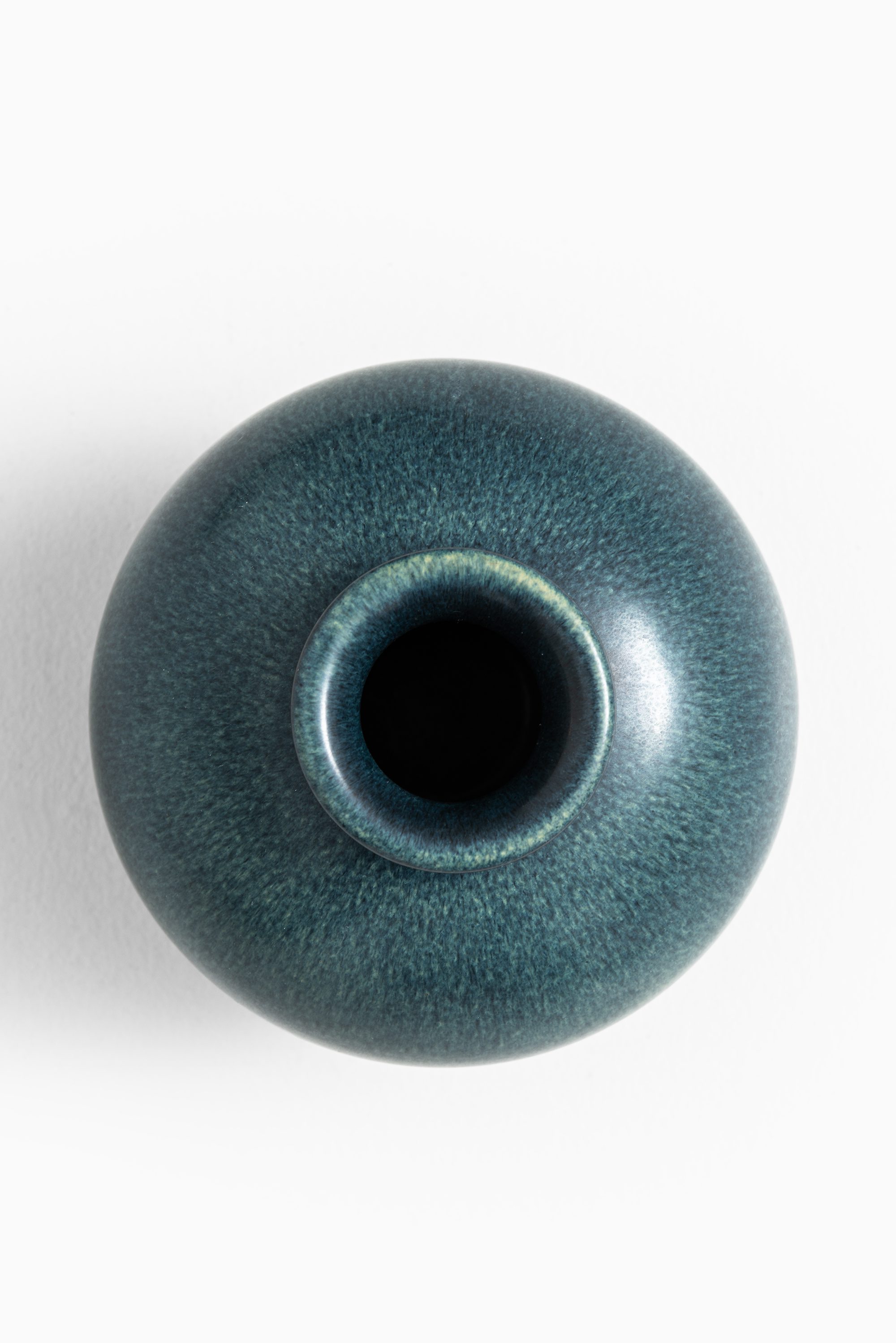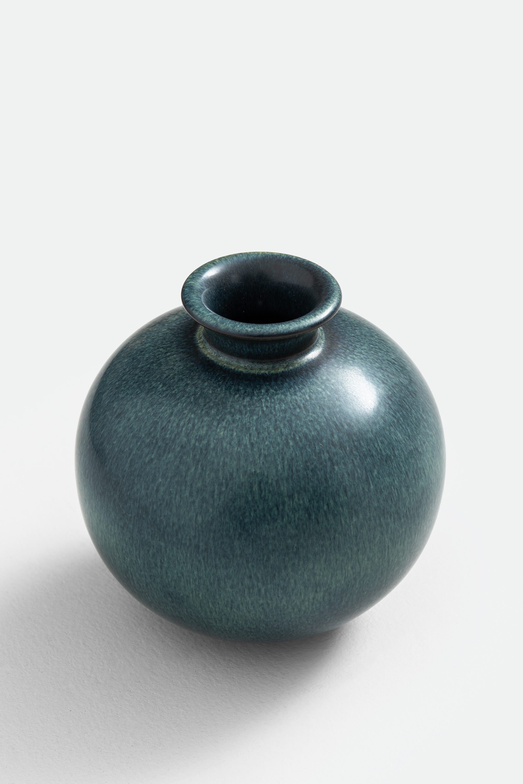This spherical ceramic vase was designed by Gunnar Nylund and produced by Rörstrand in Sweden during the 1960s. It features a deep teal to blue-green glaze with a finely mottled surface texture, creating a subtle gradient effect that accentuates the rounded form. The narrow neck flares outward into a softly rounded lip, adding definition to the otherwise smooth silhouette. The glaze exhibits variations in tone and depth, characteristic of Rörstrand’s high-quality stoneware production from the mid-20th century.