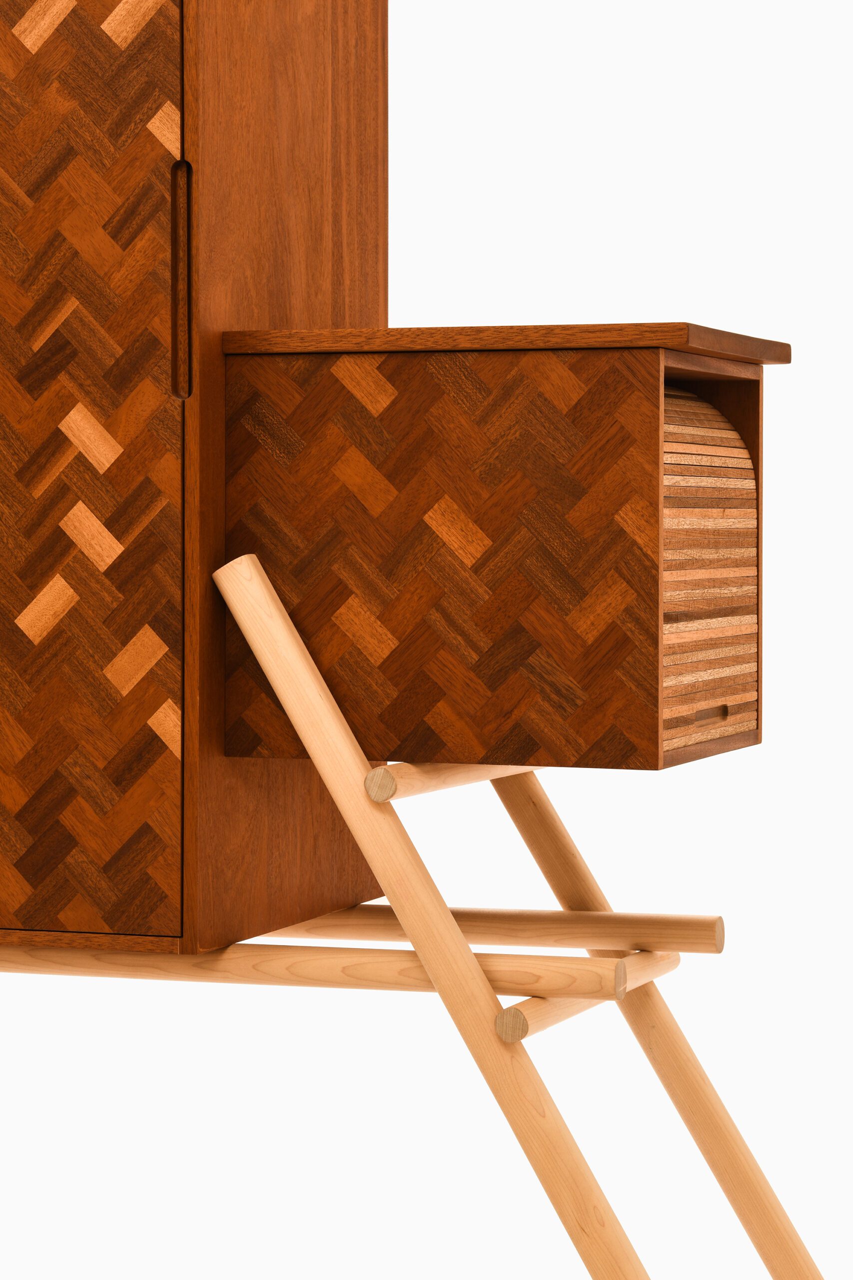 The “Hoerru” cabinet, created by Swedish cabinetmaker Gustav Aliki in 2019, is a distinctive contemporary piece that reflects the elegance and precision of Scandinavian design. Produced in Sweden, the cabinet showcases the natural beauty of its materials and the meticulous craftsmanship for which Aliki is known. The cabinet is primarily constructed from richly toned mahogany wood, with complementary lighter birch elements that provide structural support and a pleasing contrast in both color and texture.