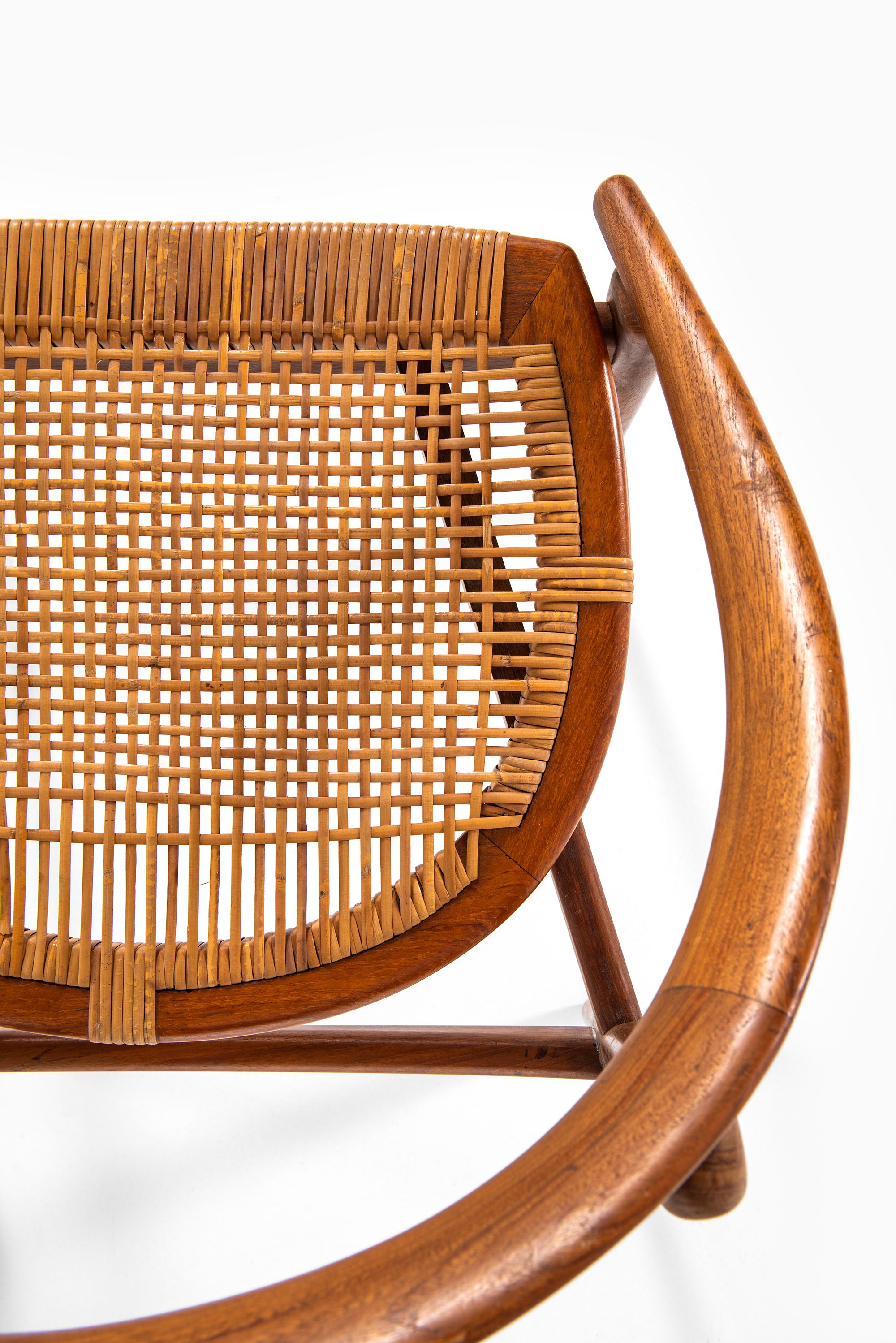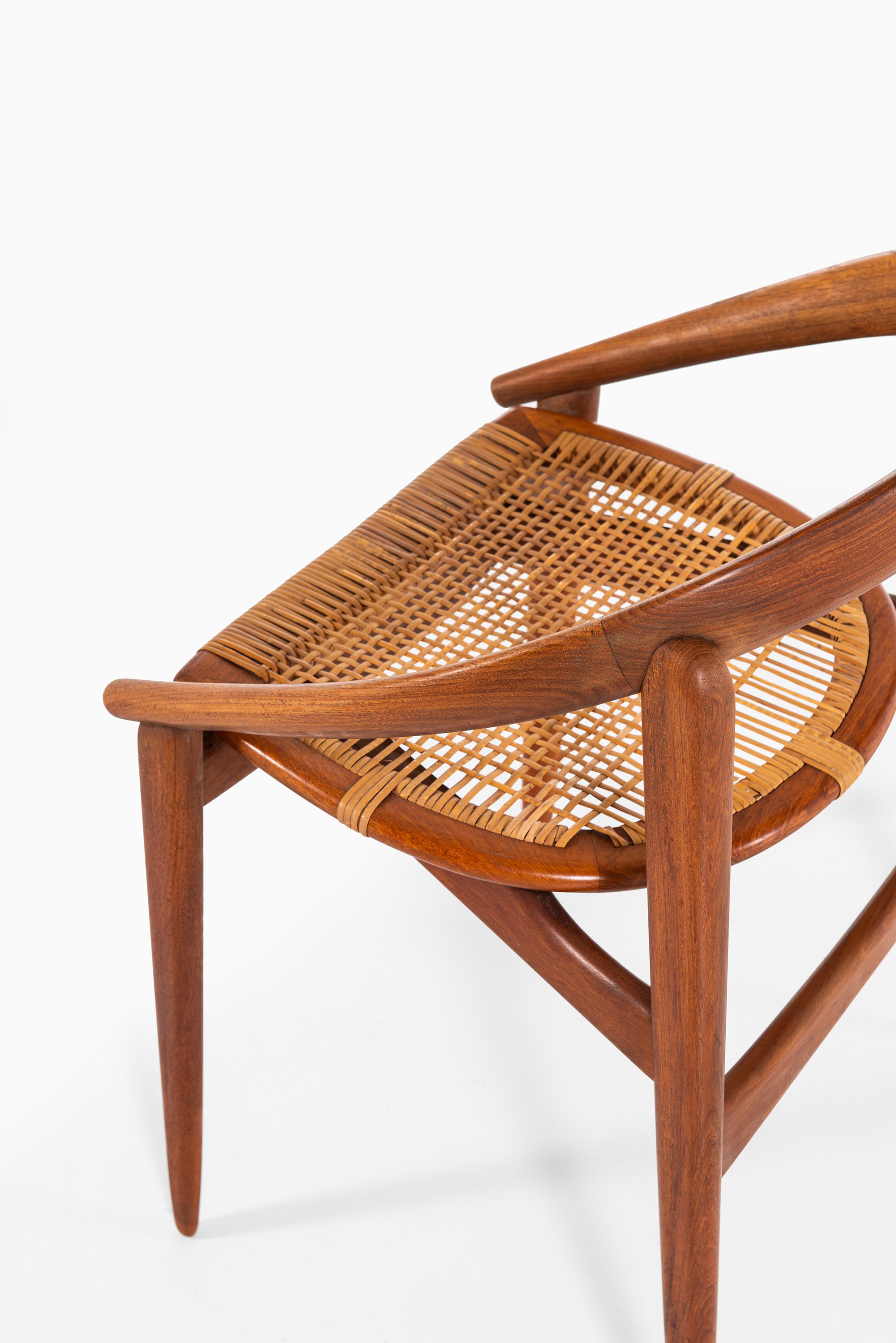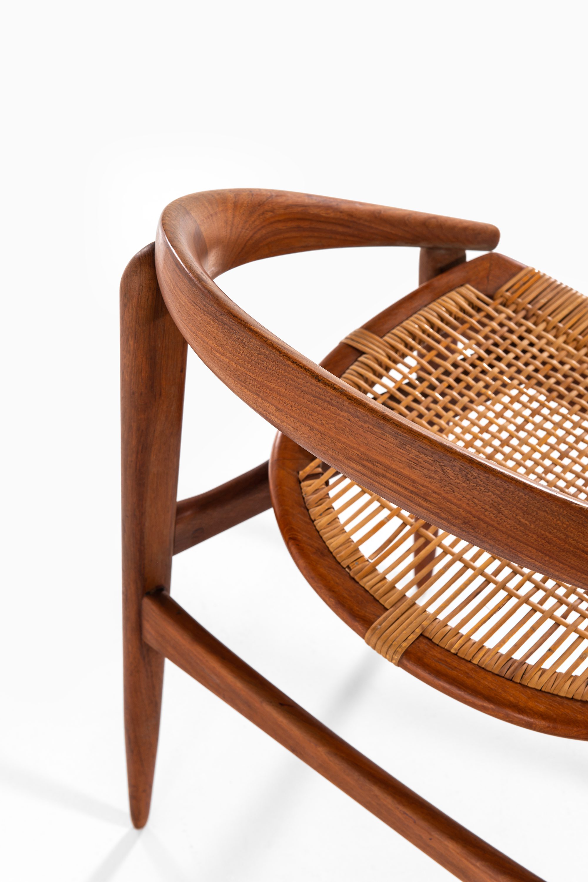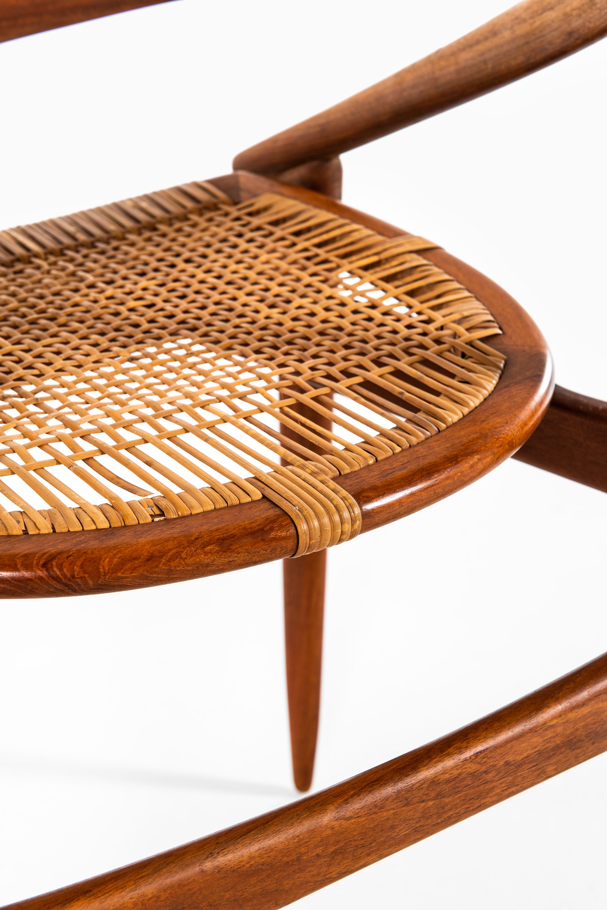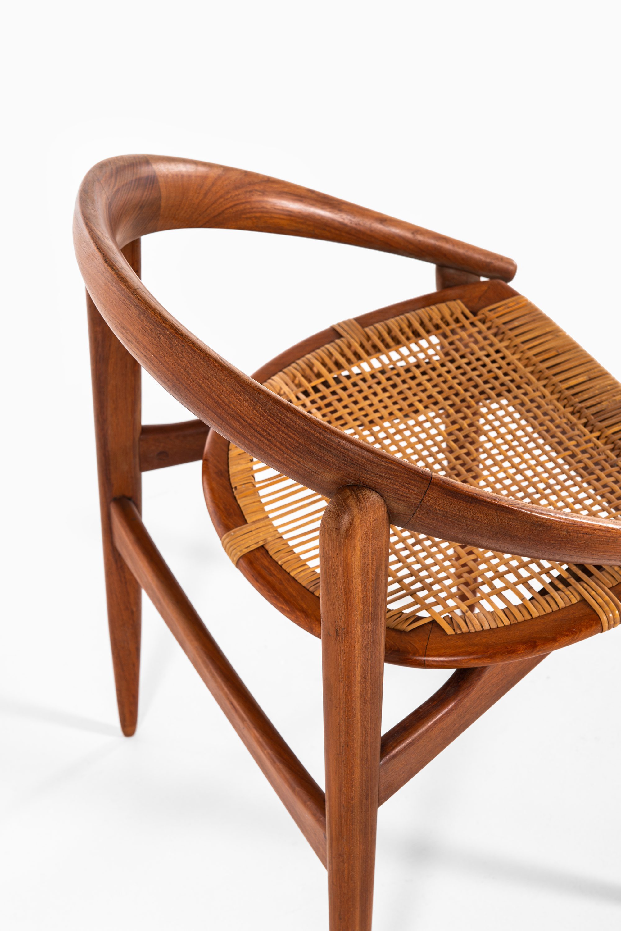 The armchair features a rounded, embracing backrest in solid teak, which flows seamlessly into the arm supports. The seat is executed in woven cane, suspended within the frame to provide both lightness and comfort. The structure is defined by clean lines and organic curves, reflecting Brockmann-Petersen’s approach to modern Danish furniture, where craftsmanship and functional clarity meet an understated elegance. The design also shows the influence of cabinetmaking traditions, as the piece was executed by a master craftsman rather than through industrial production.