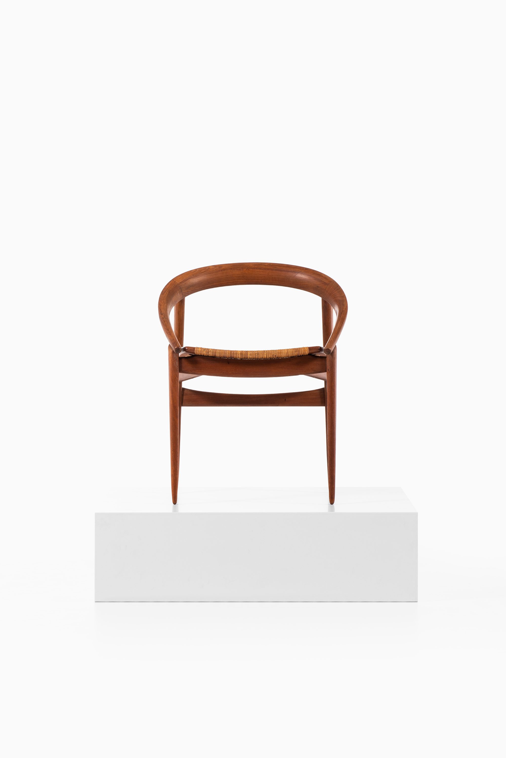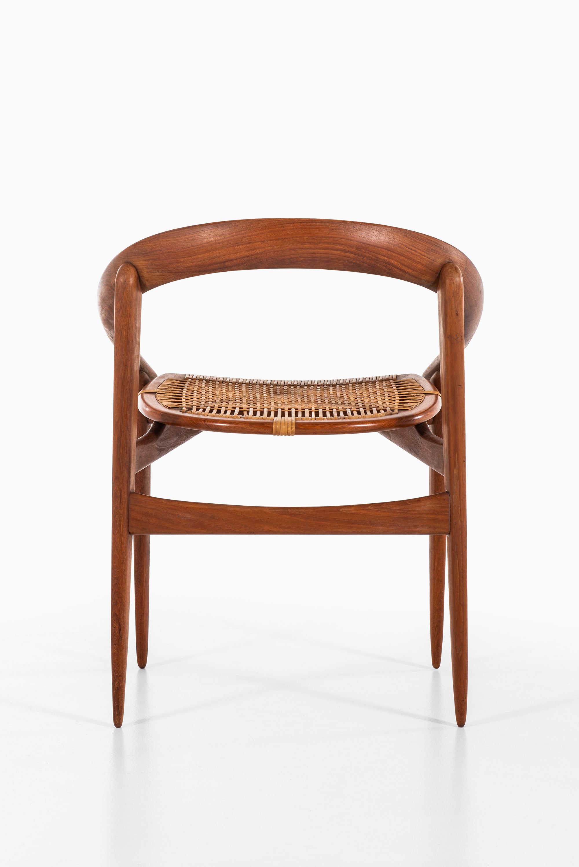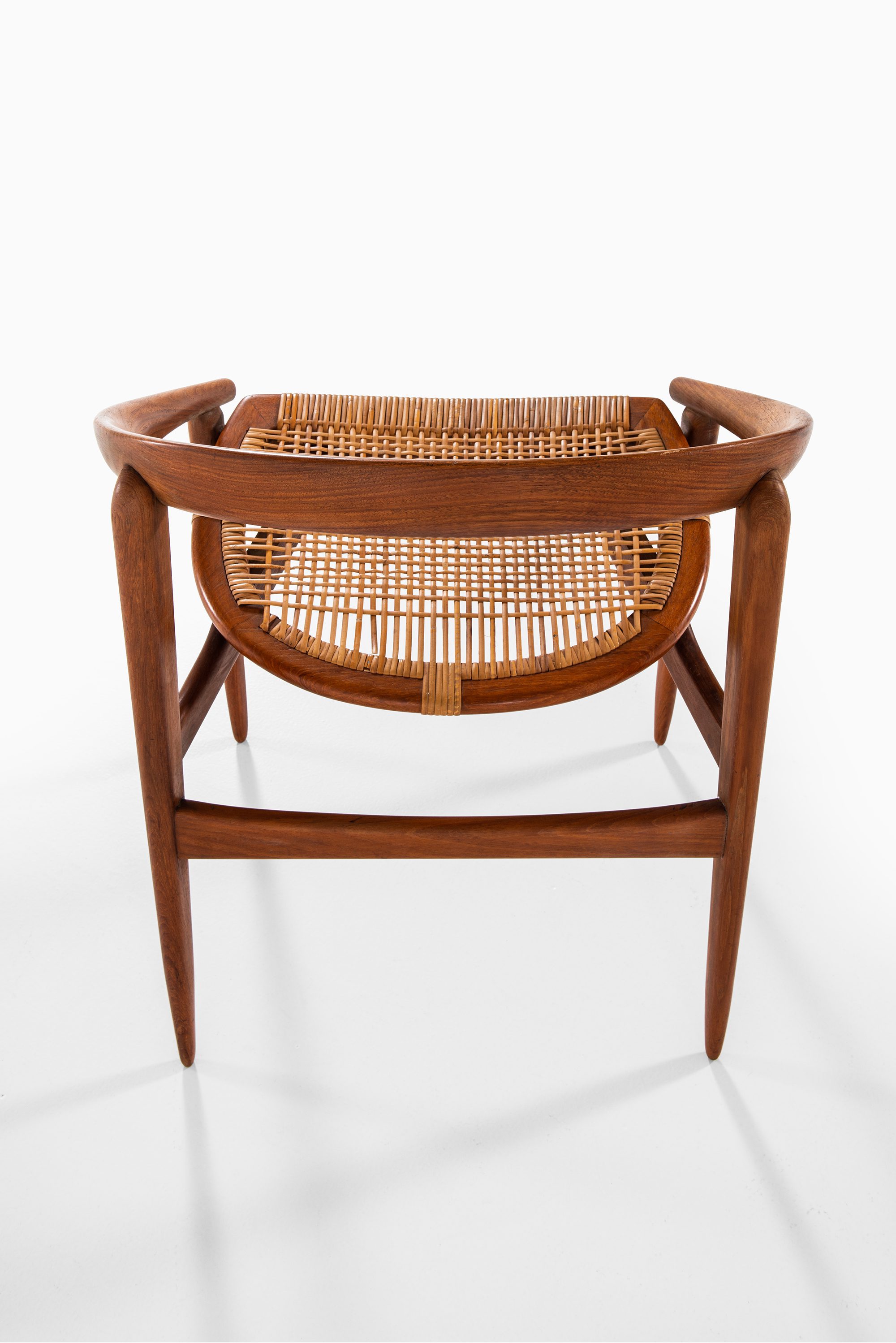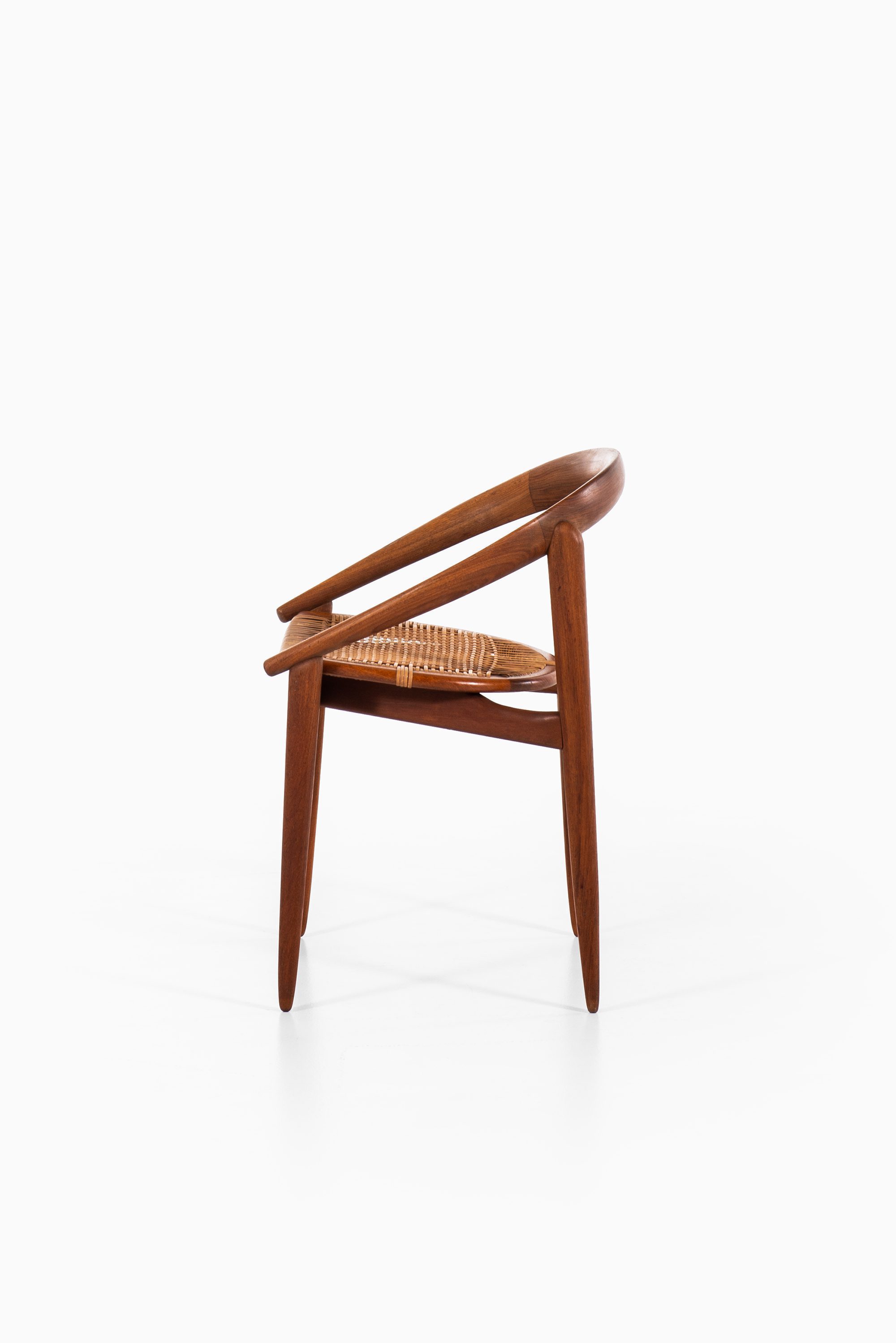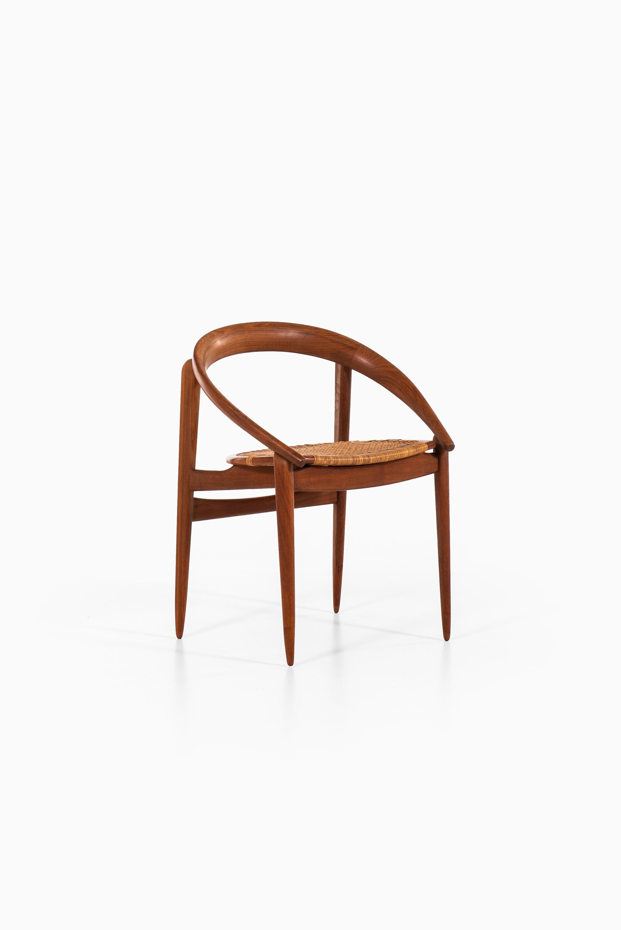 The armchair features a rounded, embracing backrest in solid teak, which flows seamlessly into the arm supports. The seat is executed in woven cane, suspended within the frame to provide both lightness and comfort. The structure is defined by clean lines and organic curves, reflecting Brockmann-Petersen’s approach to modern Danish furniture, where craftsmanship and functional clarity meet an understated elegance. The design also shows the influence of cabinetmaking traditions, as the piece was executed by a master craftsman rather than through industrial production.