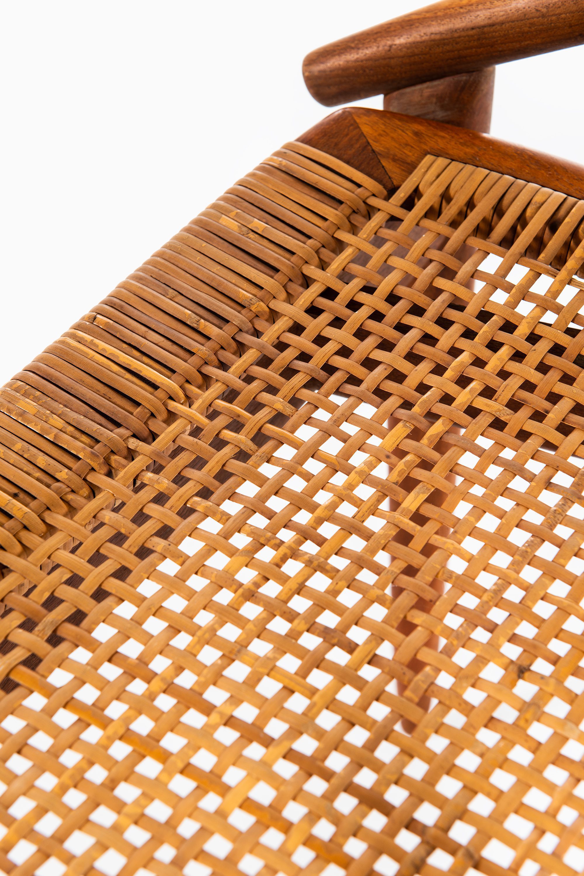 The chair is presented in good vintage condition with small signs of age and use. The teak has developed a rich, warm patina, while the cane seat shows some minor wear and areas of damage, consistent with age. These details contribute to the authenticity of the piece and reflect its mid-20th century origin.