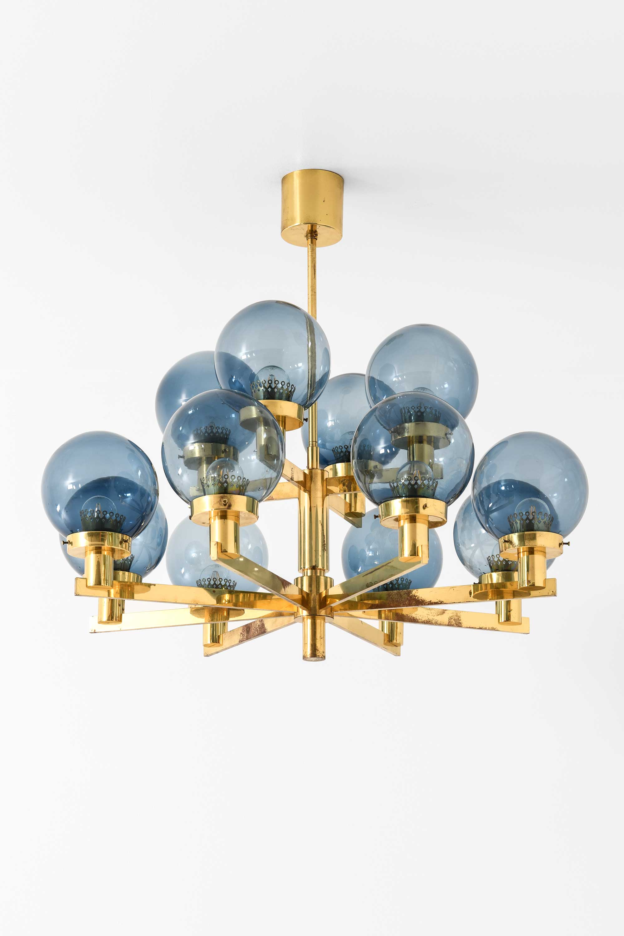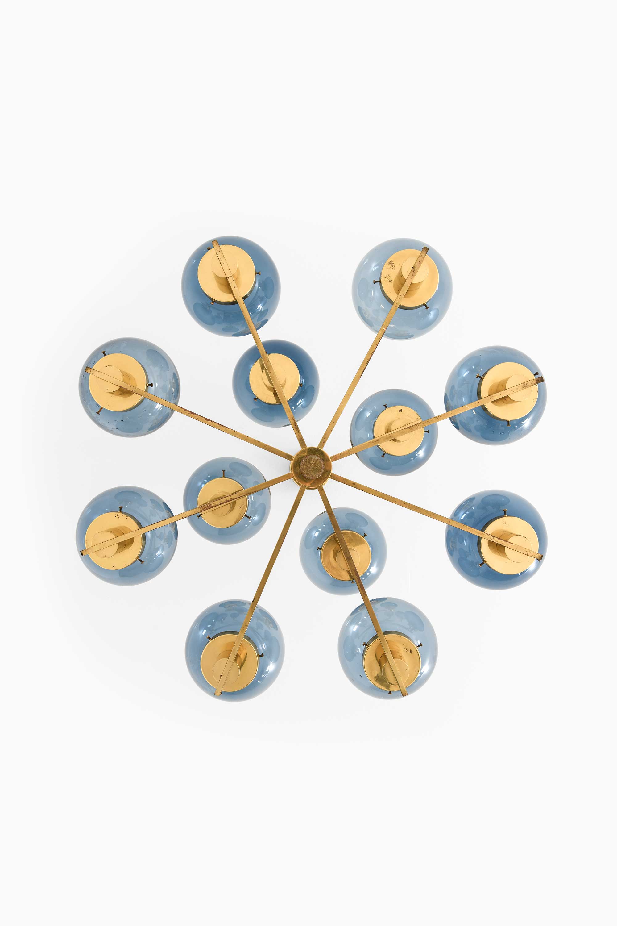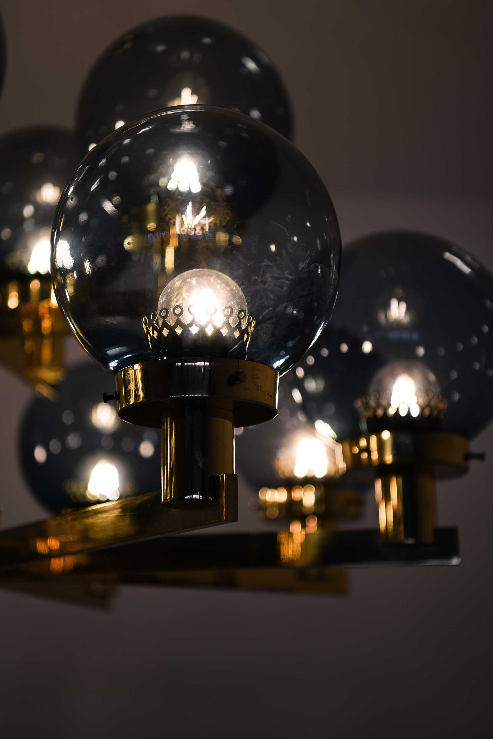 The globes are fabricated from smoky blue glass, subtly tinted to provide a soft and diffuse light when illuminated. Their surface is smooth and evenly tinted, and the uniformity of the spheres enhances the lamp’s rhythmic visual composition. The smoke-blue color contributes a cool counterbalance to the warm brass structure, lending a calm, ambient quality to the emitted light. All twelve globes are original and intact, free from chips, cracks, or abrasions.