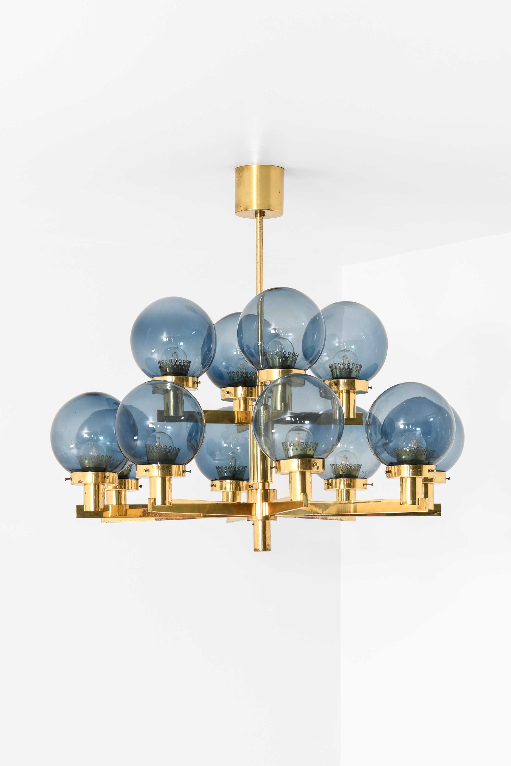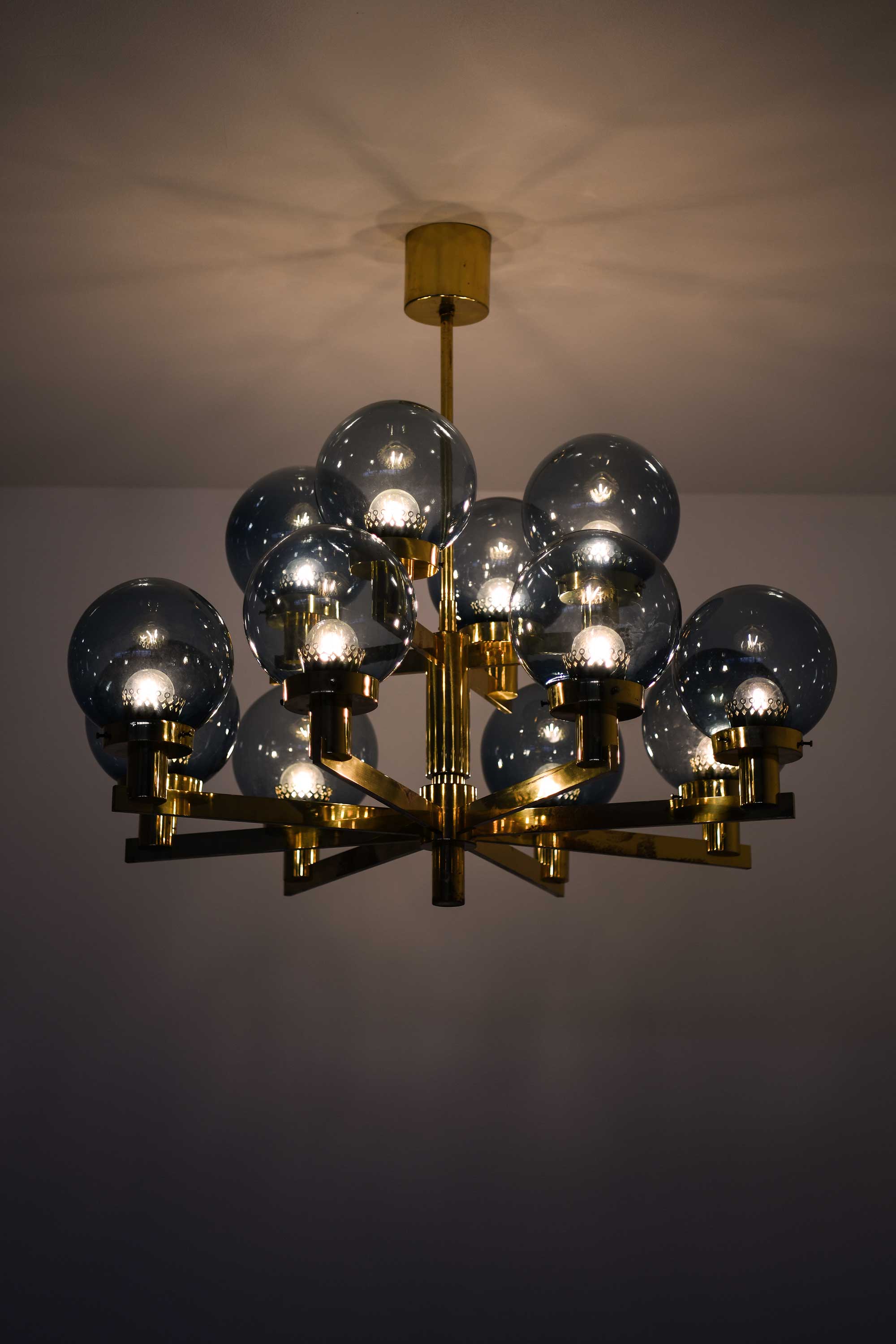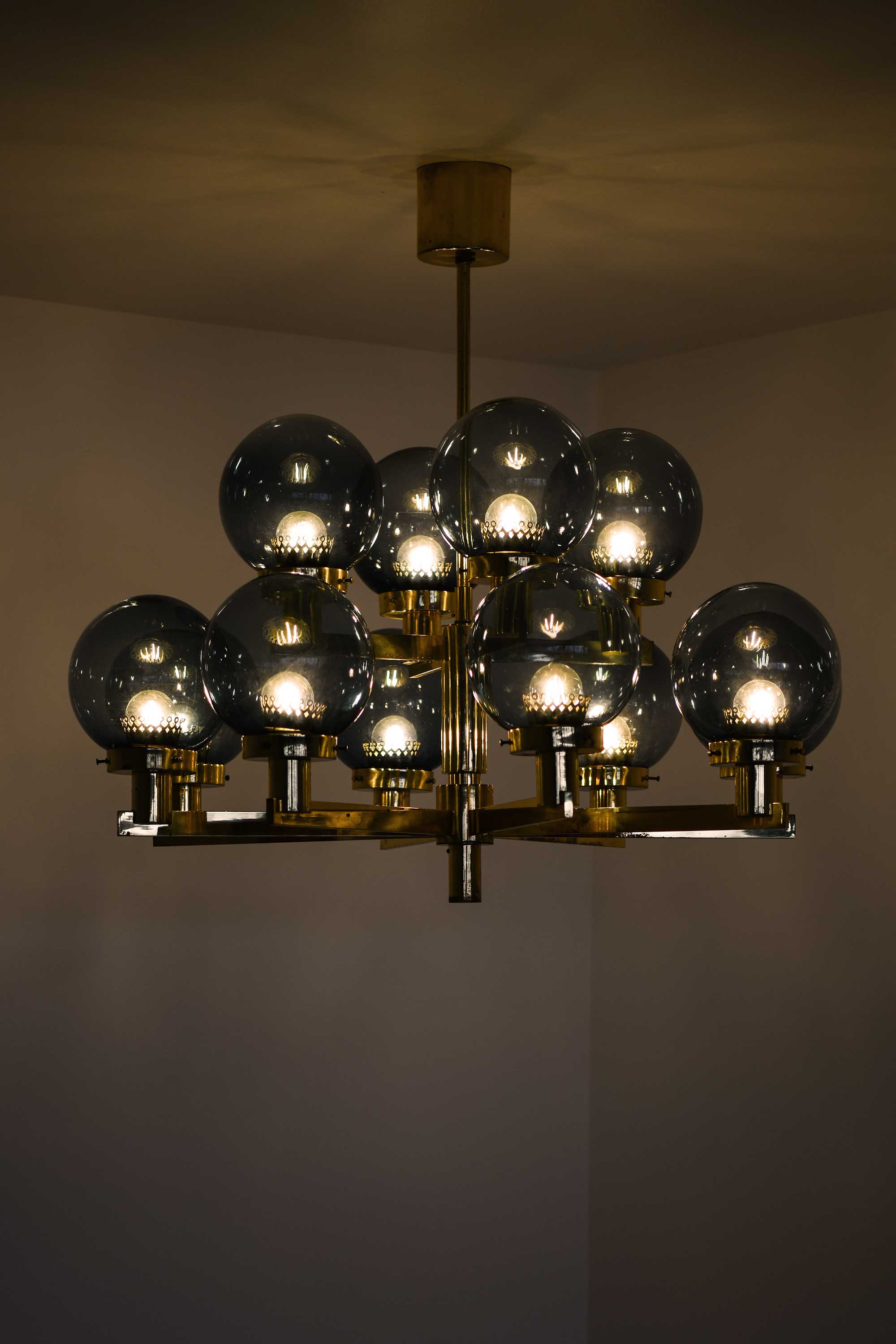 The globes are fabricated from smoky blue glass, subtly tinted to provide a soft and diffuse light when illuminated. Their surface is smooth and evenly tinted, and the uniformity of the spheres enhances the lamp’s rhythmic visual composition. The smoke-blue color contributes a cool counterbalance to the warm brass structure, lending a calm, ambient quality to the emitted light. All twelve globes are original and intact, free from chips, cracks, or abrasions.