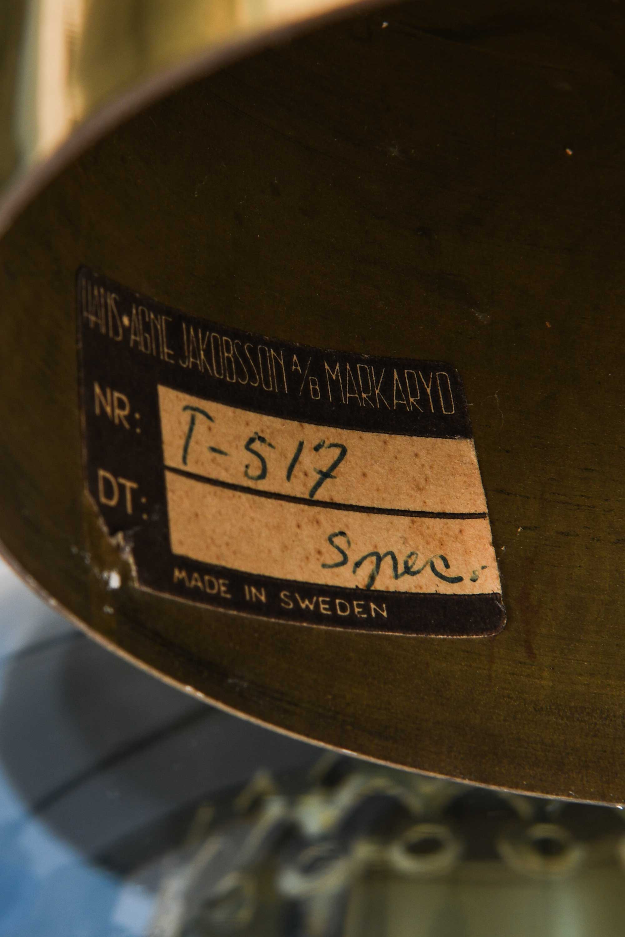 Hans-Agne Jakobsson, renowned for his innovative approach to lighting design, often emphasized the modulation of light through materials such as glass, brass, and textiles. His work prioritized atmosphere over direct brightness, favoring diffuse light and layered forms. The T-517/12 model reflects this philosophy, offering both visual presence and a gentle lighting experience. Produced by his namesake company in Markaryd, this piece is an uncommon, custom-made example from his prolific career.