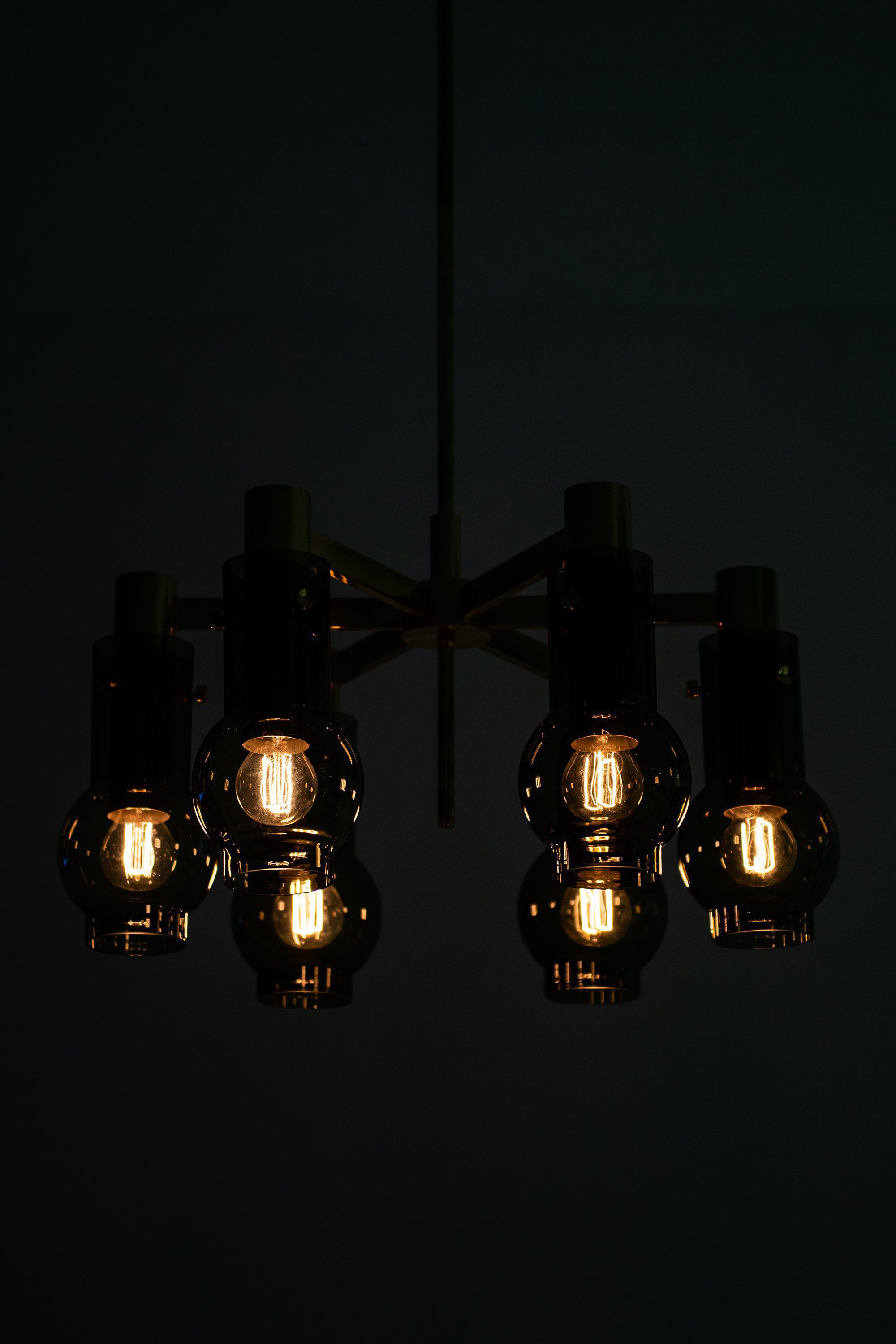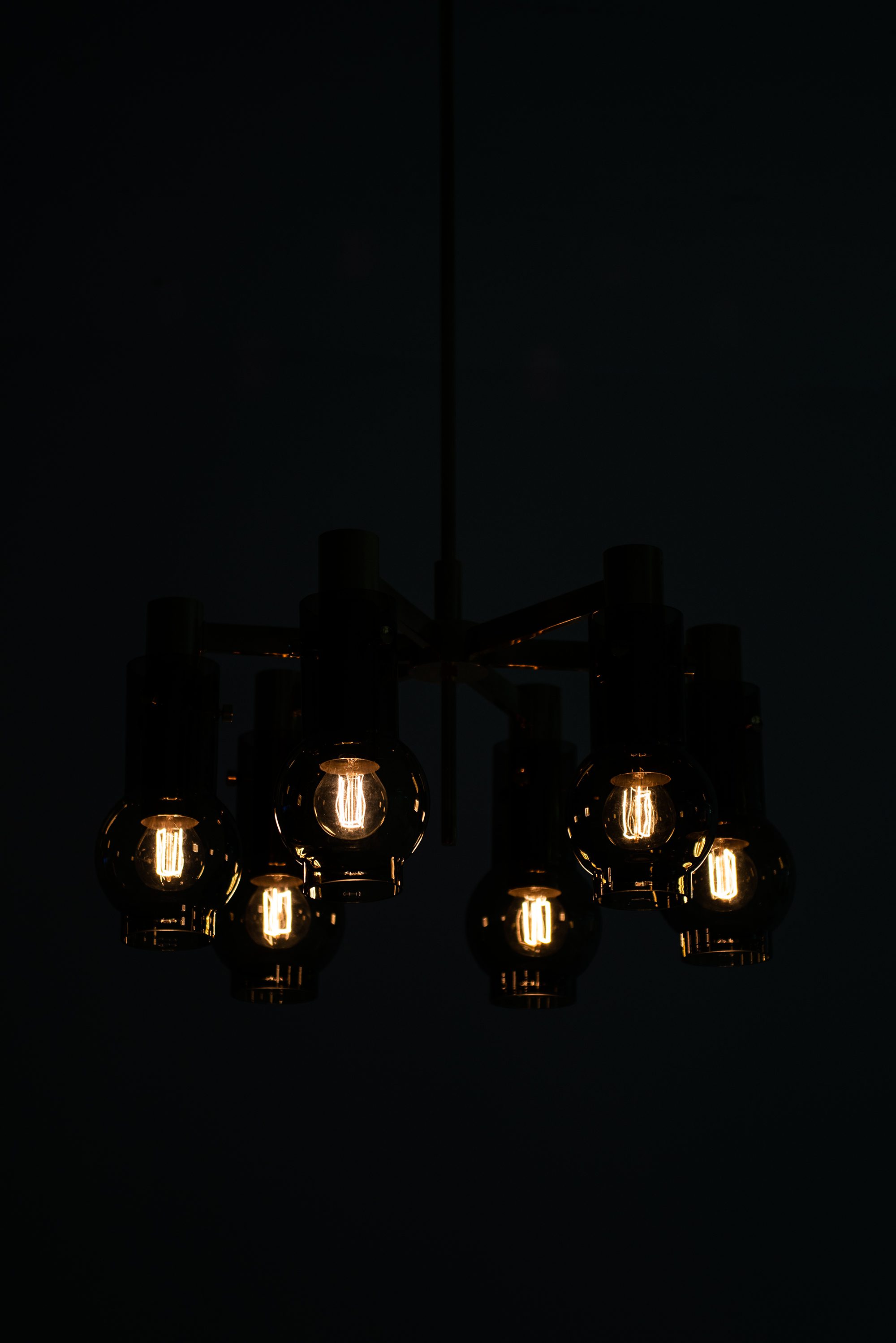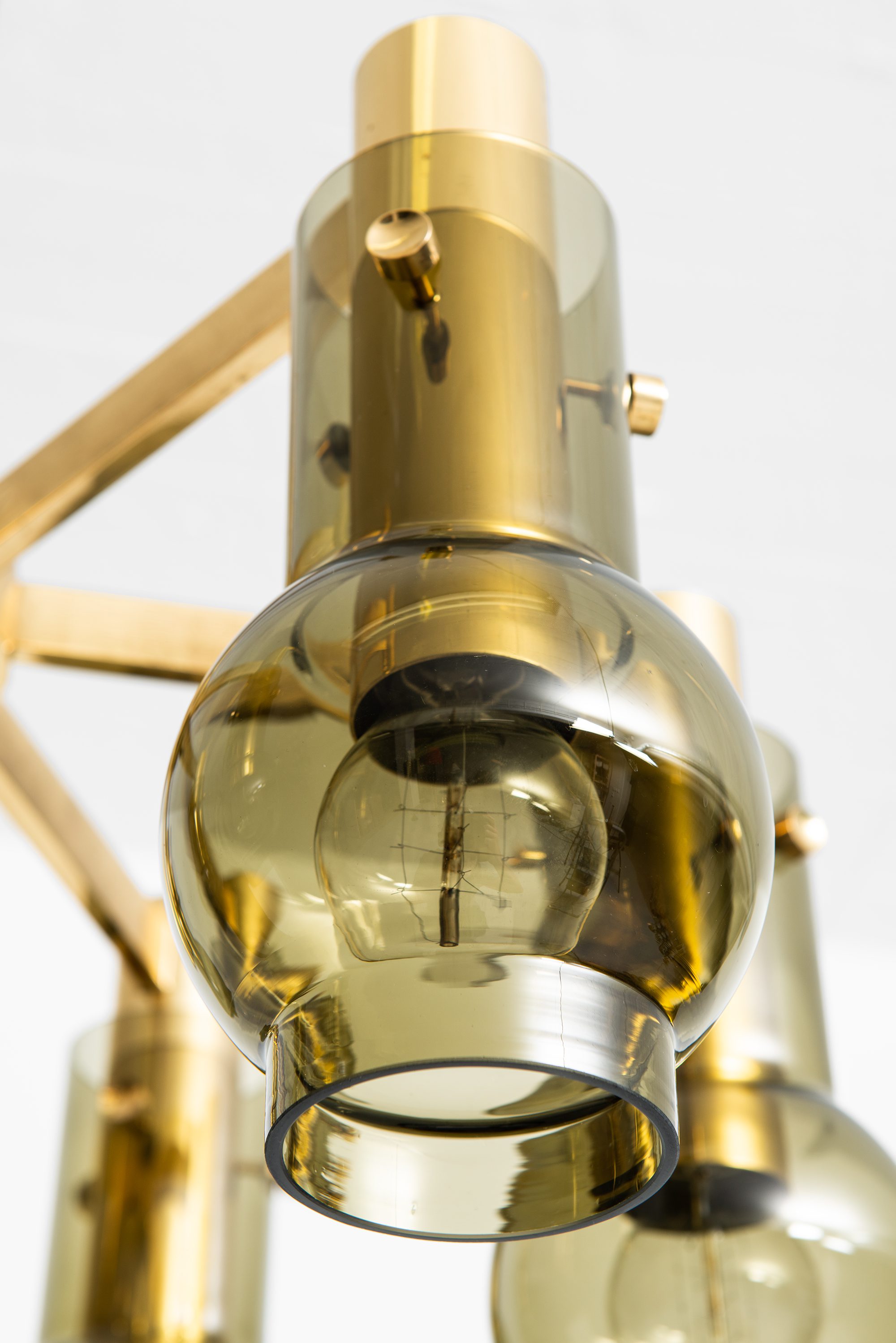 The lamp is constructed in brass with a polished surface that has developed a soft patina, complemented by blown glass shades in a warm, slightly smoked tone. The shades are cylindrical with a rounded lower portion, enclosing the bulbs in a way that softens and diffuses the emitted light. When illuminated, the glass produces a warm glow, emphasizing Jakobsson’s consistent interest in creating lighting that feels intimate and atmospheric. The chandelier has a radial construction, with brass arms supporting the individual light holders, all connected to a central vertical rod and canopy. This structural clarity reflects the Scandinavian mid-century approach to design, where form follows function but is executed with elegance and restraint.