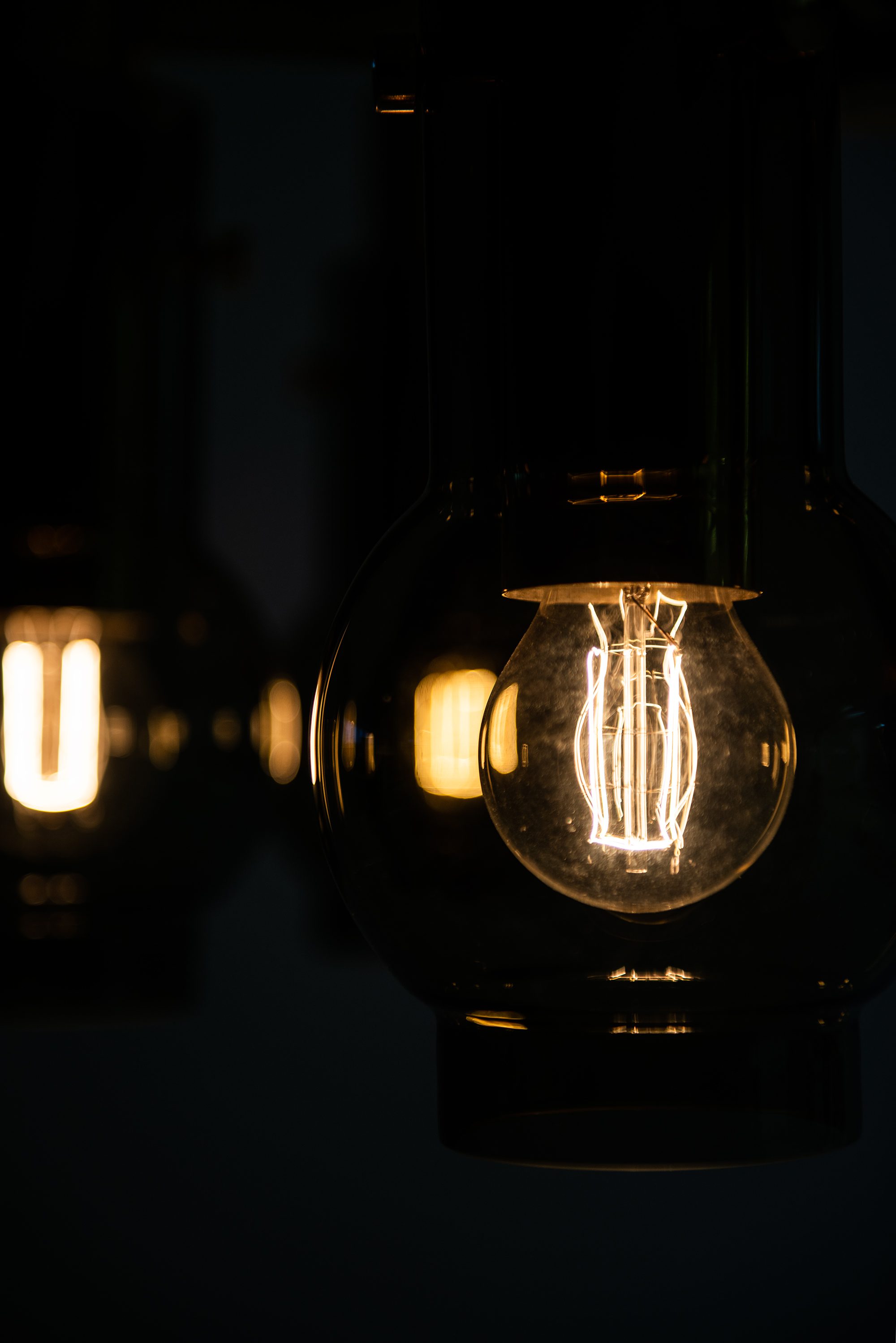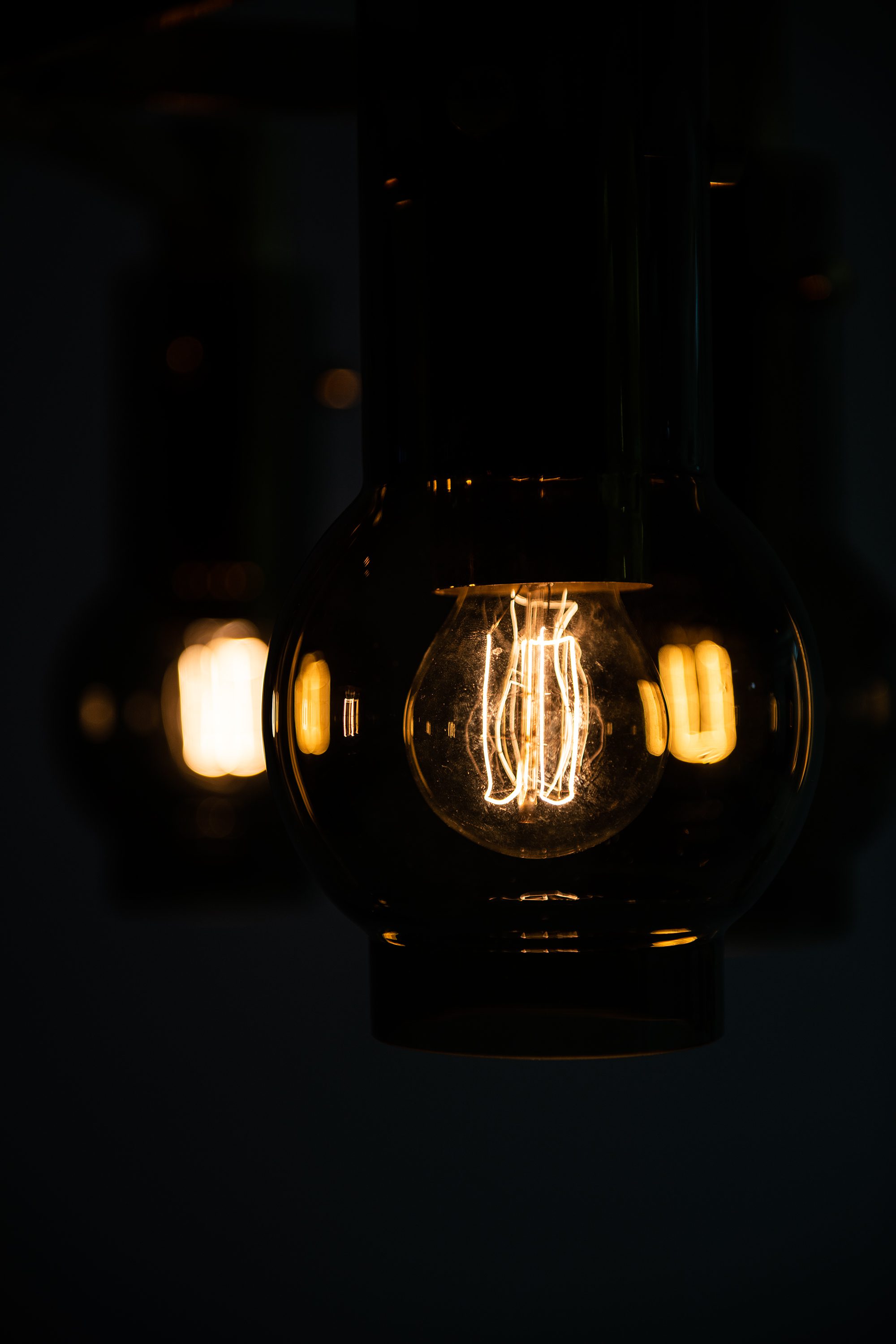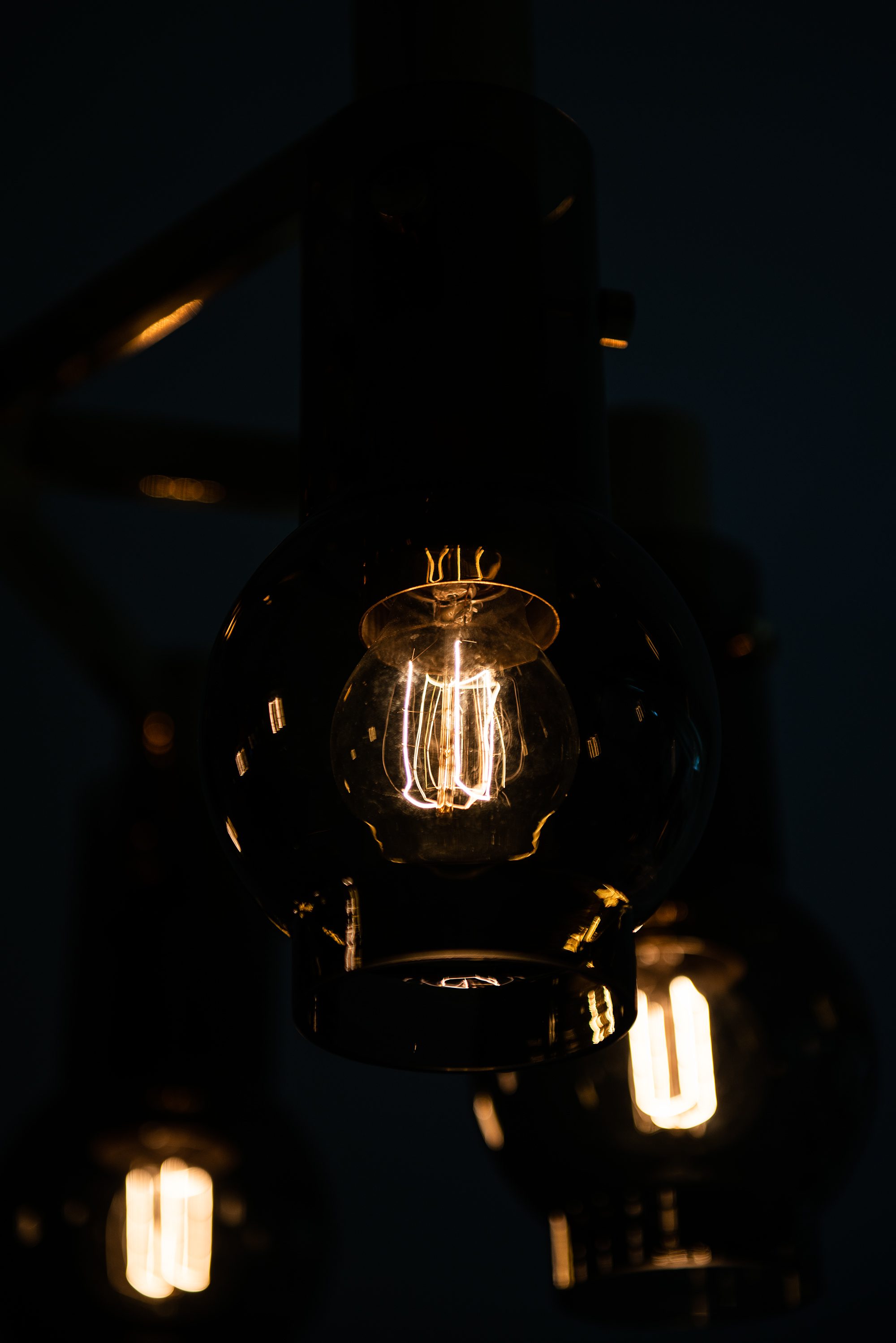 The lamp is constructed in brass with a polished surface that has developed a soft patina, complemented by blown glass shades in a warm, slightly smoked tone. The shades are cylindrical with a rounded lower portion, enclosing the bulbs in a way that softens and diffuses the emitted light. When illuminated, the glass produces a warm glow, emphasizing Jakobsson’s consistent interest in creating lighting that feels intimate and atmospheric. The chandelier has a radial construction, with brass arms supporting the individual light holders, all connected to a central vertical rod and canopy. This structural clarity reflects the Scandinavian mid-century approach to design, where form follows function but is executed with elegance and restraint.