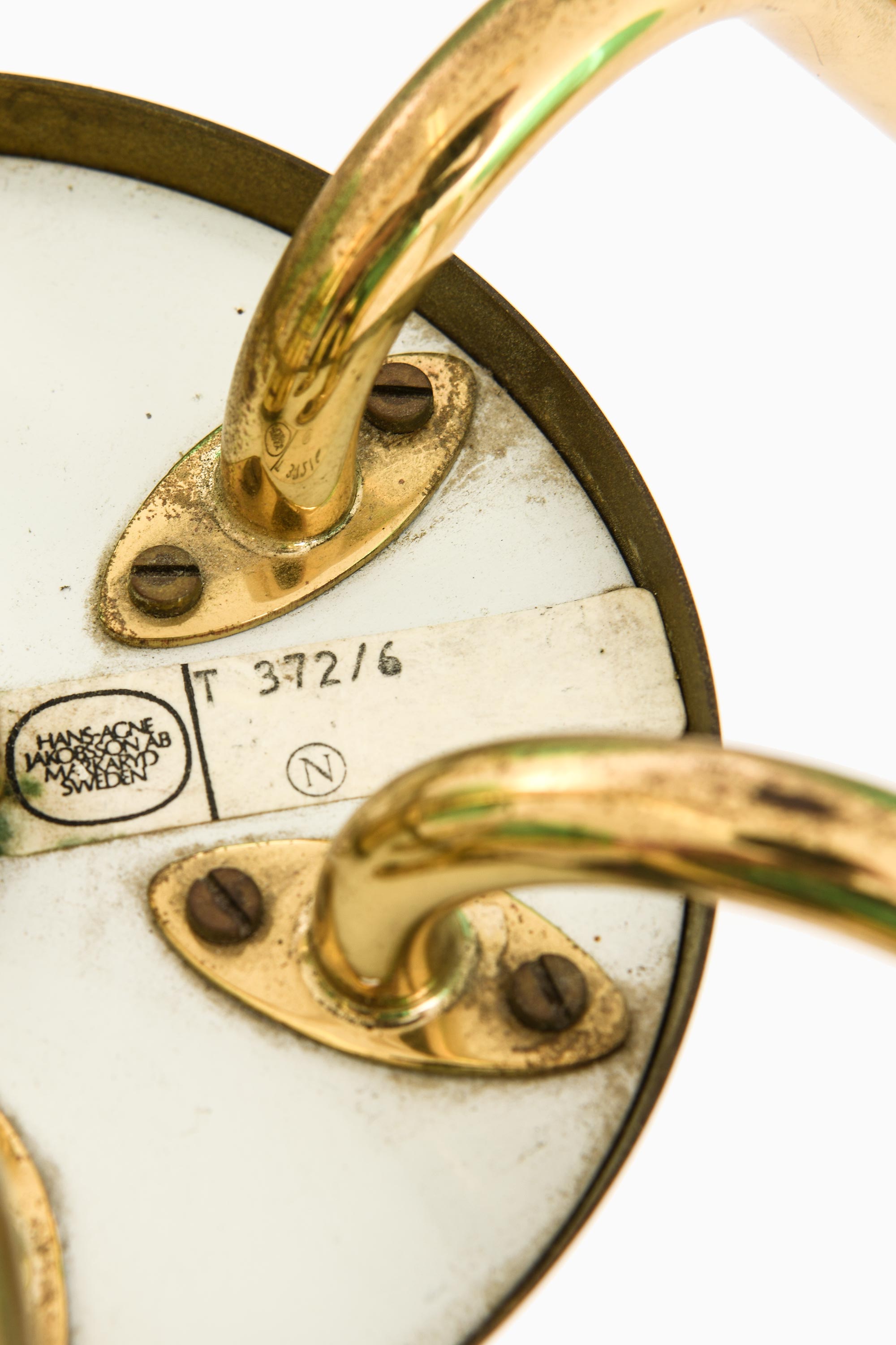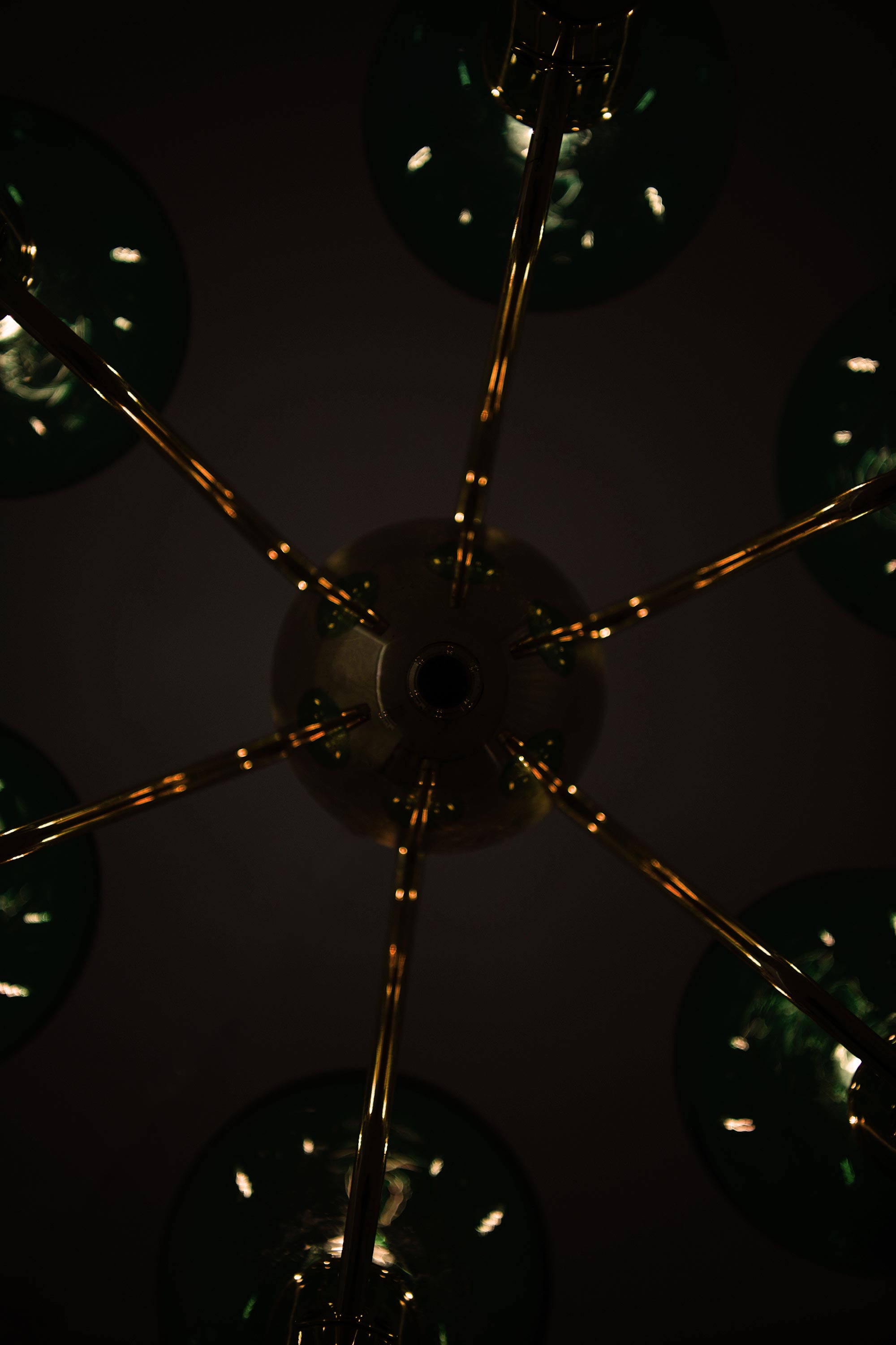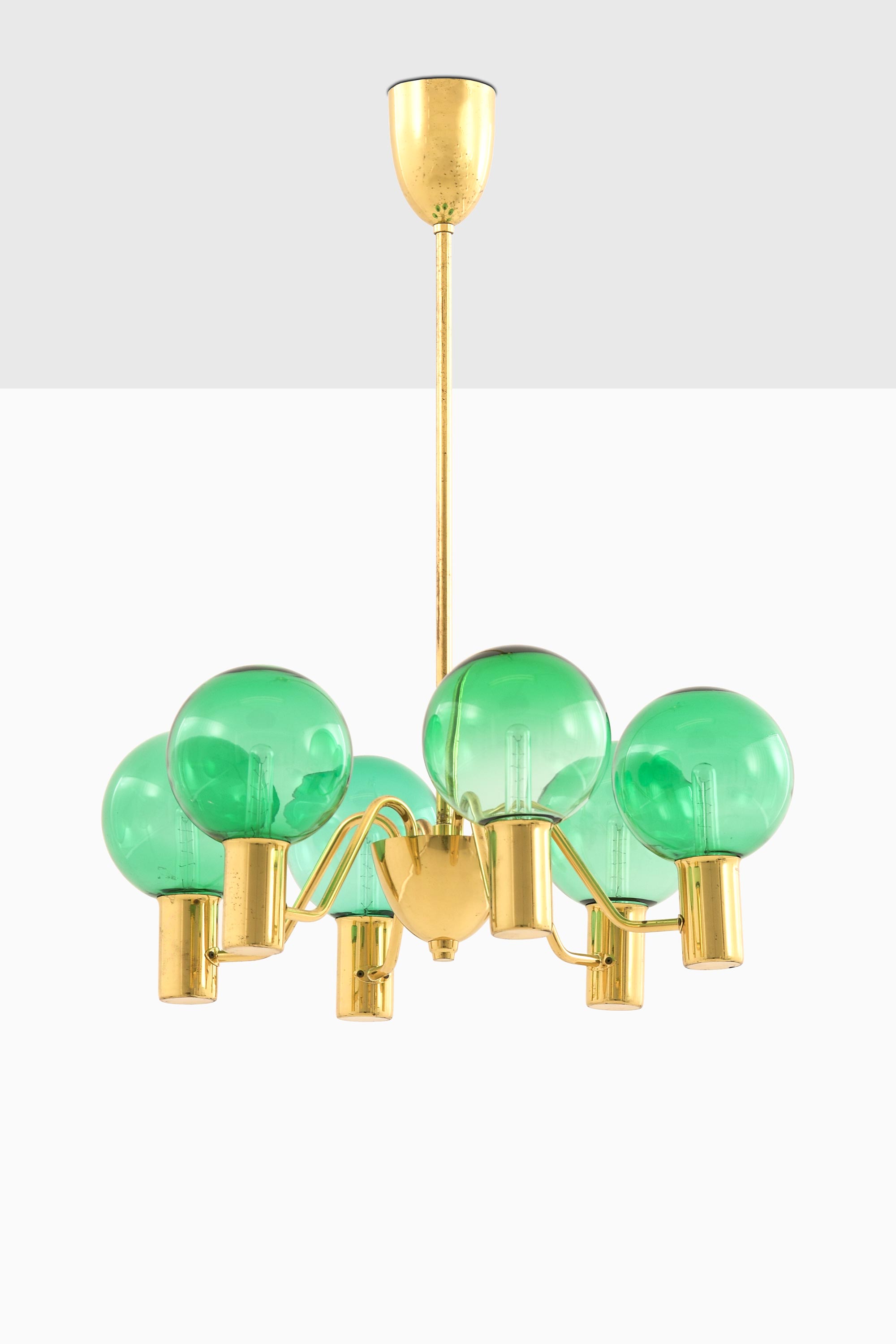 The ceiling lamp model T-372/6, designed by Hans-Agne Jakobsson and produced by Hans-Agne Jakobsson AB in Markaryd, Sweden, is a distinctive example of mid-century Scandinavian modern design. This pendant lamp features a brass construction with six arms extending outward in a radial pattern, each holding an original hand-blown green glass globe. The lamp captures the refined craftsmanship and elegance typical of the 1960s Scandinavian design era.