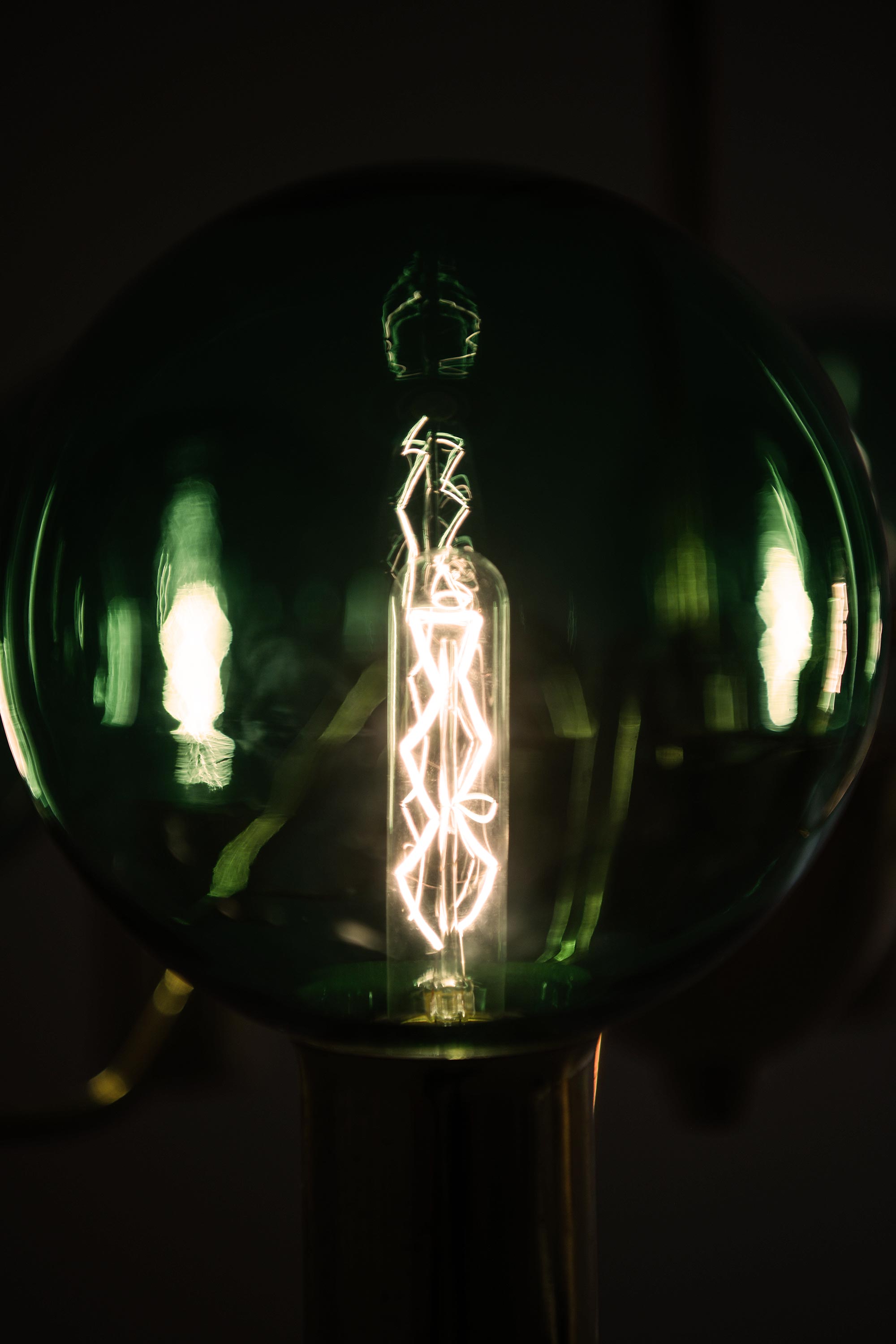The solid brass structure, with its gracefully curved arms, introduces a dynamic sense of movement to the design. Over time, the brass has developed a natural patina, which adds a vintage character to the piece. The green glass globes, set against the warm golden tones of the brass, create a visually striking contrast, while their translucent surface gently diffuses the light. This diffusion produces a soft, ambient glow, enhancing the surrounding space with a warm and inviting atmosphere.