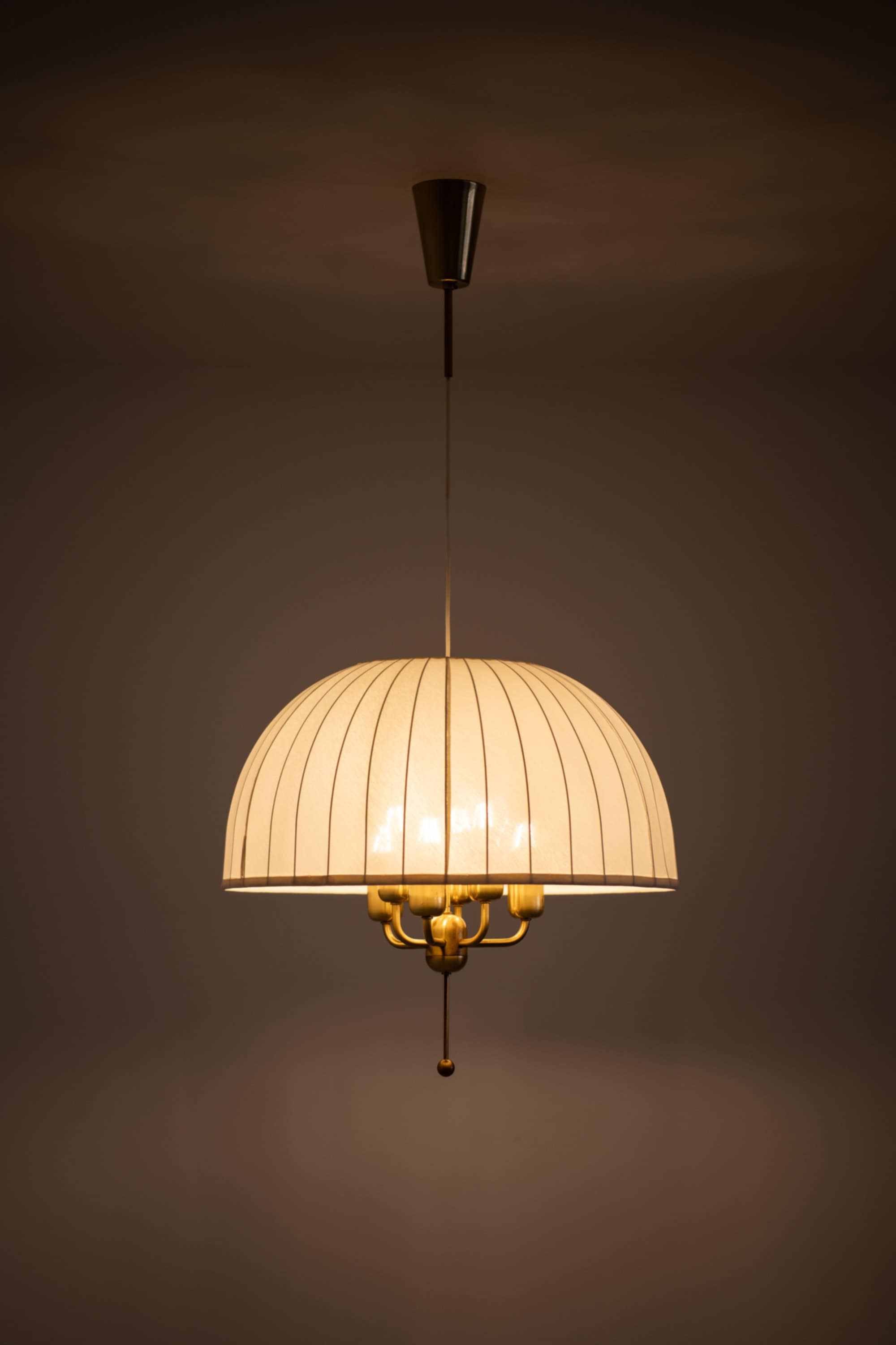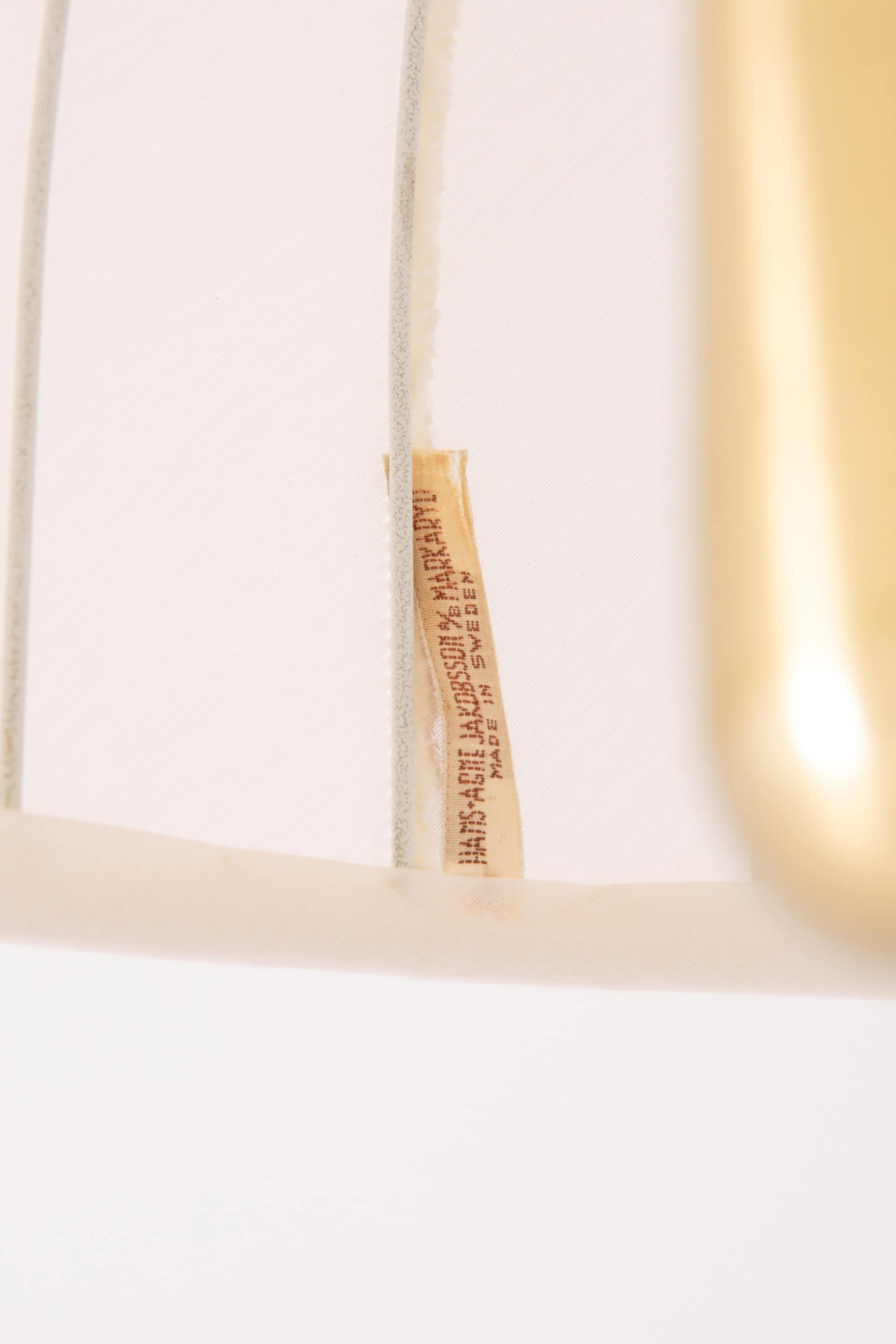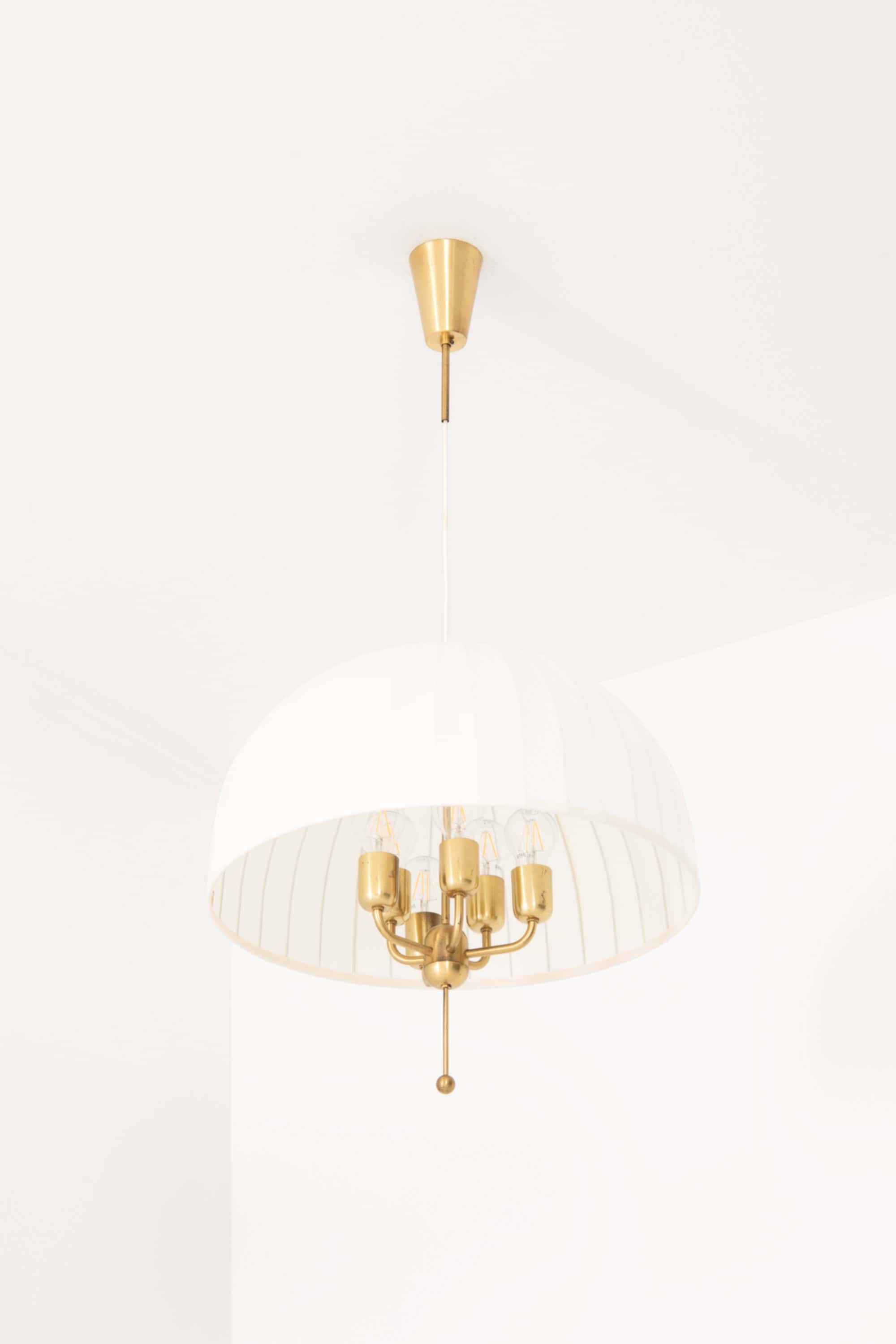 This elegant ceiling lamp, model T-549 “Carolin”, was designed by Hans-Agne Jakobsson and produced by Hans-Agne Jakobsson AB in Markaryd, Sweden during the 1950s. With its distinctive combination of a generous, softly domed shade and a refined brass chandelier structure, it captures the warm and atmospheric design language that defines Jakobsson’s lighting from the period.