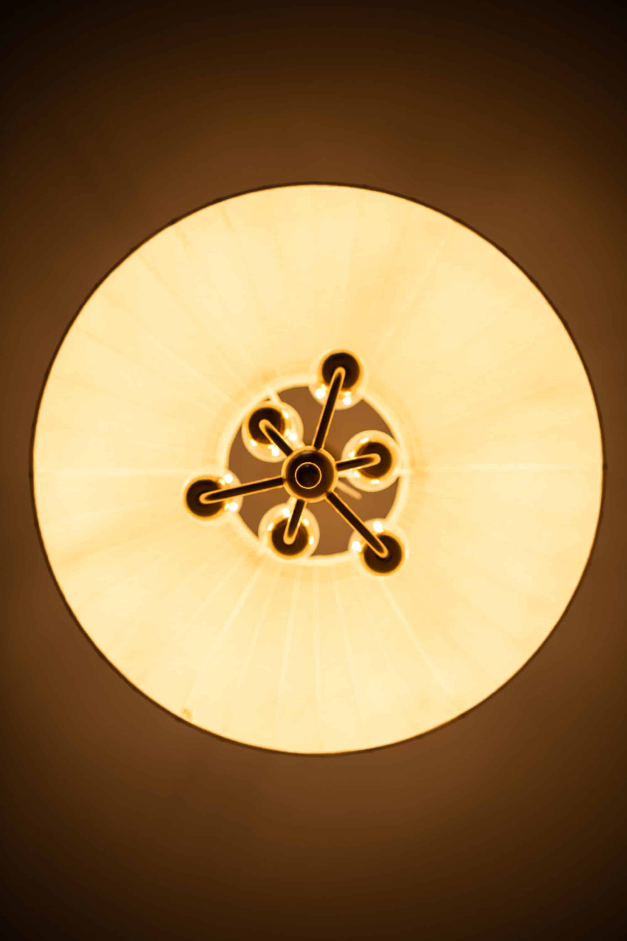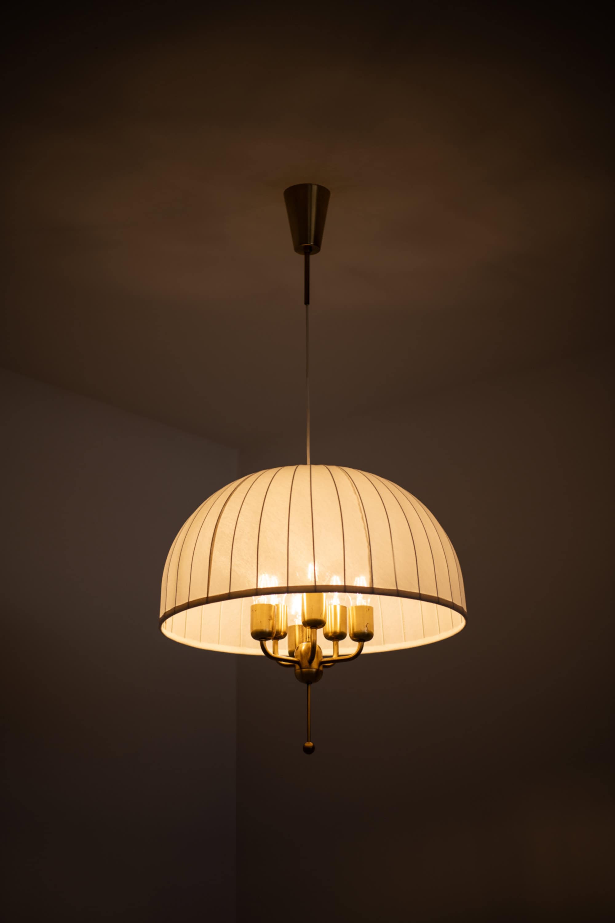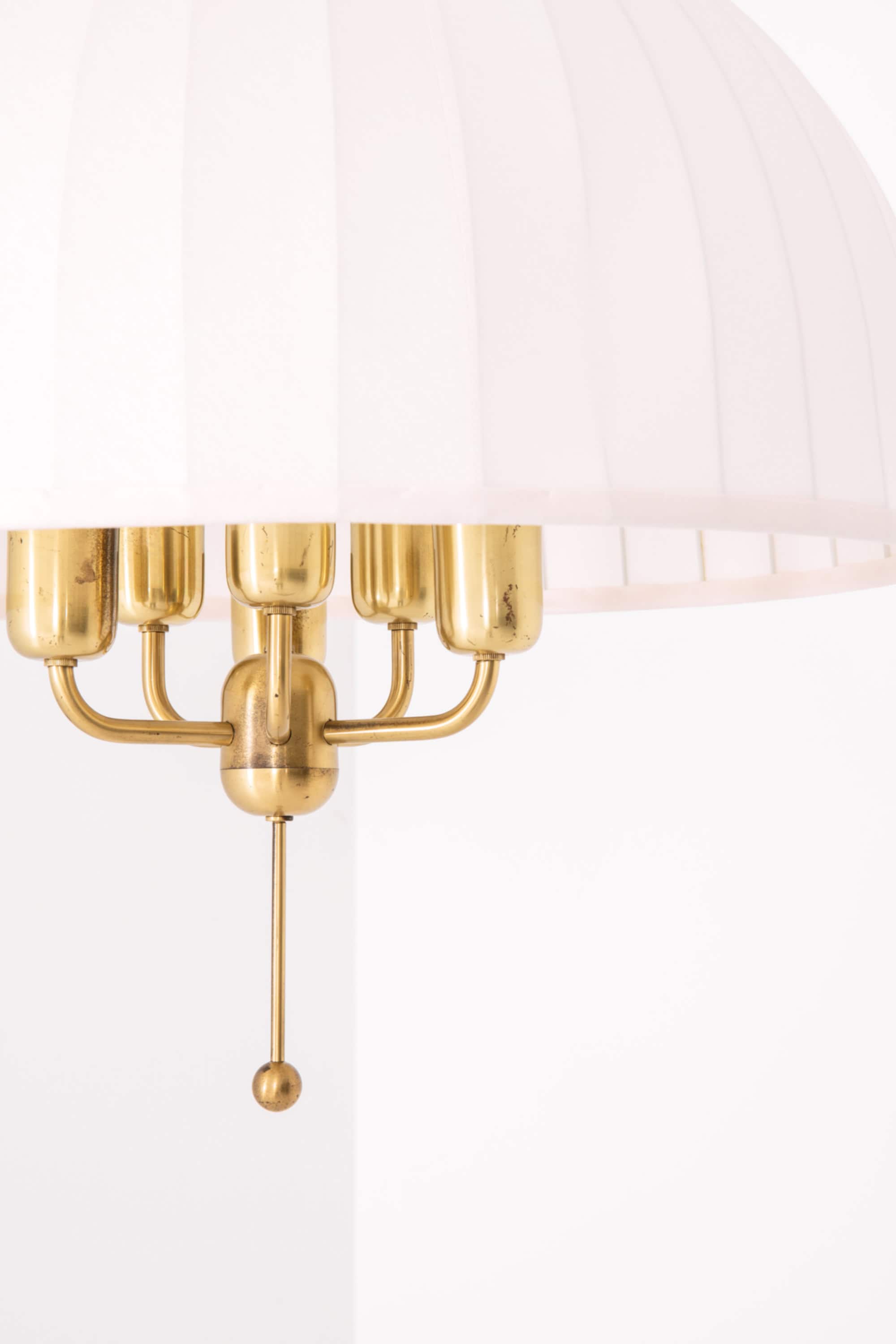 This elegant ceiling lamp, model T-549 “Carolin”, was designed by Hans-Agne Jakobsson and produced by Hans-Agne Jakobsson AB in Markaryd, Sweden during the 1950s. With its distinctive combination of a generous, softly domed shade and a refined brass chandelier structure, it captures the warm and atmospheric design language that defines Jakobsson’s lighting from the period.