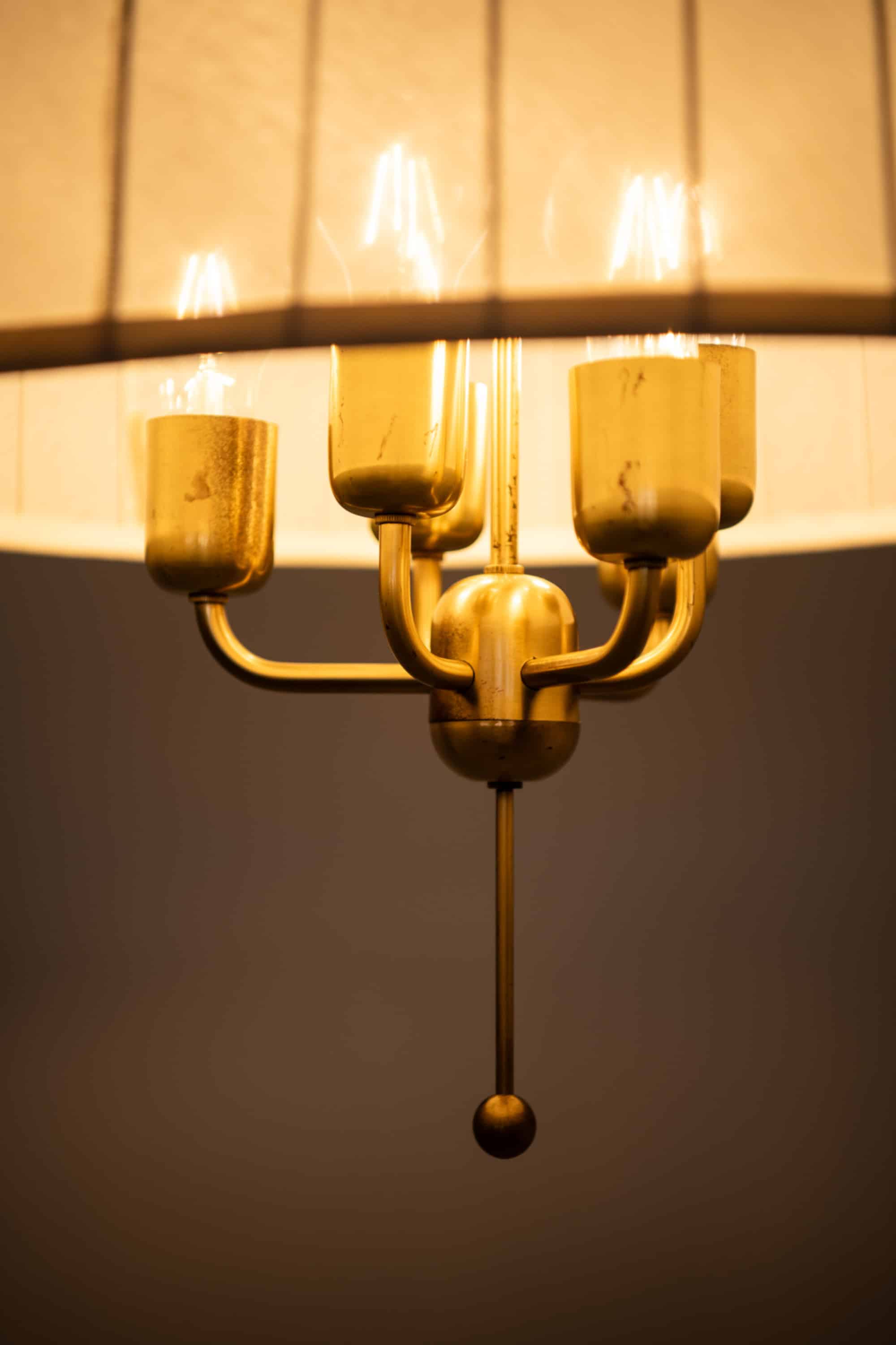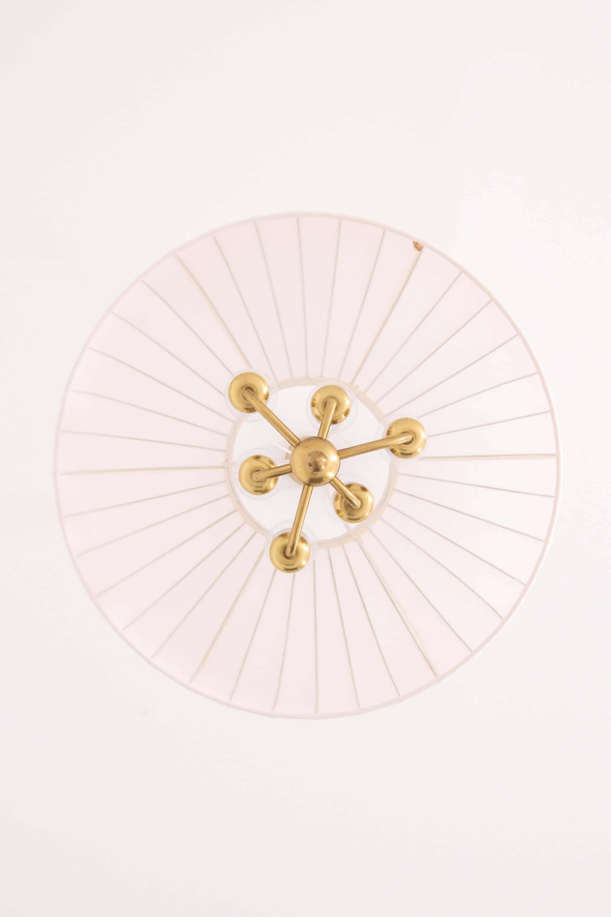 The lamp features a newly reupholstered shade in white fabric, stretched over a subtle ribbed framework that gives the surface a gentle rhythm and a calm architectural presence. When lit, the fabric shade produces a beautifully diffused glow, balancing functional illumination with an inviting, ambient warmth. Beneath the shade, the sculptural brass armature forms a classic multi-light arrangement, adding depth and character while maintaining a clean and well-proportioned silhouette.