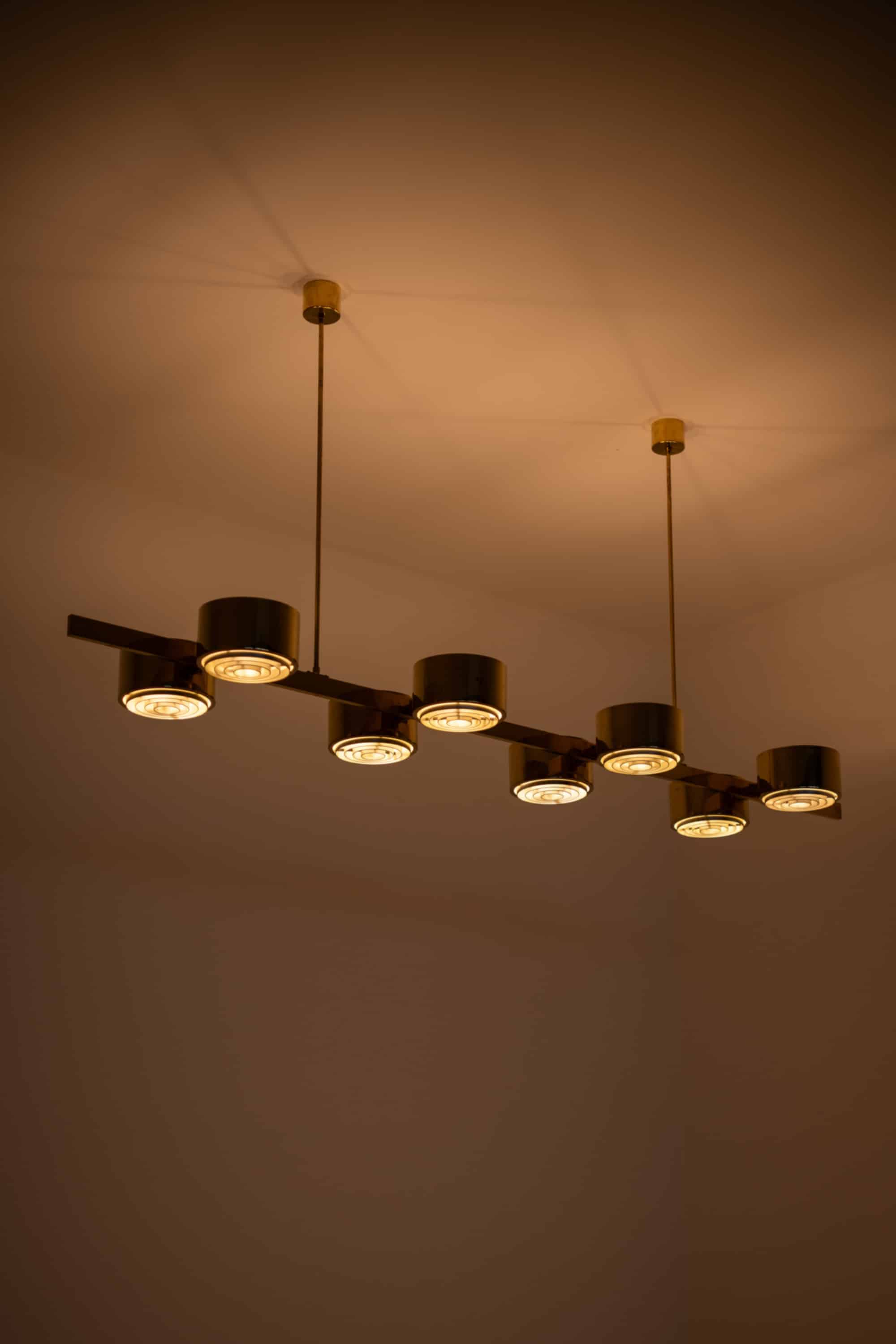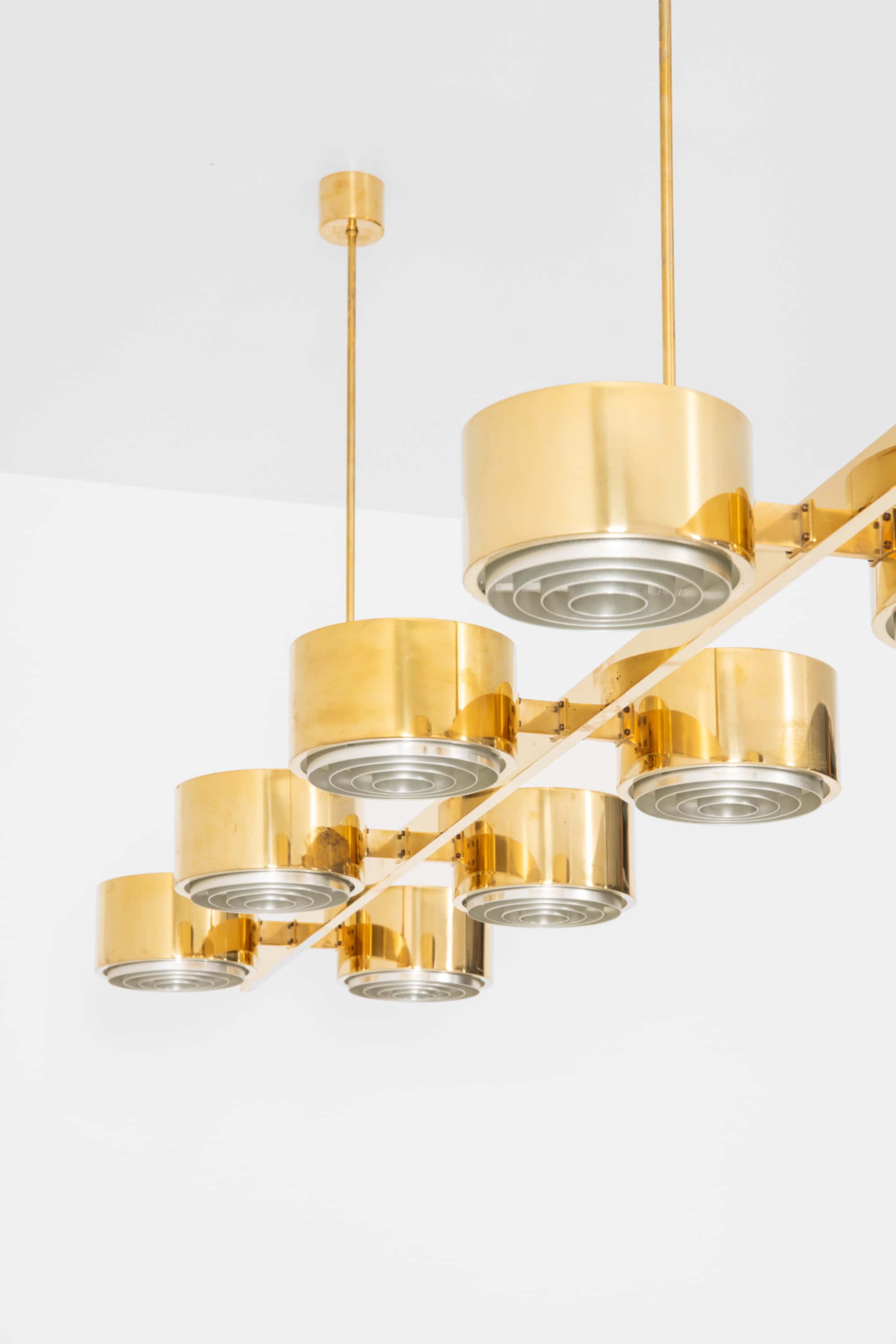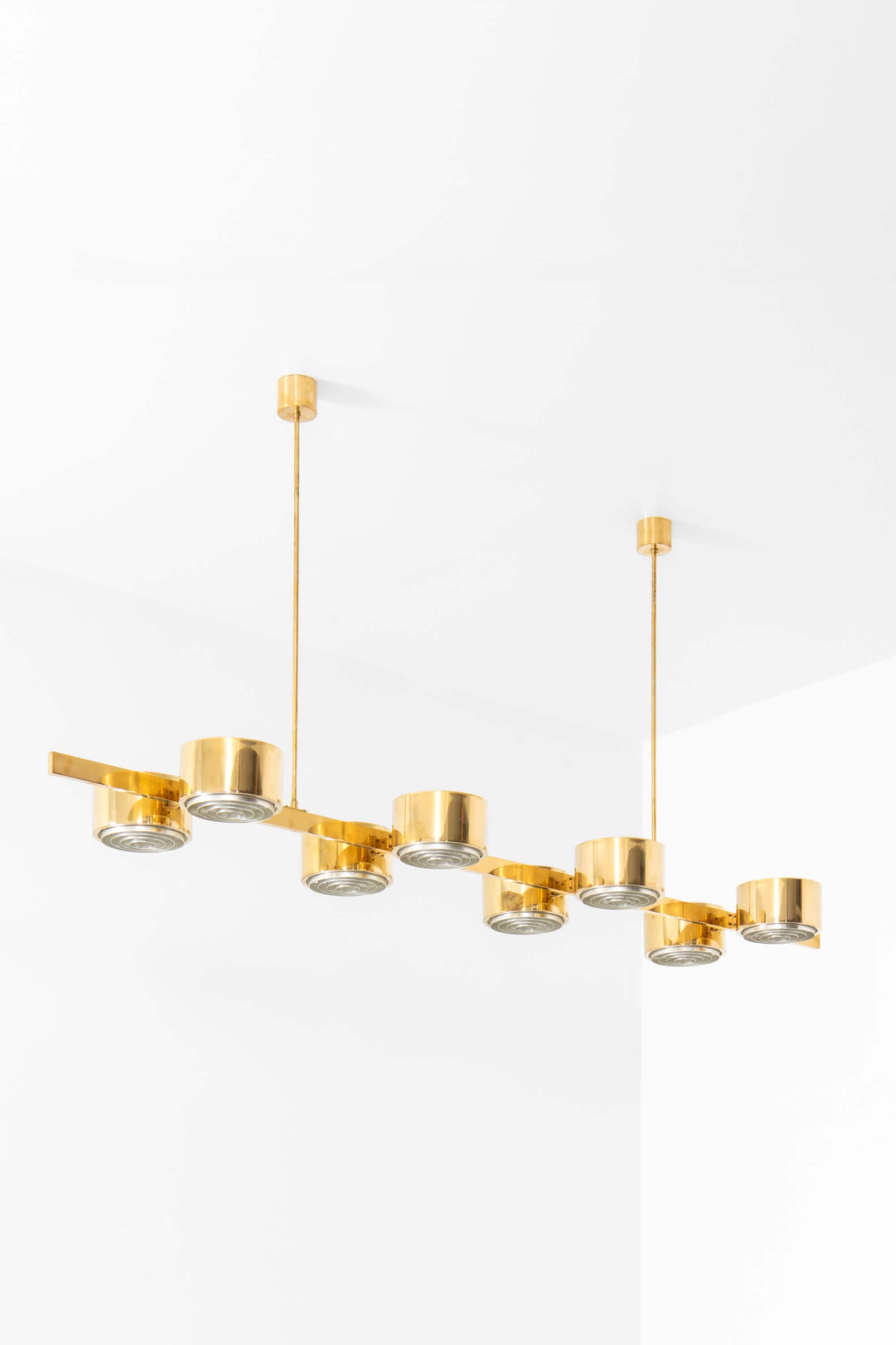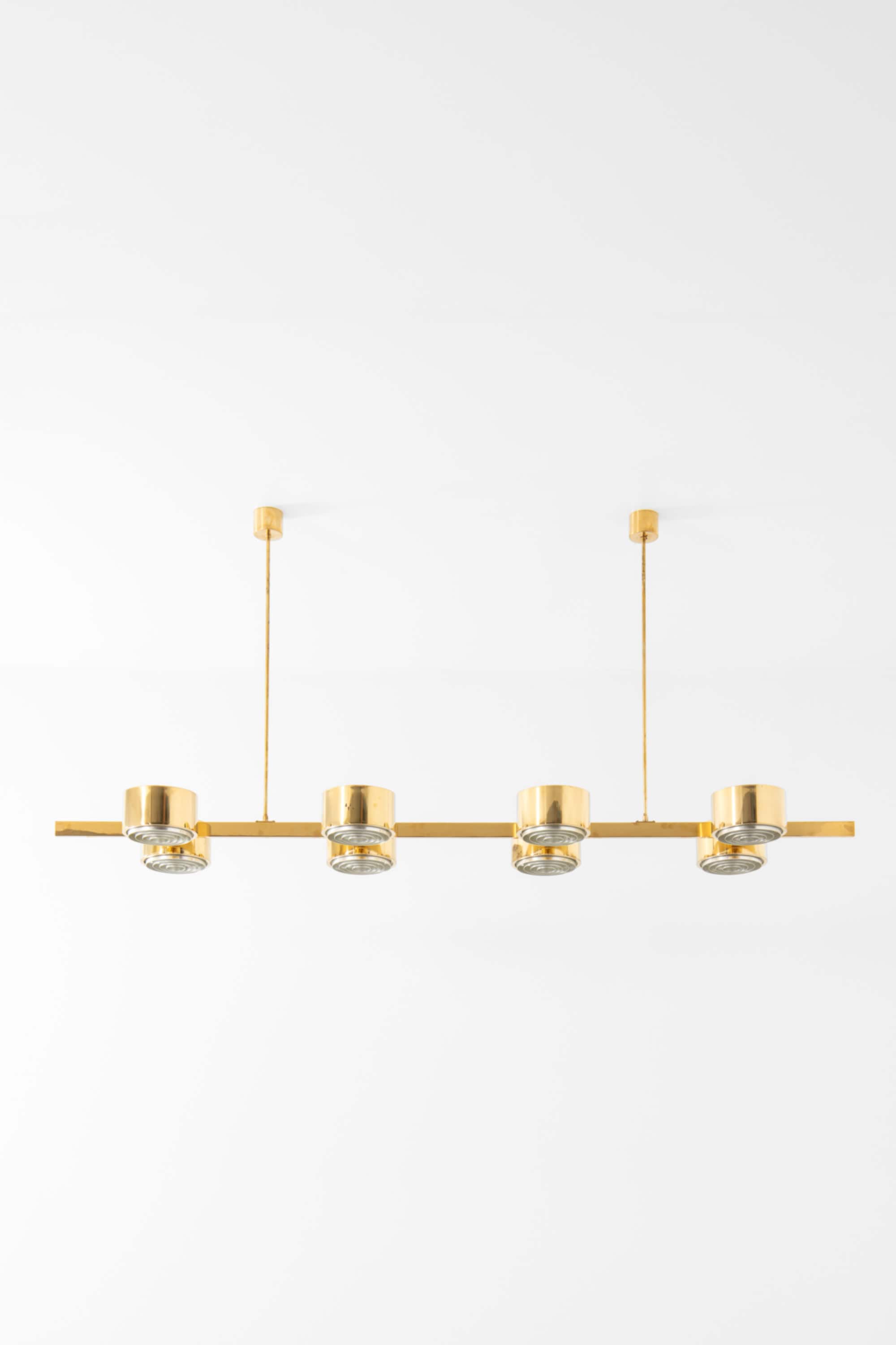 The construction is executed entirely in brass, with a long horizontal bar supporting eight cylindrical light units arranged symmetrically along the axis. Each cylinder houses a recessed light source combined with a concentric internal diffuser structure, creating a layered, circular pattern that softens and directs the light downward while minimizing glare. The brass surfaces have a warm golden tone, characteristic of Jakobsson’s work from this period, and interact subtly with the light, producing a restrained yet atmospheric illumination. The overall form is strictly geometric, emphasizing balance, rhythm, and linearity.