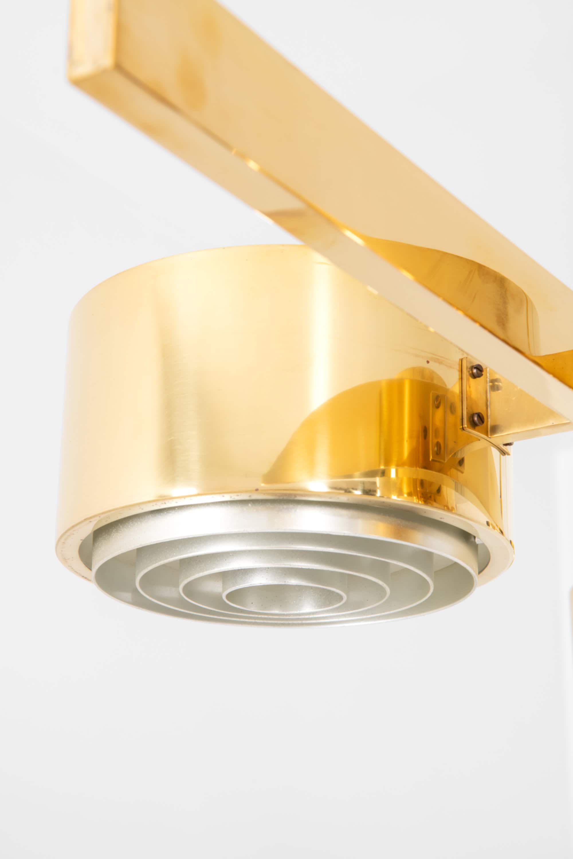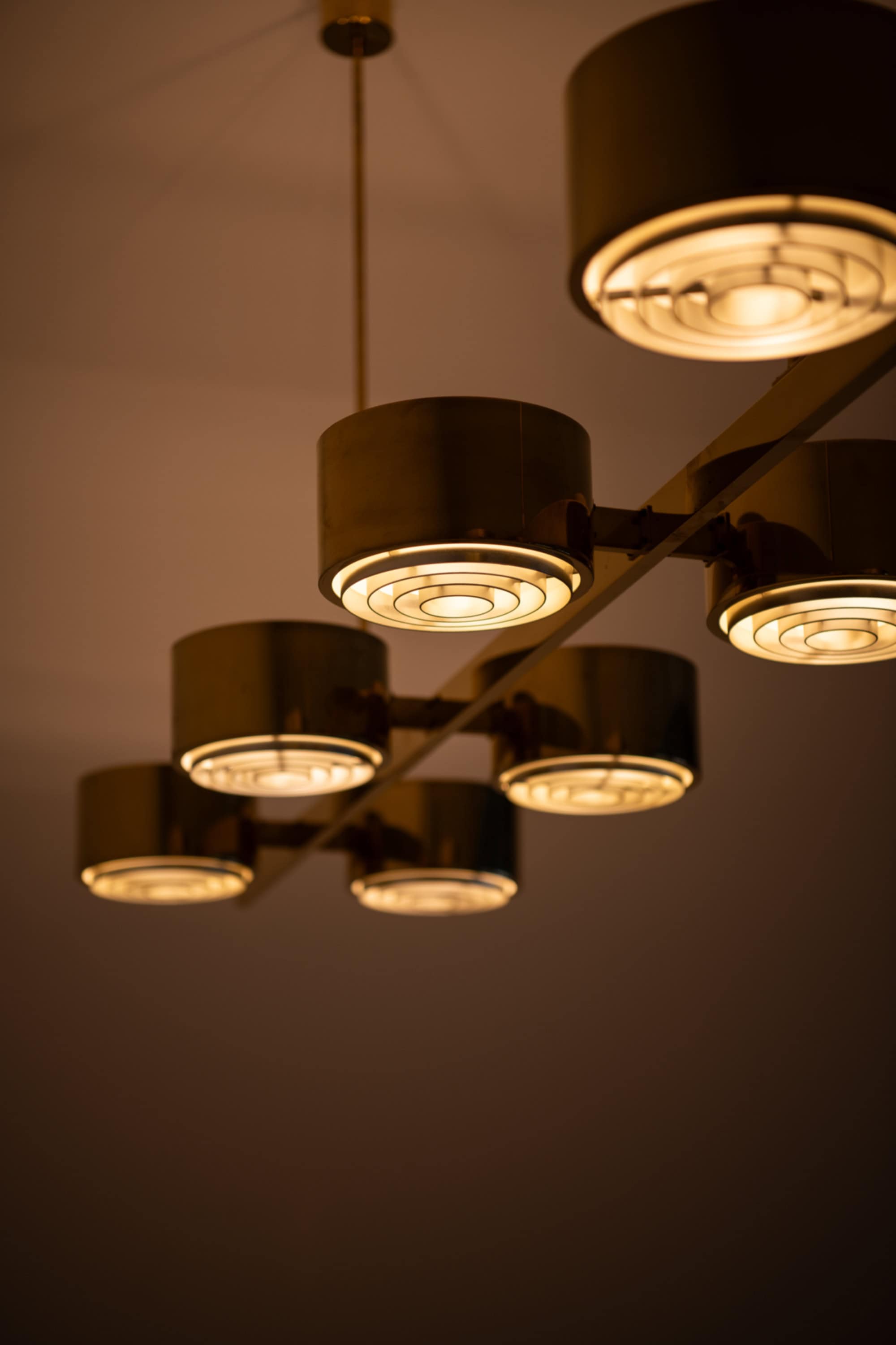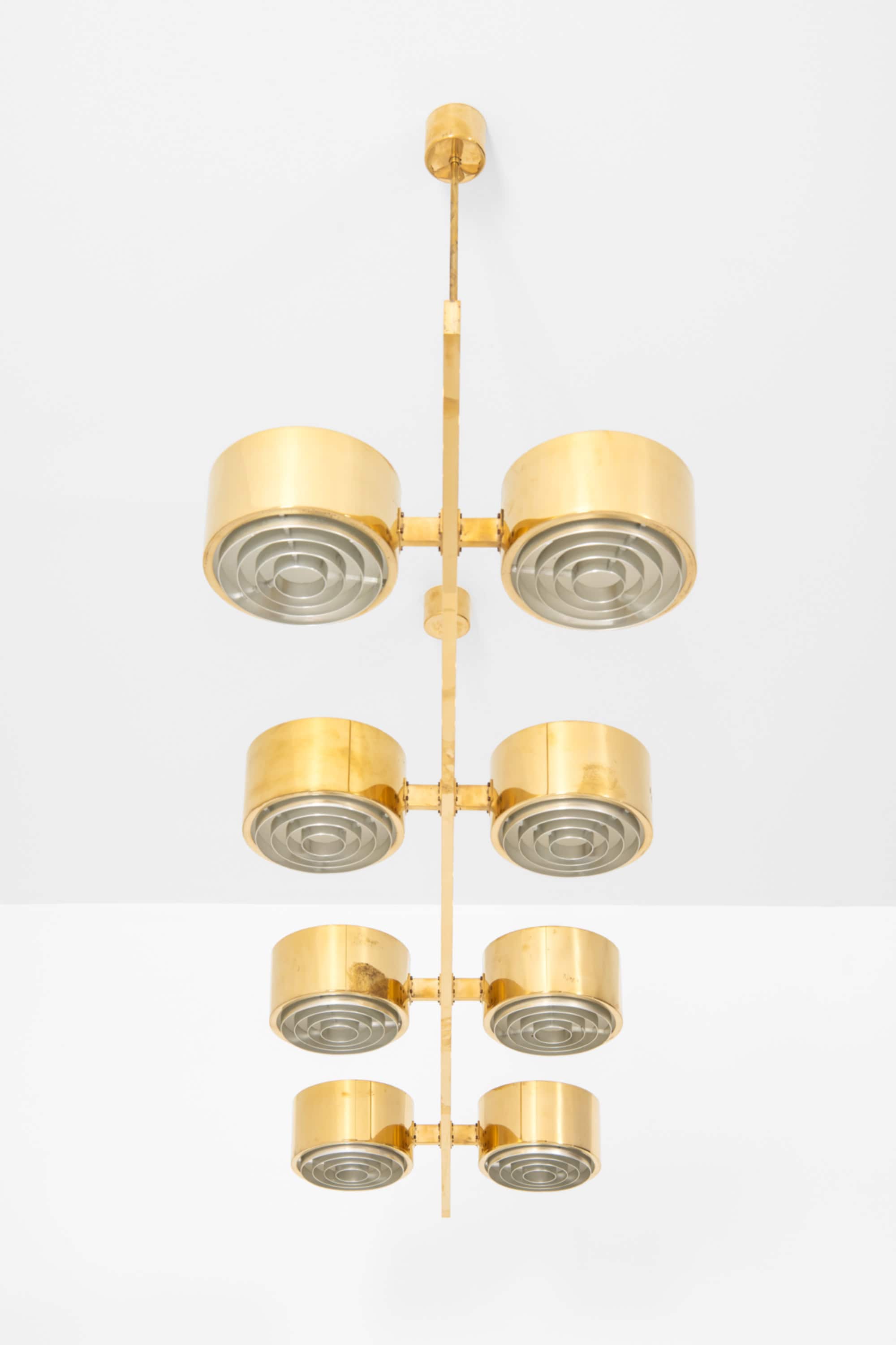 The construction is executed entirely in brass, with a long horizontal bar supporting eight cylindrical light units arranged symmetrically along the axis. Each cylinder houses a recessed light source combined with a concentric internal diffuser structure, creating a layered, circular pattern that softens and directs the light downward while minimizing glare. The brass surfaces have a warm golden tone, characteristic of Jakobsson’s work from this period, and interact subtly with the light, producing a restrained yet atmospheric illumination. The overall form is strictly geometric, emphasizing balance, rhythm, and linearity.