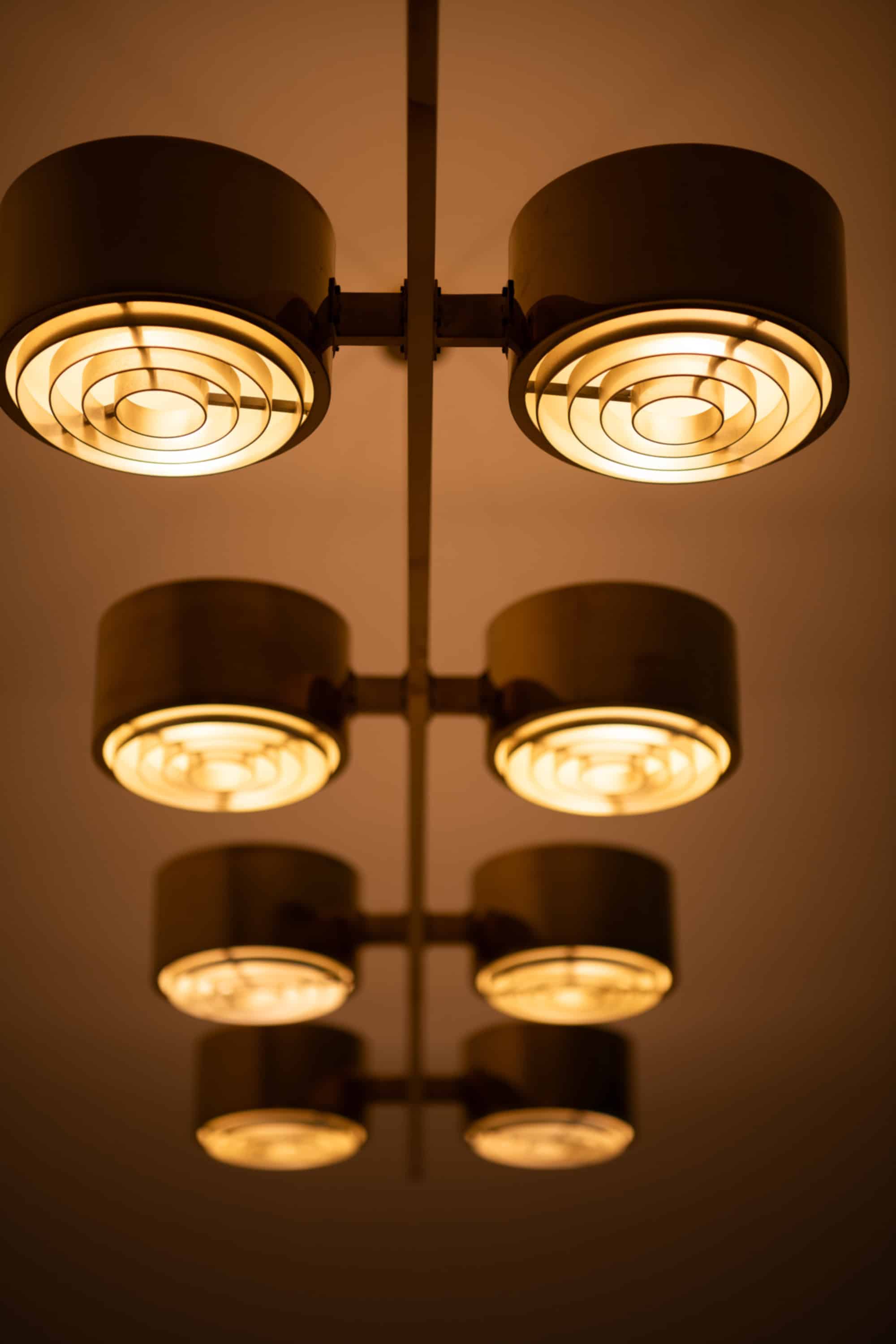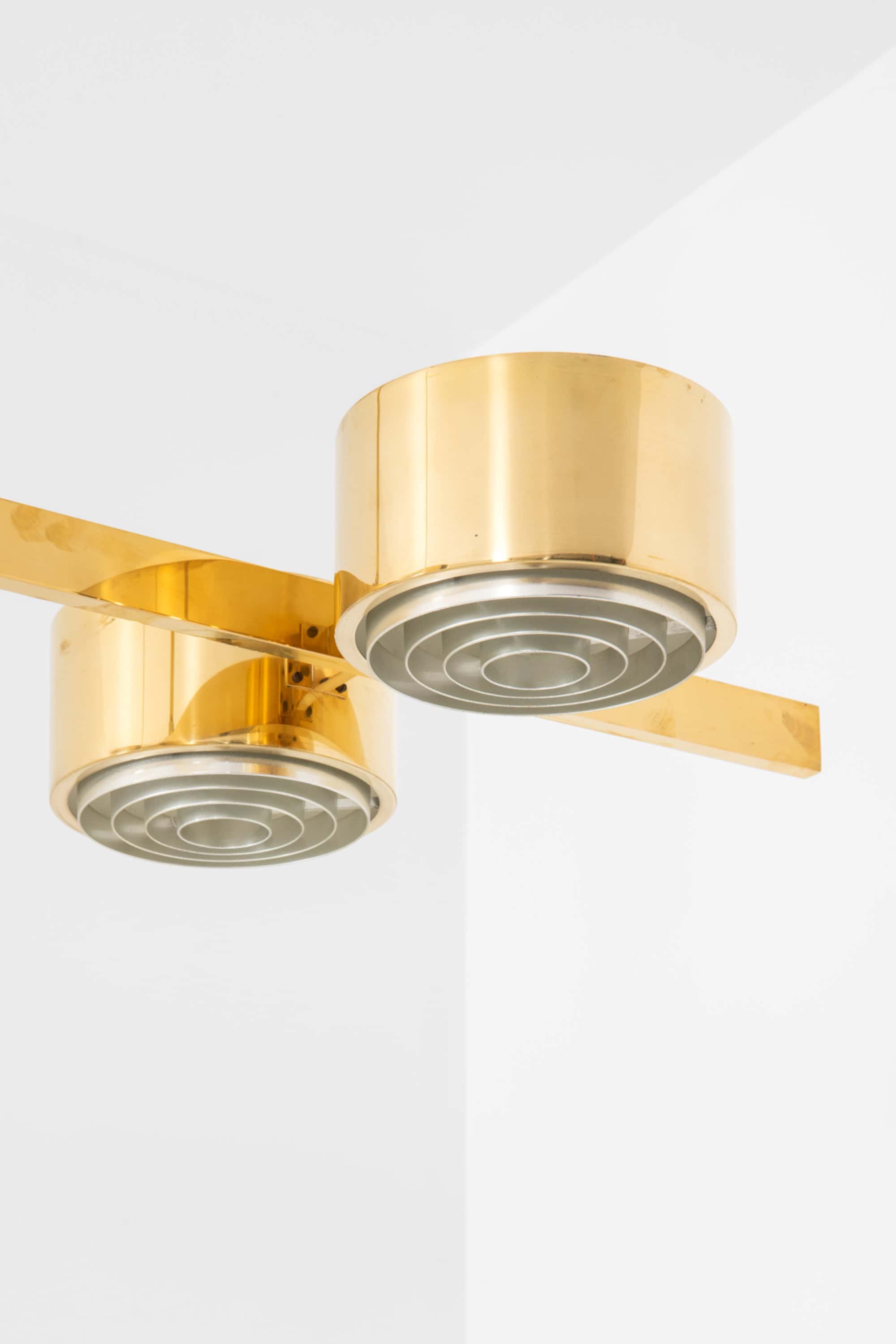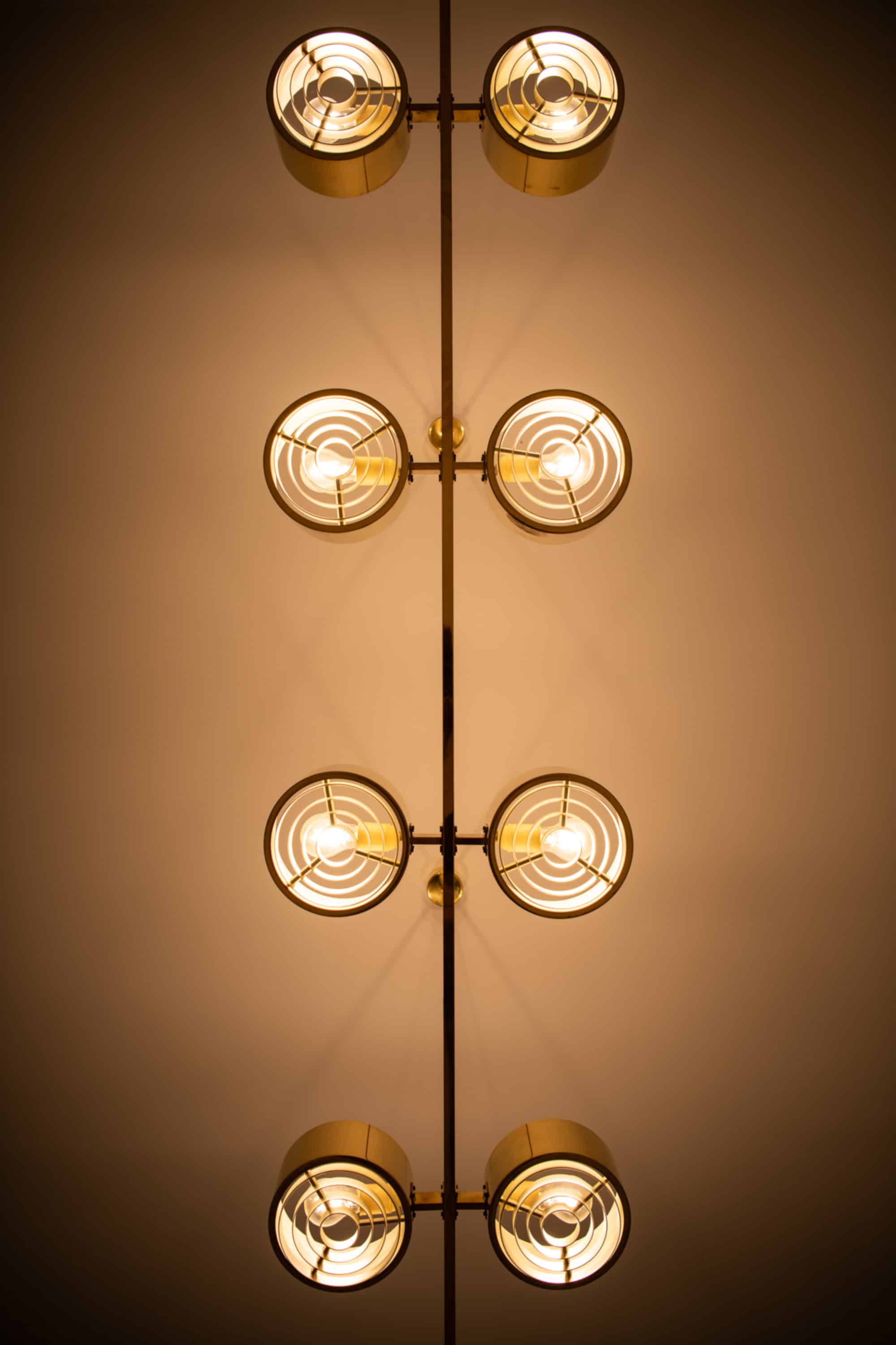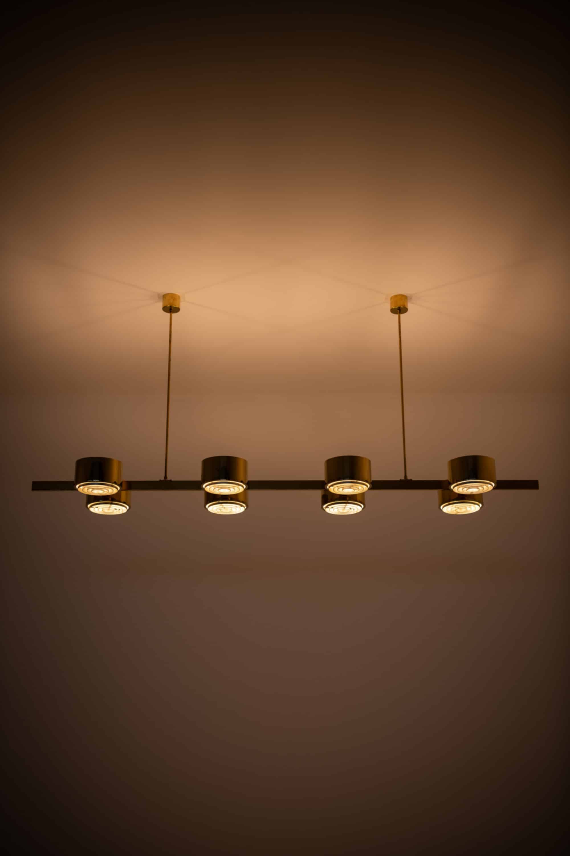 The construction is executed entirely in brass, with a long horizontal bar supporting eight cylindrical light units arranged symmetrically along the axis. Each cylinder houses a recessed light source combined with a concentric internal diffuser structure, creating a layered, circular pattern that softens and directs the light downward while minimizing glare. The brass surfaces have a warm golden tone, characteristic of Jakobsson’s work from this period, and interact subtly with the light, producing a restrained yet atmospheric illumination. The overall form is strictly geometric, emphasizing balance, rhythm, and linearity.