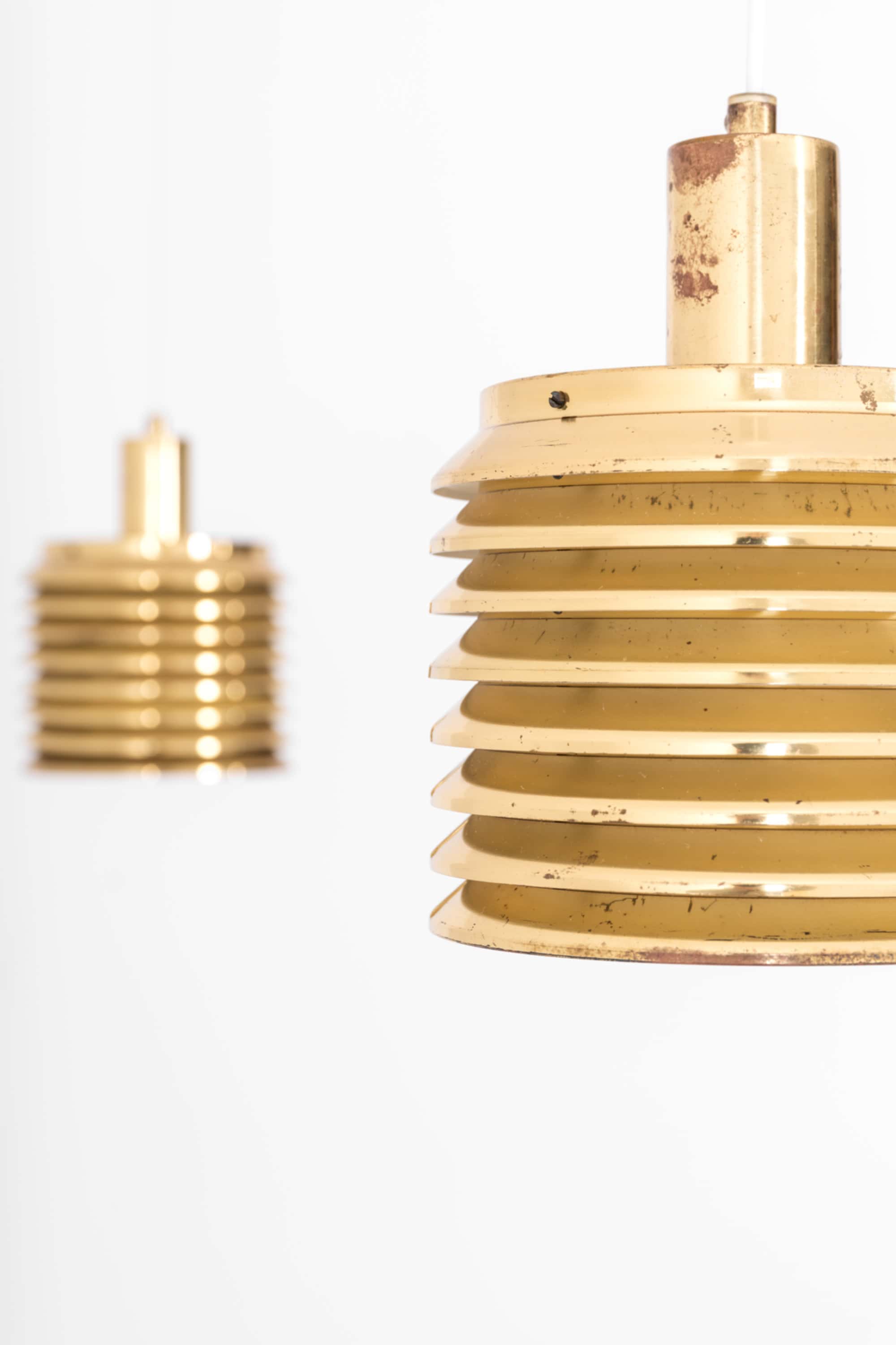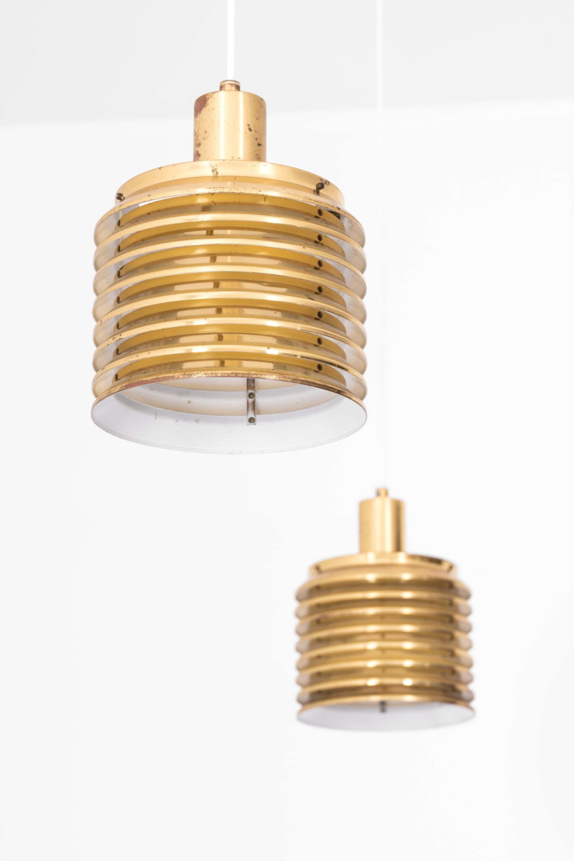 The lamps are executed in brass and composed of a cylindrical, tiered shade built from a series of horizontal slats. These concentric rings create a structured, architectural form while also serving a functional purpose, diffusing the light and reducing glare. The brass surfaces have developed a natural patina over time, with visible signs of age that enhance the character and authenticity of the pieces.