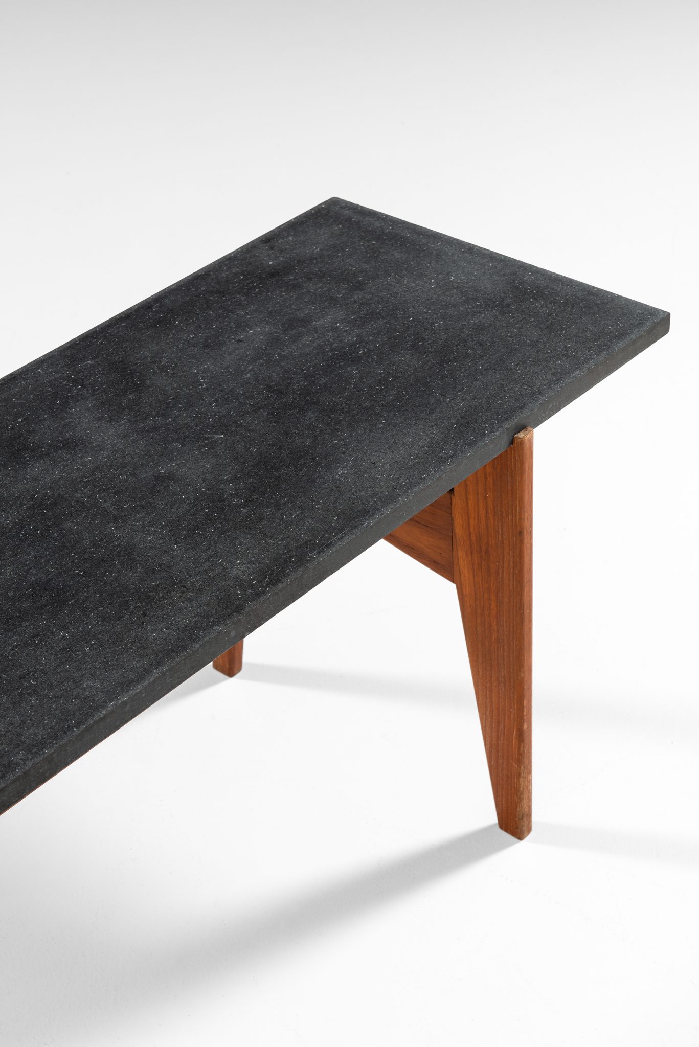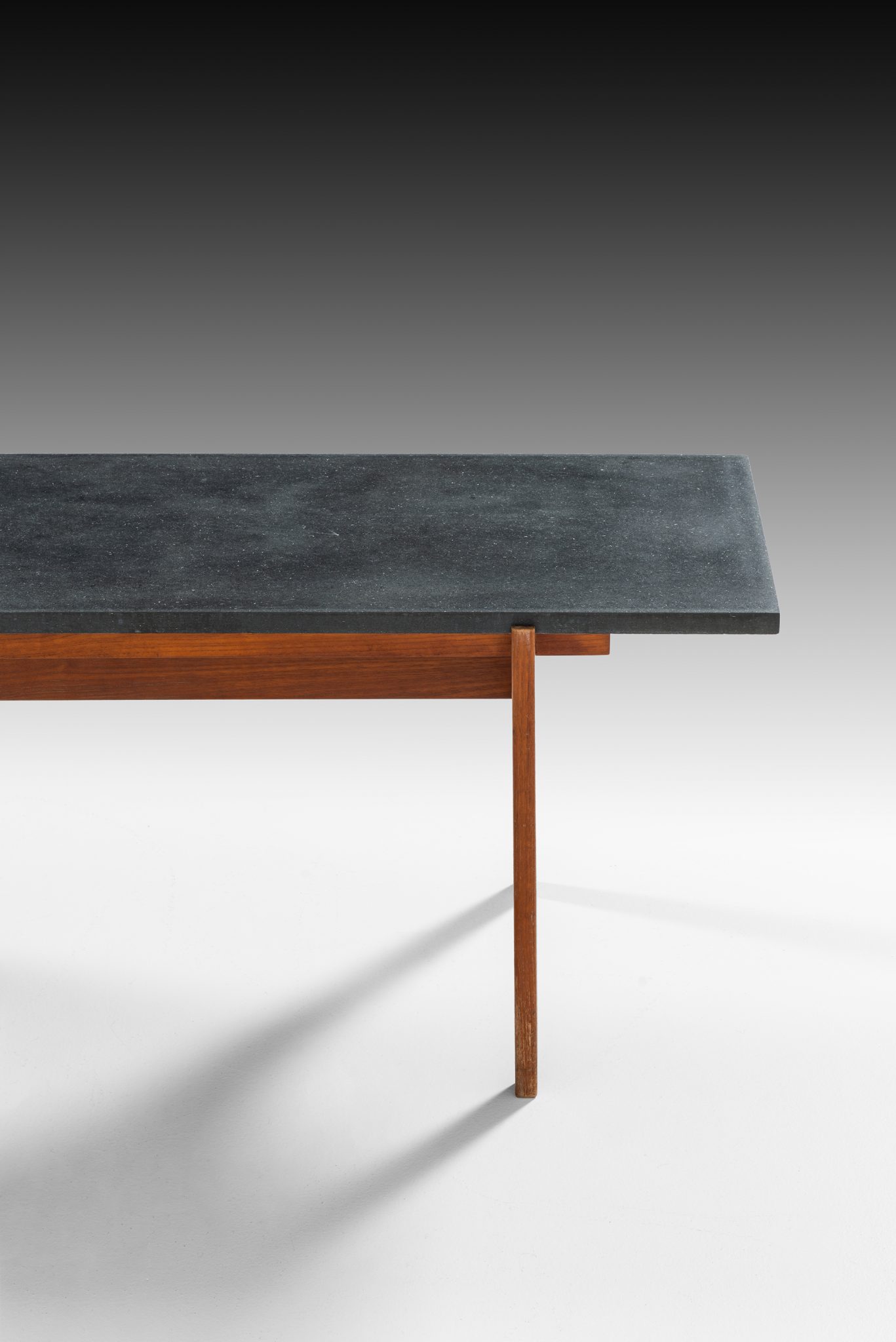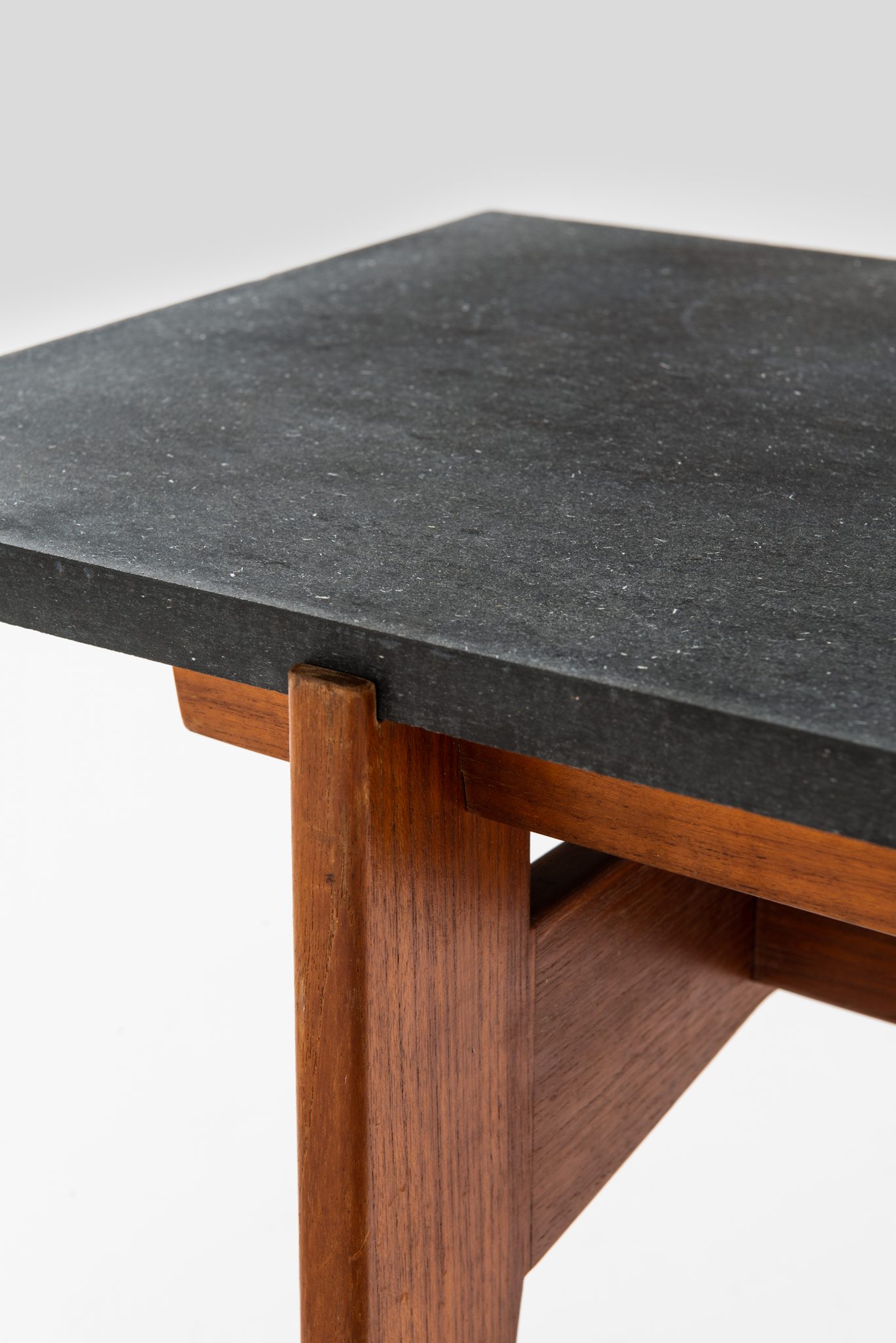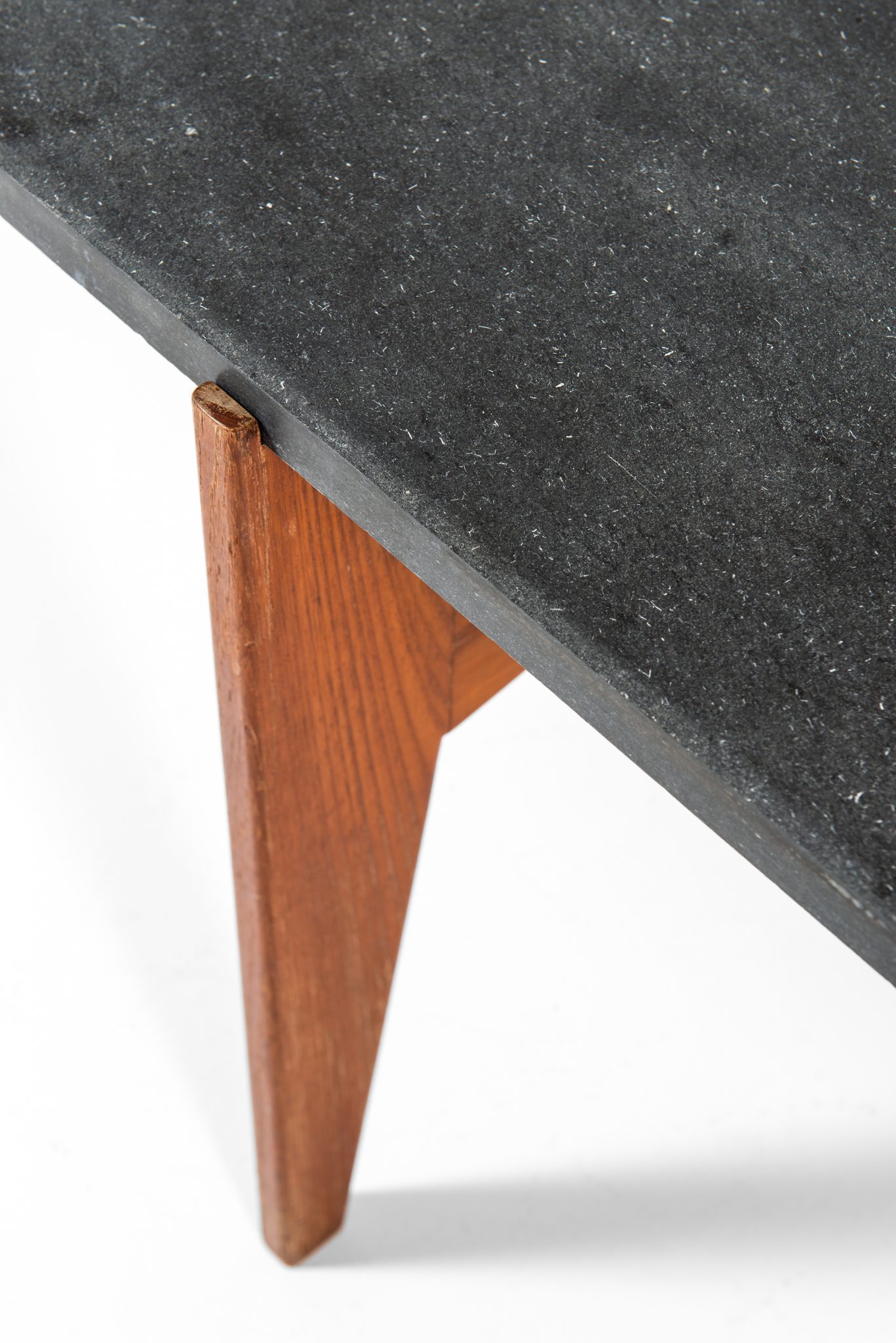 The table features a striking contrast between the dark, matte grey stone top and the warm, rich tones of the teak wood base. The stone top offers a sophisticated, sleek surface, while the teak legs are sharply tapered, enhancing the modernist appeal of the piece. The design is minimalist yet functional, typical of mid-century Scandinavian aesthetics, focusing on simple geometric forms that are both visually appealing and practical.