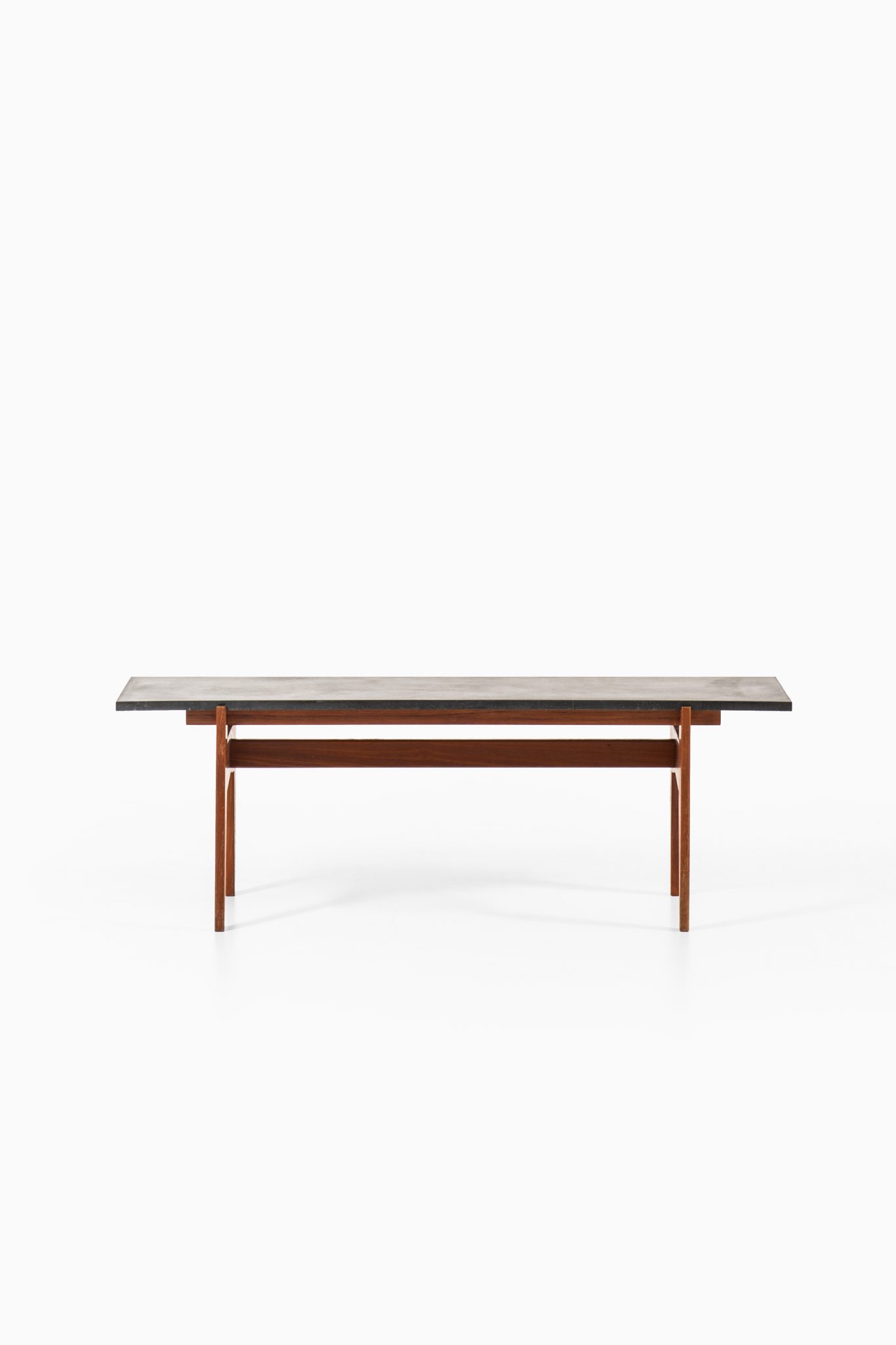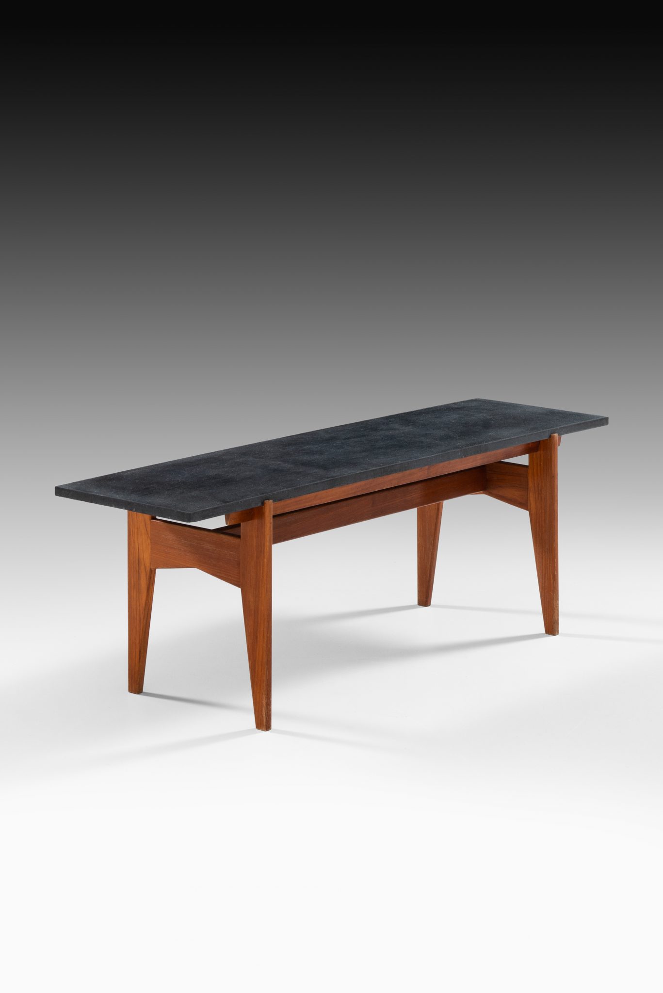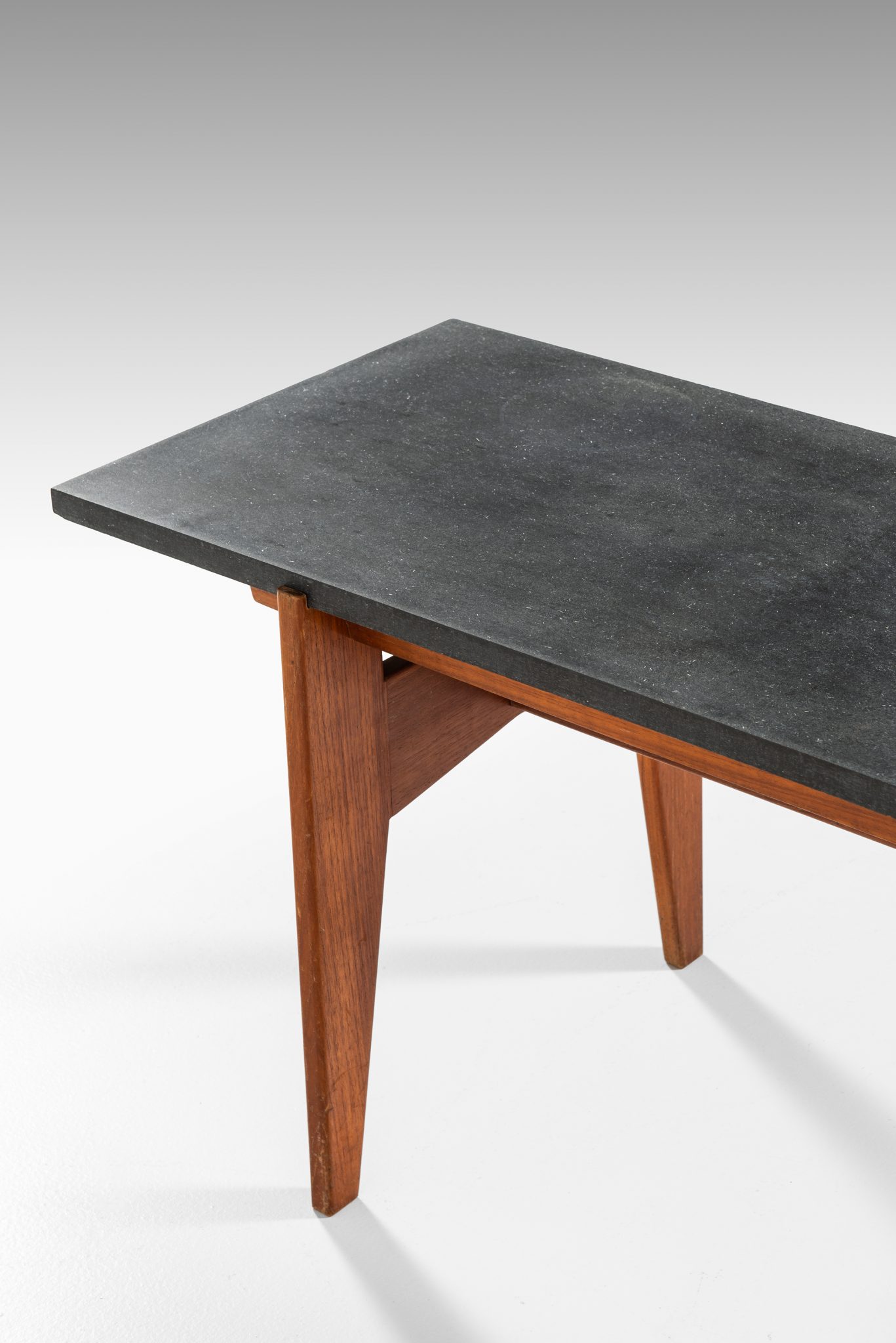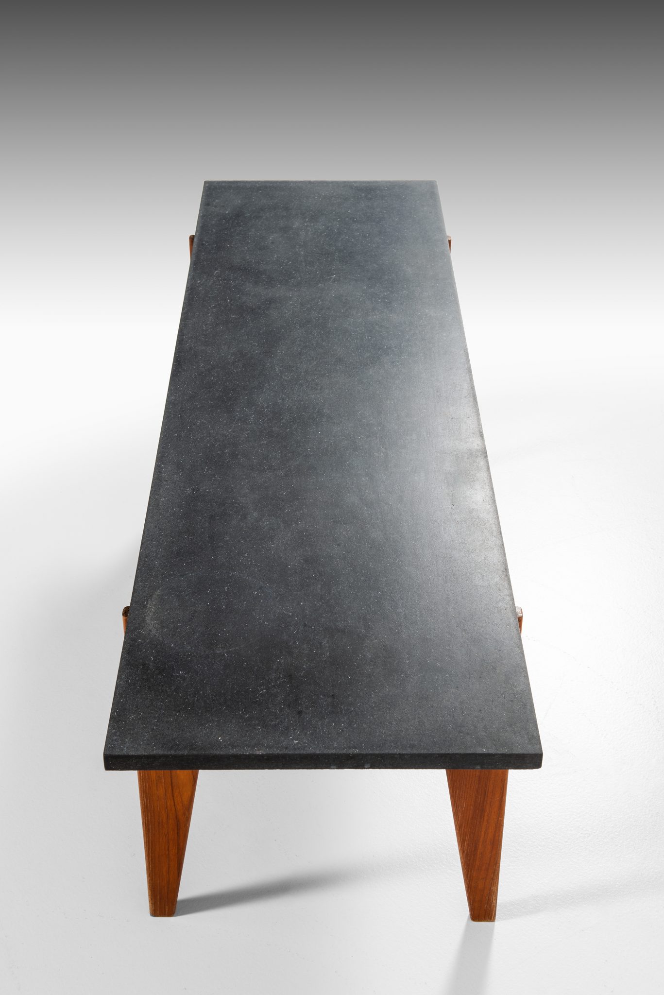 The table features a striking contrast between the dark, matte grey stone top and the warm, rich tones of the teak wood base. The stone top offers a sophisticated, sleek surface, while the teak legs are sharply tapered, enhancing the modernist appeal of the piece. The design is minimalist yet functional, typical of mid-century Scandinavian aesthetics, focusing on simple geometric forms that are both visually appealing and practical.