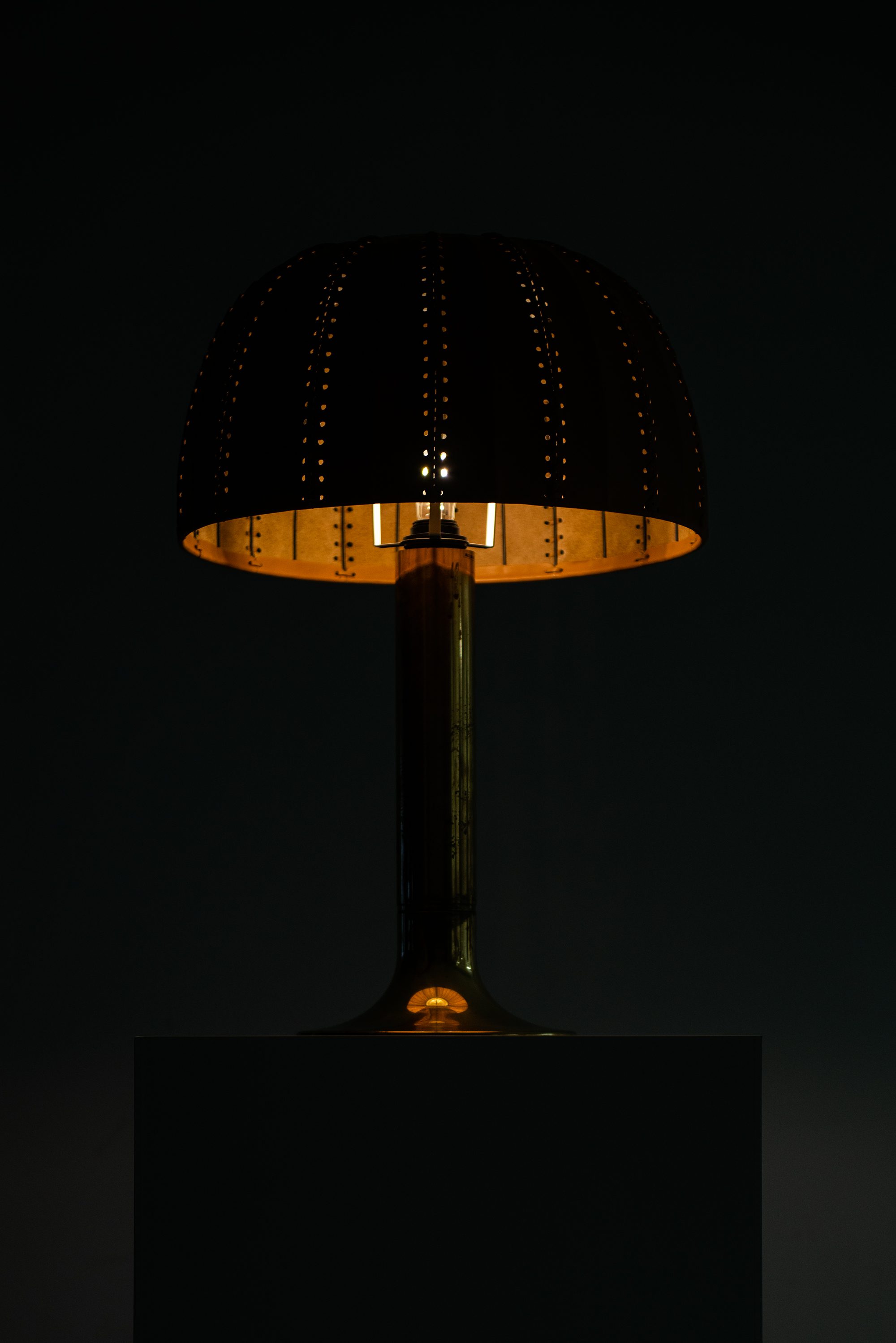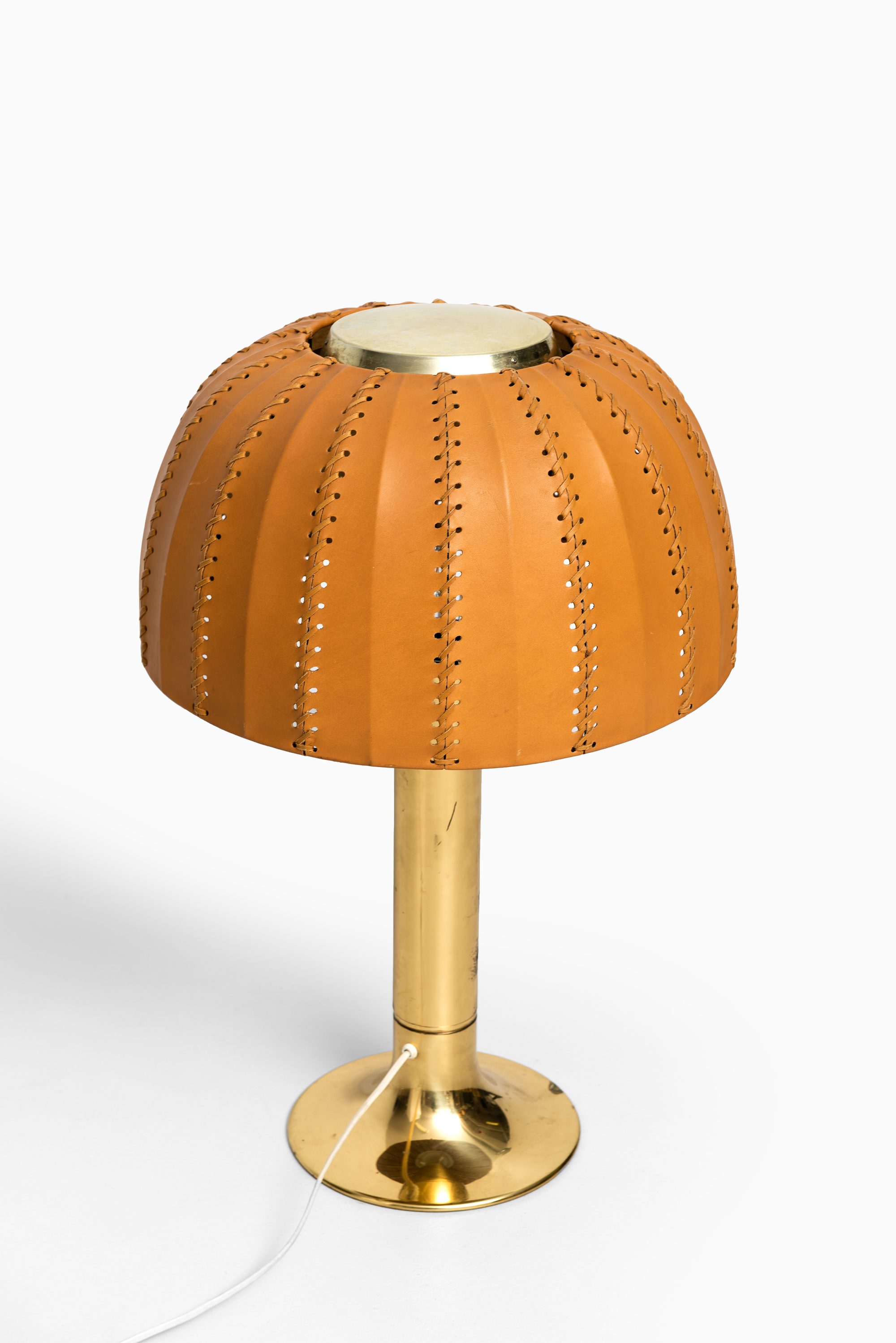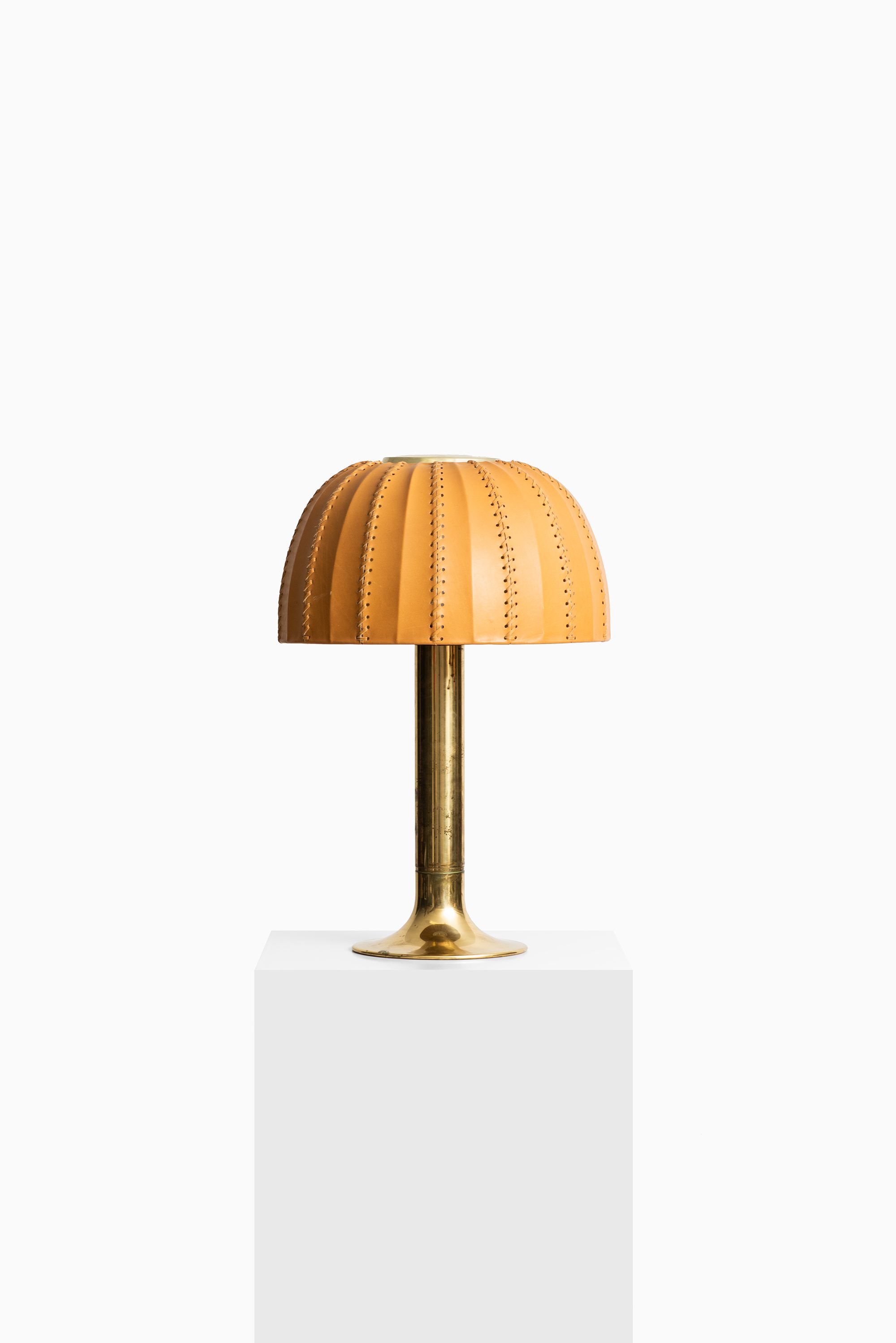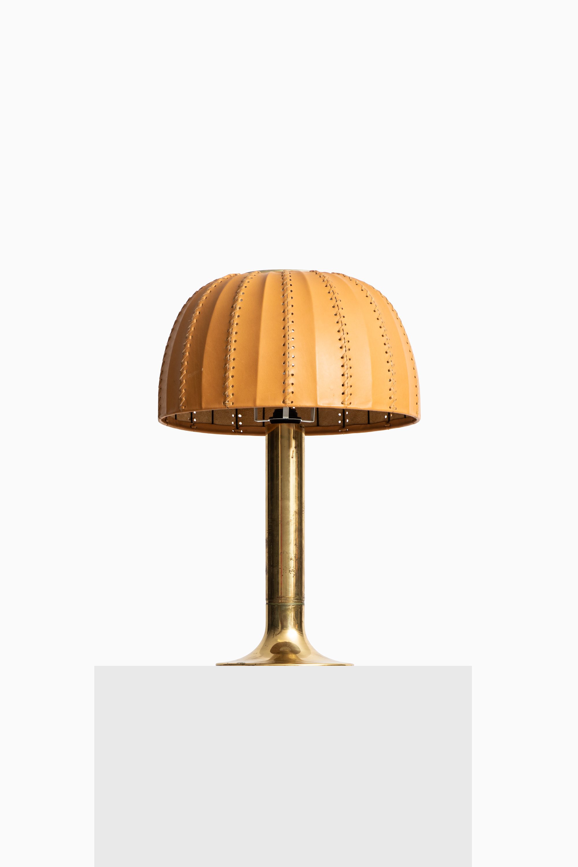 The rare table lamp model B-204/31 Carolin was designed in 1963 by Hans-Agne Jakobsson and produced by his company Hans-Agne Jakobsson AB in Markaryd, Sweden. It features a cylindrical brass stem that flares at the base and supports an original dome-shaped leather lampshade. The shade is crafted from natural tan leather panels, stitched together along vertical seams, with perforations along the inner edges that contribute to a distinctive handcrafted character. The dome form provides a soft diffusion of light while highlighting the material’s texture.