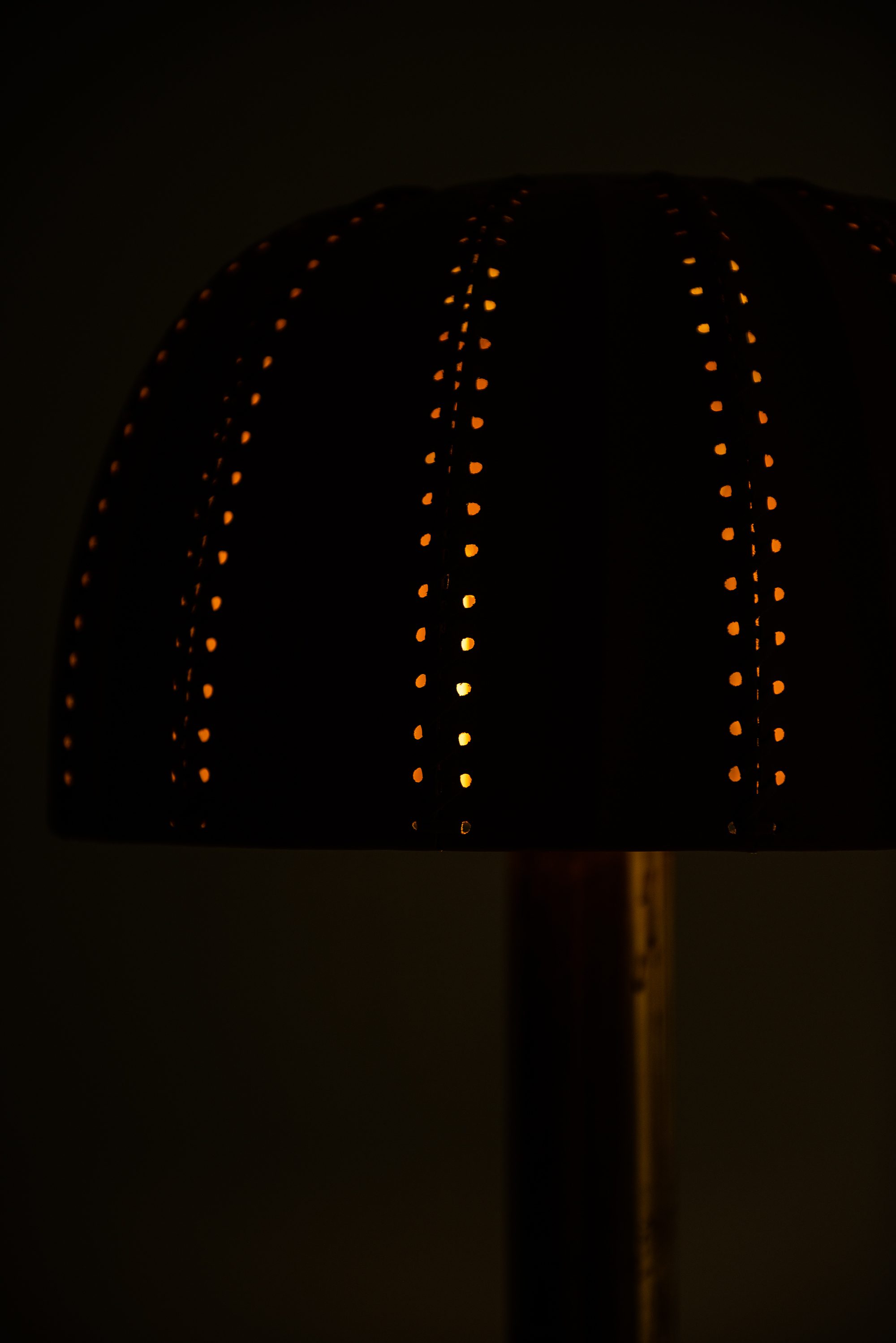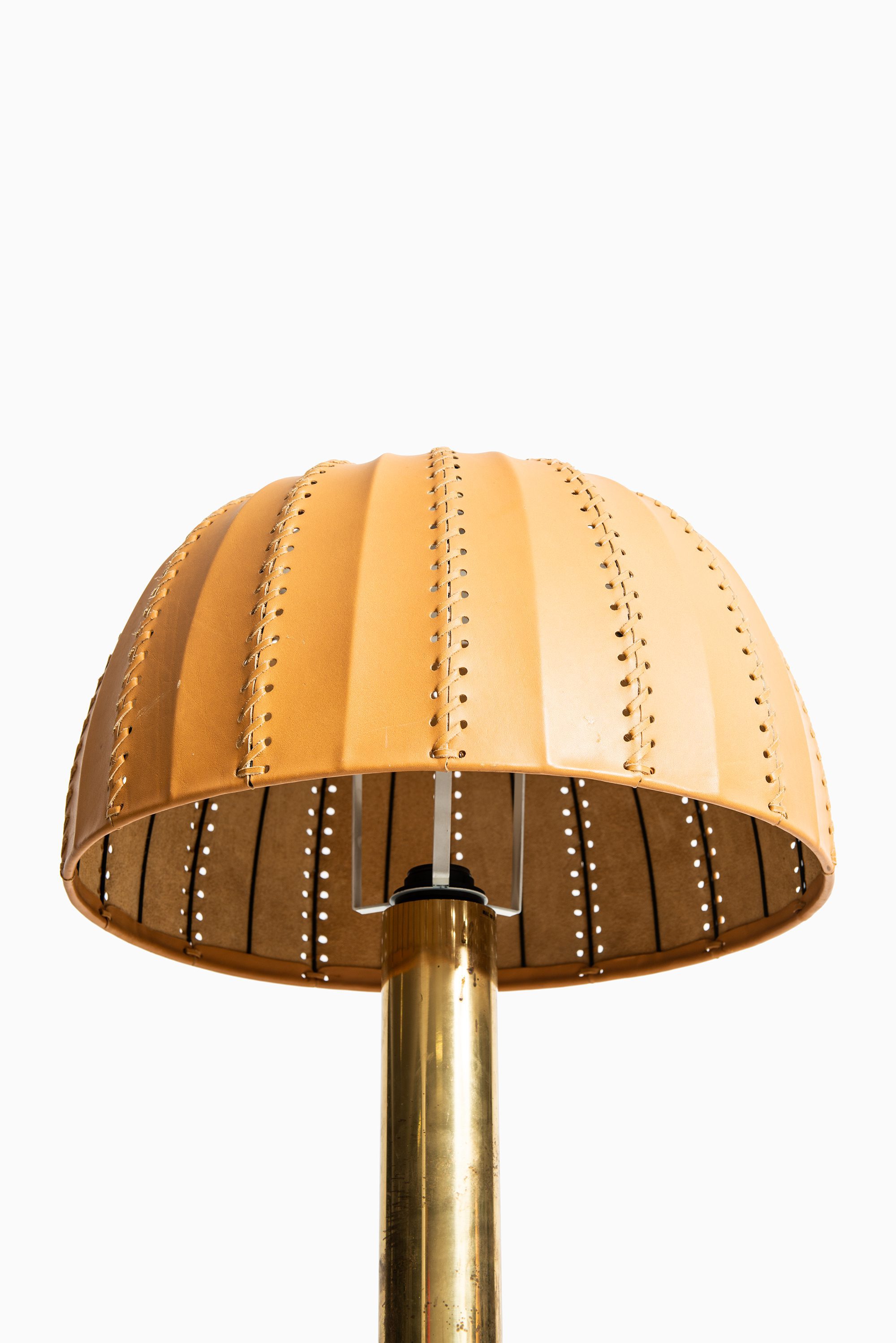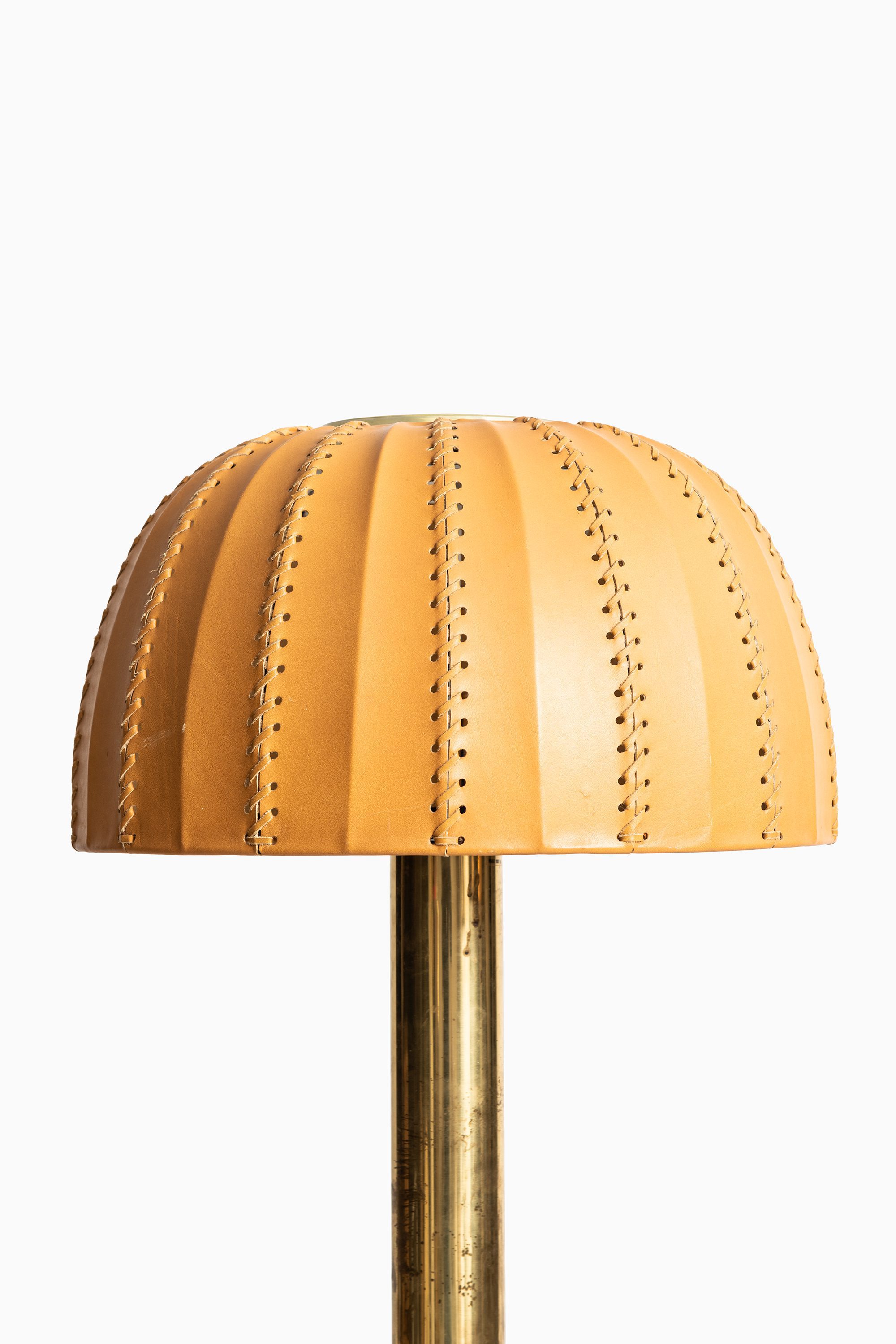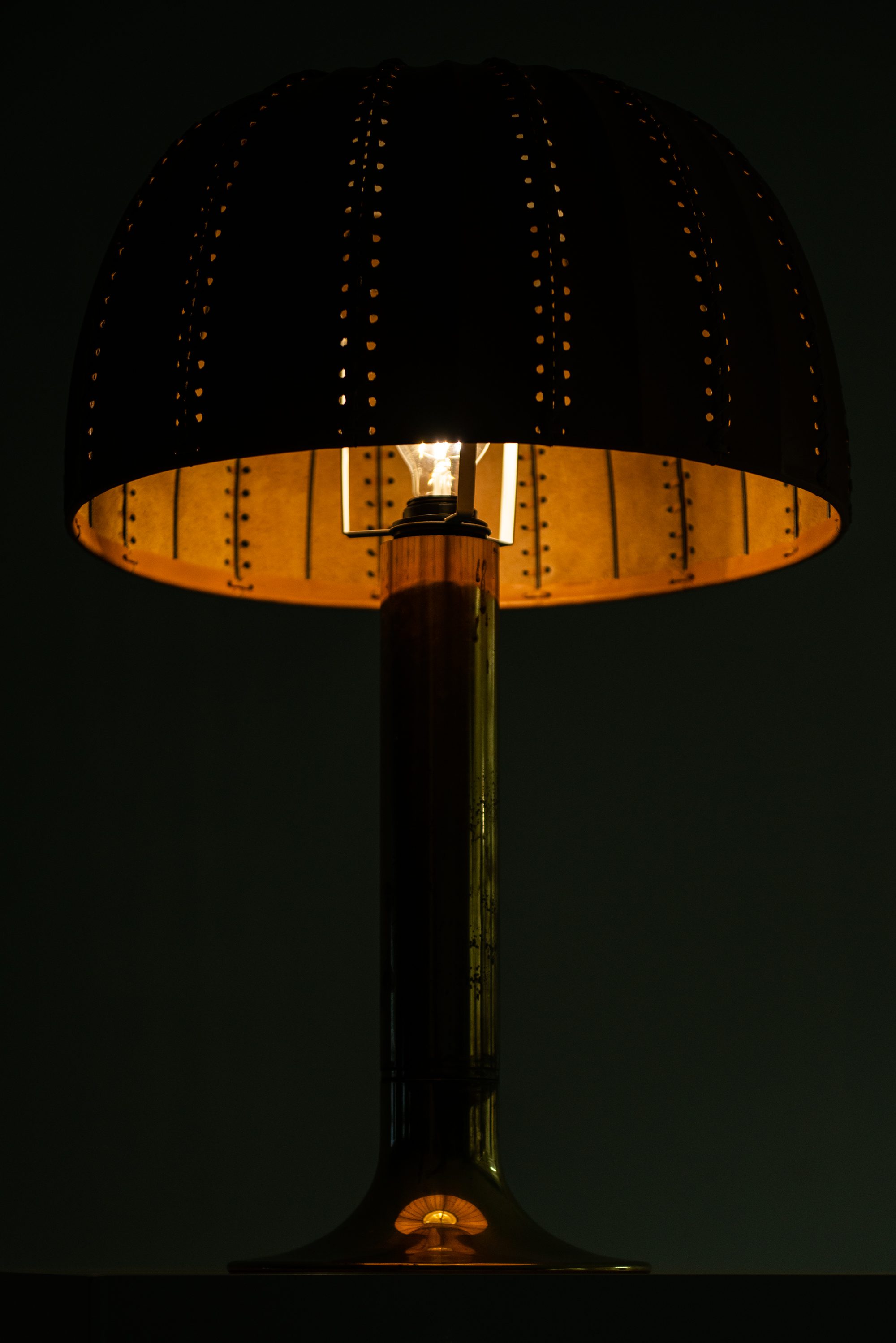 The rare table lamp model B-204/31 Carolin was designed in 1963 by Hans-Agne Jakobsson and produced by his company Hans-Agne Jakobsson AB in Markaryd, Sweden. It features a cylindrical brass stem that flares at the base and supports an original dome-shaped leather lampshade. The shade is crafted from natural tan leather panels, stitched together along vertical seams, with perforations along the inner edges that contribute to a distinctive handcrafted character. The dome form provides a soft diffusion of light while highlighting the material’s texture.