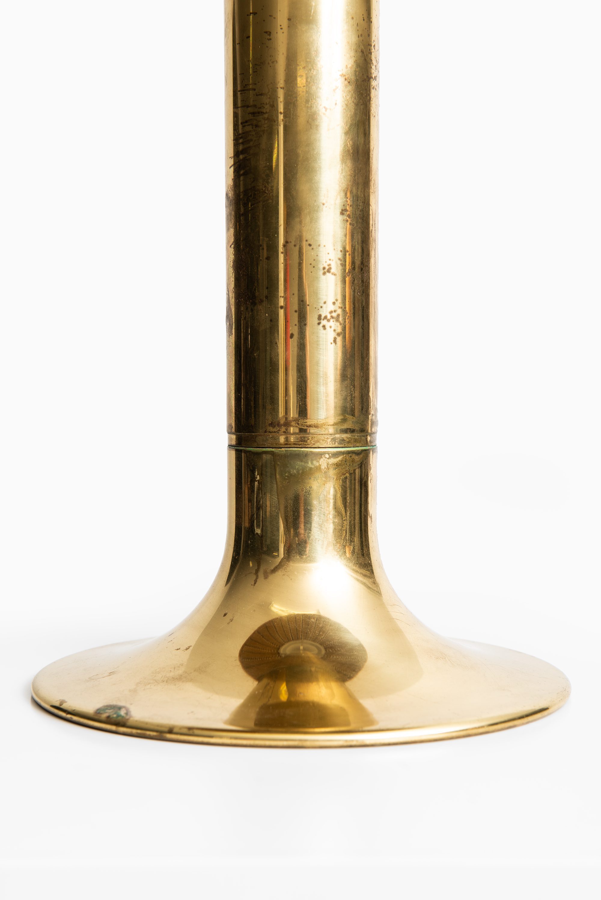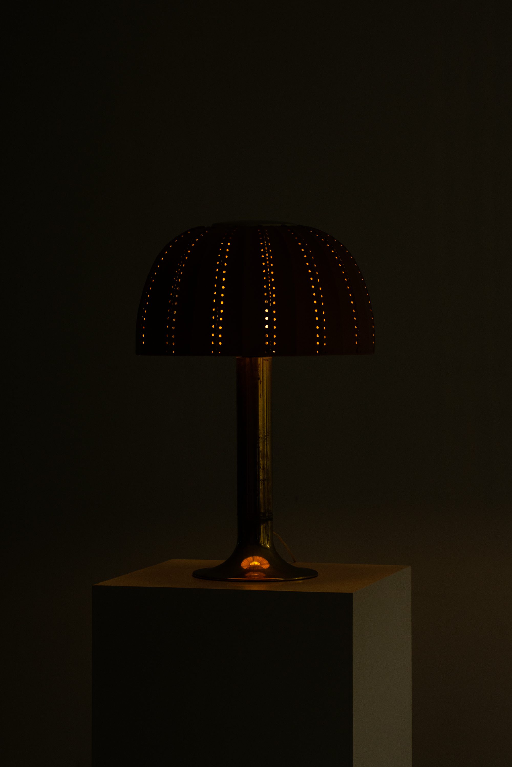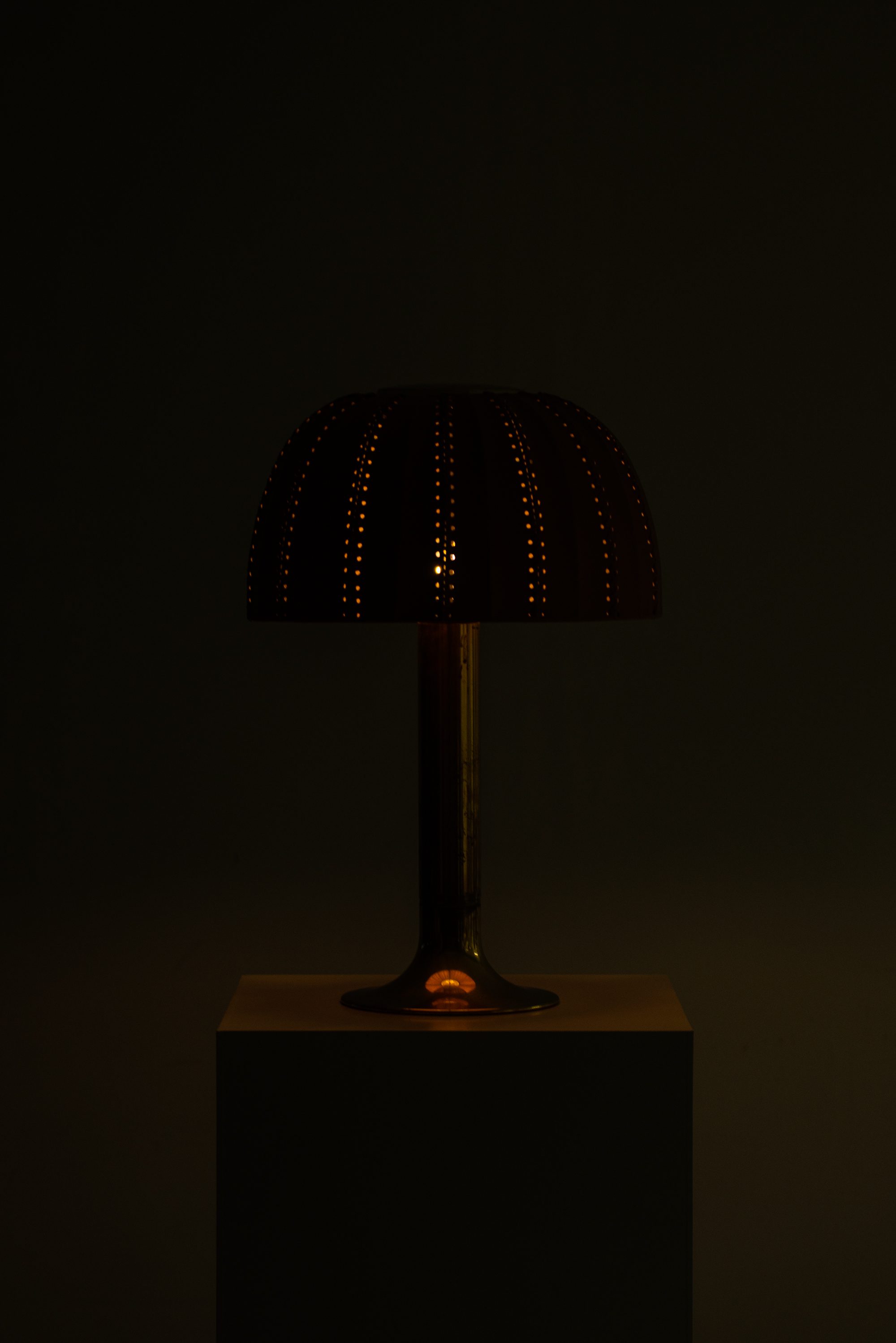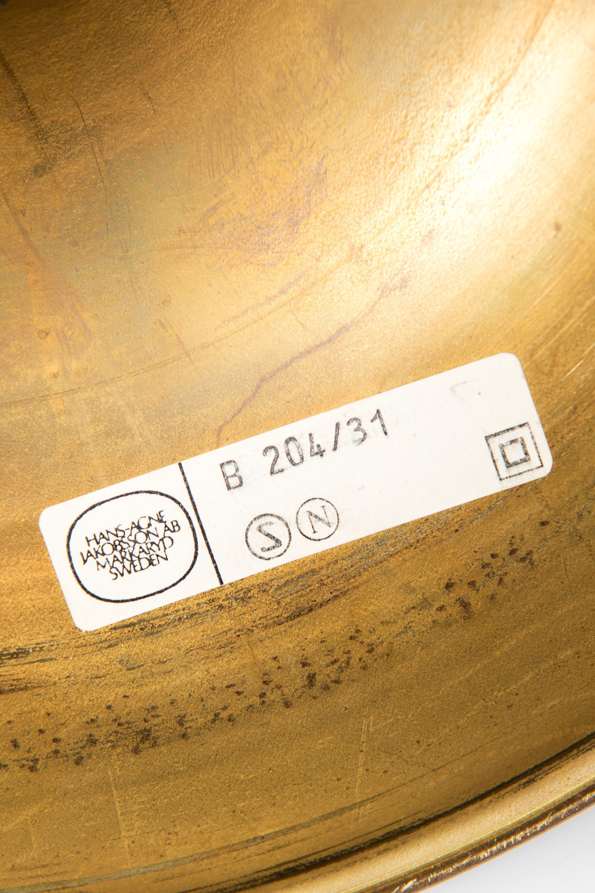 The rare table lamp model B-204/31 Carolin was designed in 1963 by Hans-Agne Jakobsson and produced by his company Hans-Agne Jakobsson AB in Markaryd, Sweden. It features a cylindrical brass stem that flares at the base and supports an original dome-shaped leather lampshade. The shade is crafted from natural tan leather panels, stitched together along vertical seams, with perforations along the inner edges that contribute to a distinctive handcrafted character. The dome form provides a soft diffusion of light while highlighting the material’s texture.