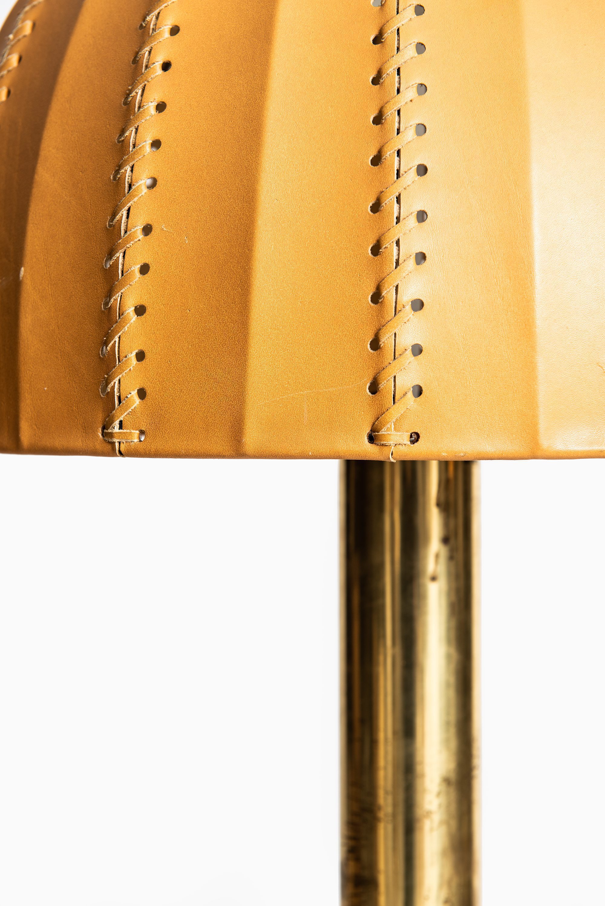 The lamp remains in good vintage condition, with small signs of usage and a natural patina to the brass consistent with its age. The leather shade retains its warm coloration and supple texture, with subtle wear that speaks to its authenticity and decades of careful use.