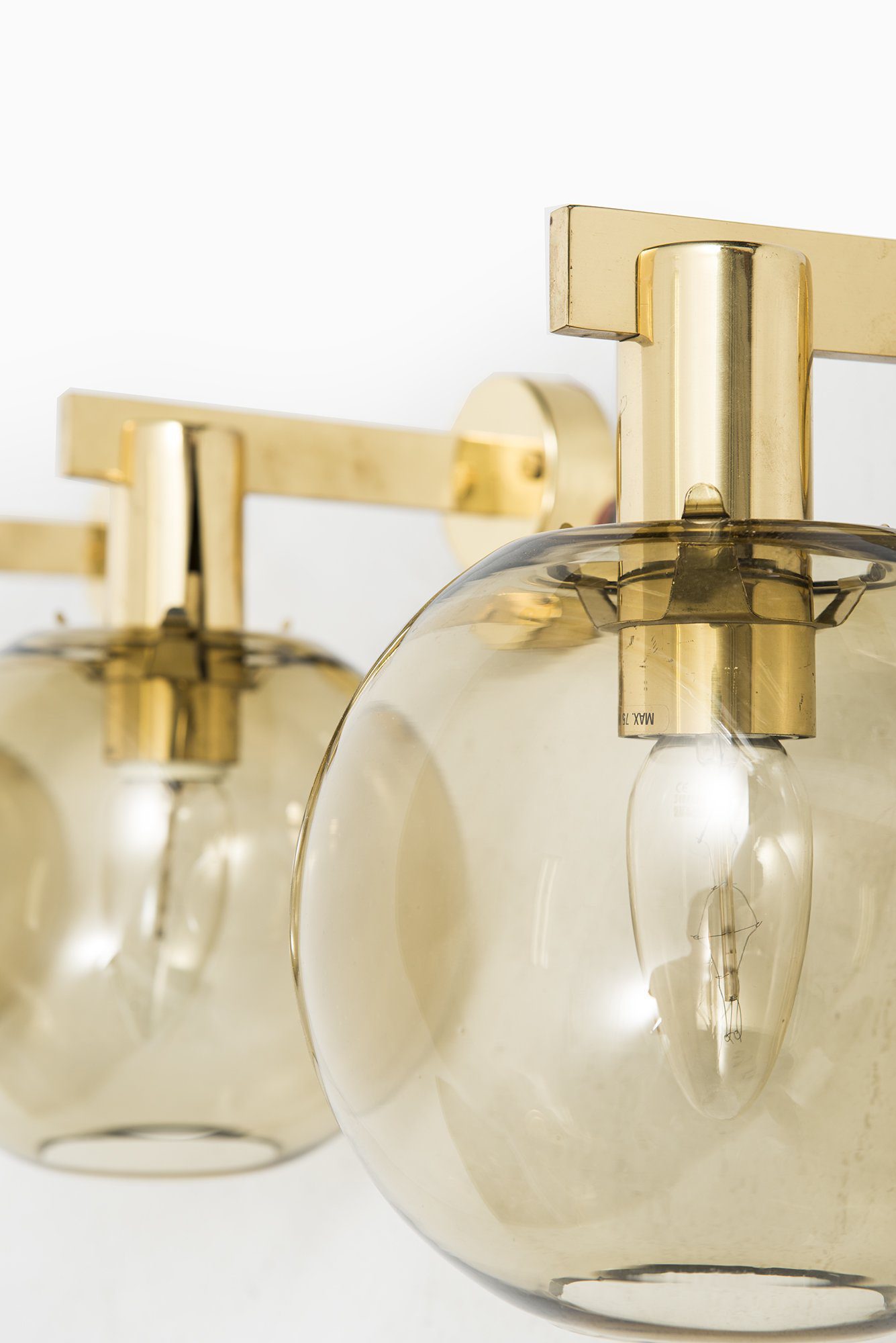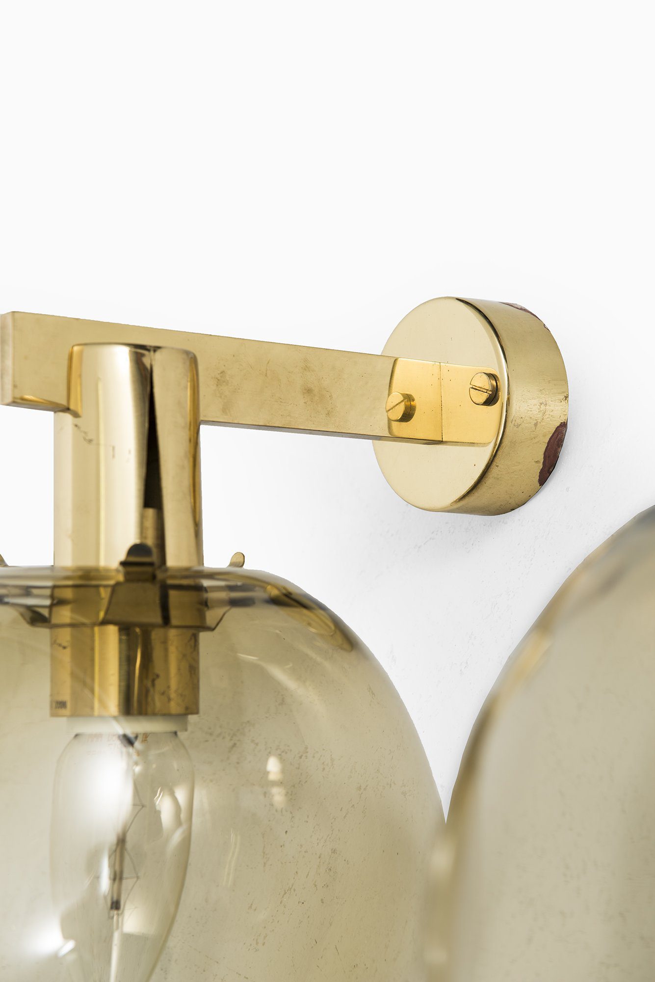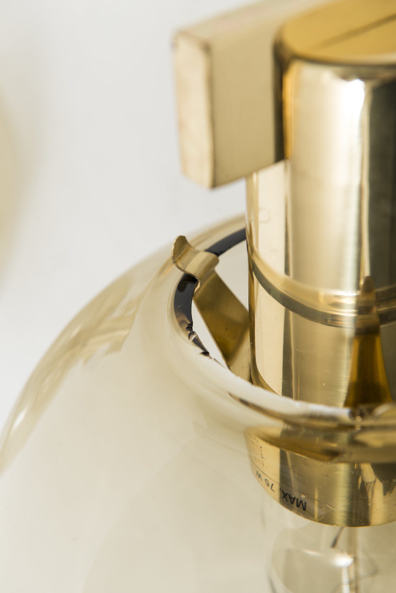 Rare wall lamp designed by Hans-Agne Jakobsson and produced by Hans-Agne Jakobsson AB in Markaryd, Sweden, during the 1960s. This lamp is executed in polished brass with spherical, smoke-colored glass shade, creating a warm and diffused light. The wall-mounted arm and cylindrical socket housing form a geometric composition that contrasts elegantly with the rounded glass globe, showcasing Jakobsson’s characteristic balance between minimalism and atmospheric lighting.