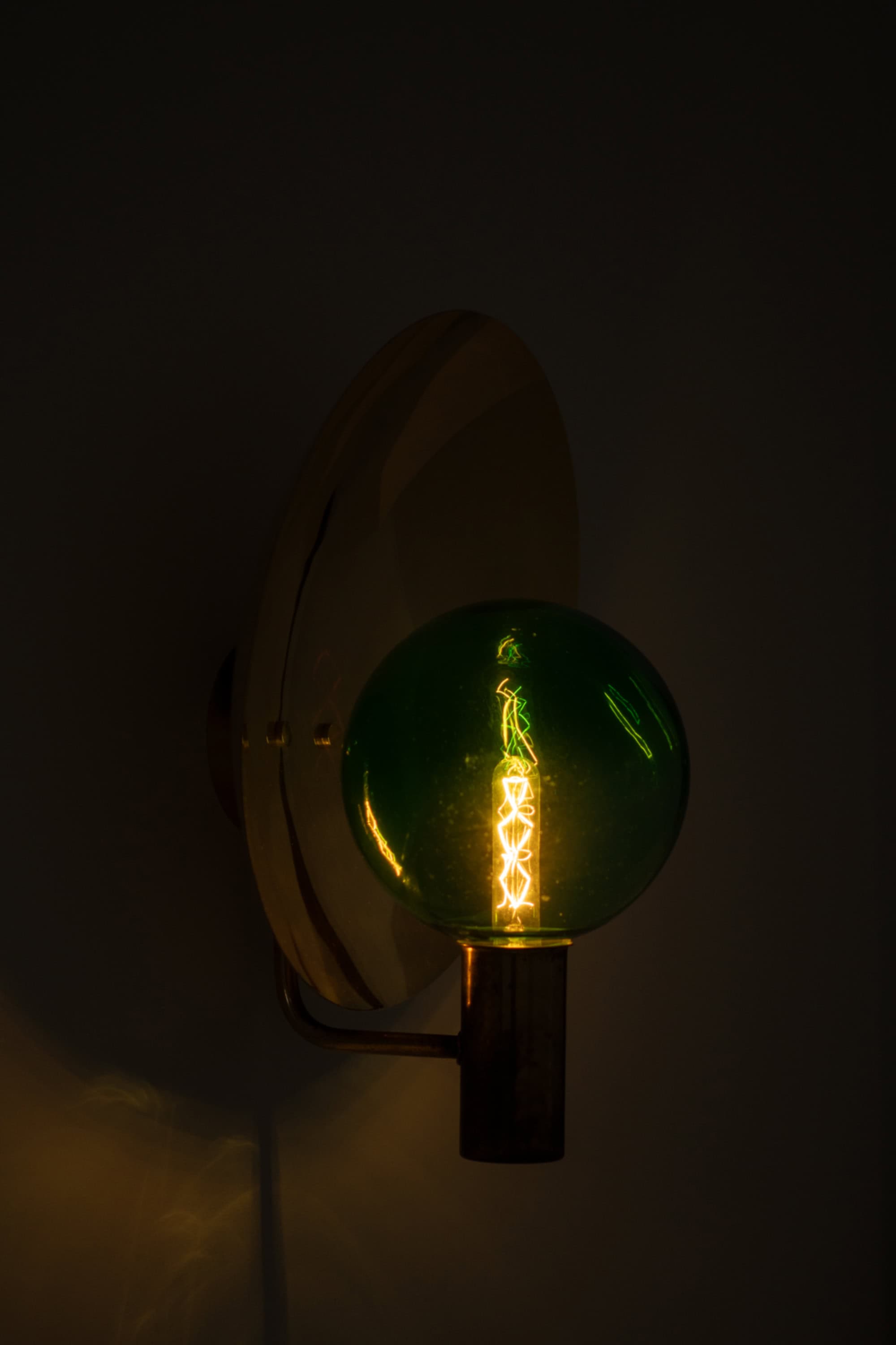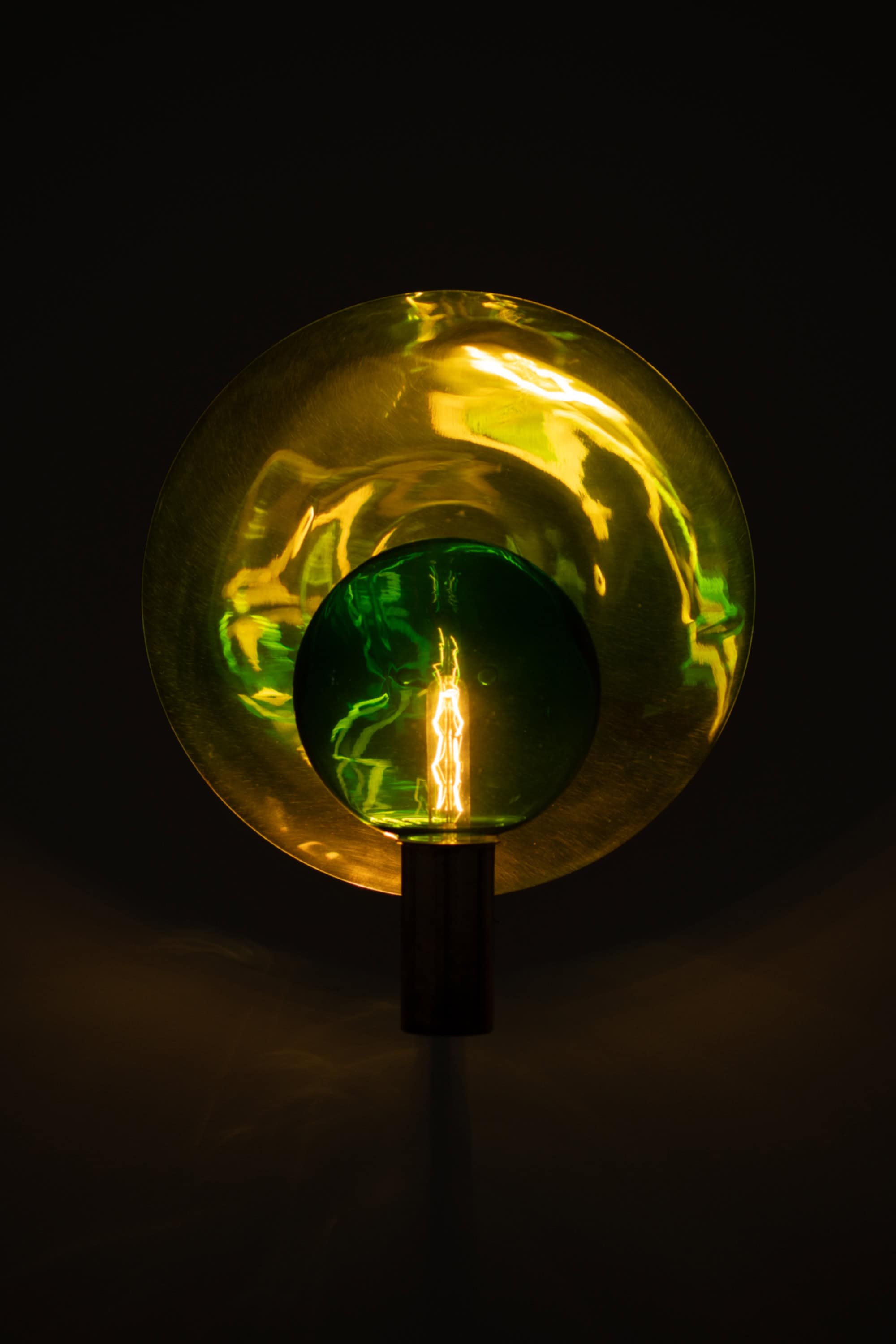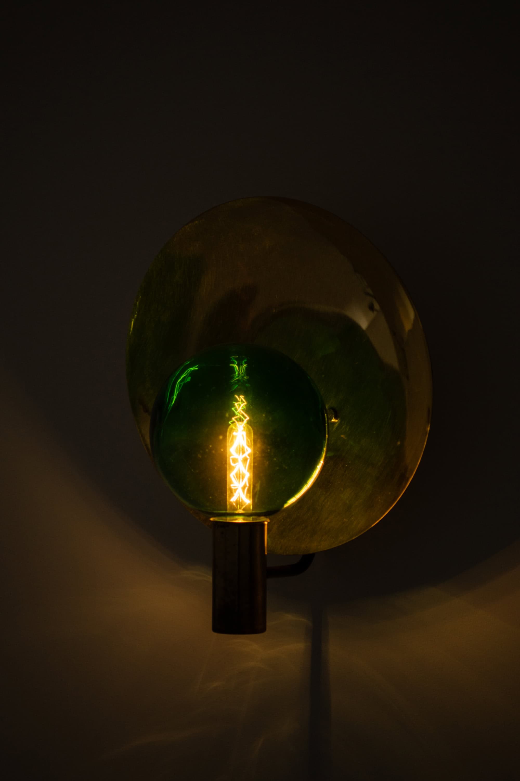 The lamp consists of a polished circular brass backplate with a softly convex profile, mounted slightly off the wall to enhance its reflective qualities. In front of the brass disc sits a spherical glass shade in a deep green tone, partially enclosing the light source. The glass sphere is supported by a cylindrical brass holder connected to the backplate by a short curved arm. This layered construction allows the brass surface to reflect and amplify the light emitted through the green glass, creating a complex interplay of color, reflection, and shadow.
