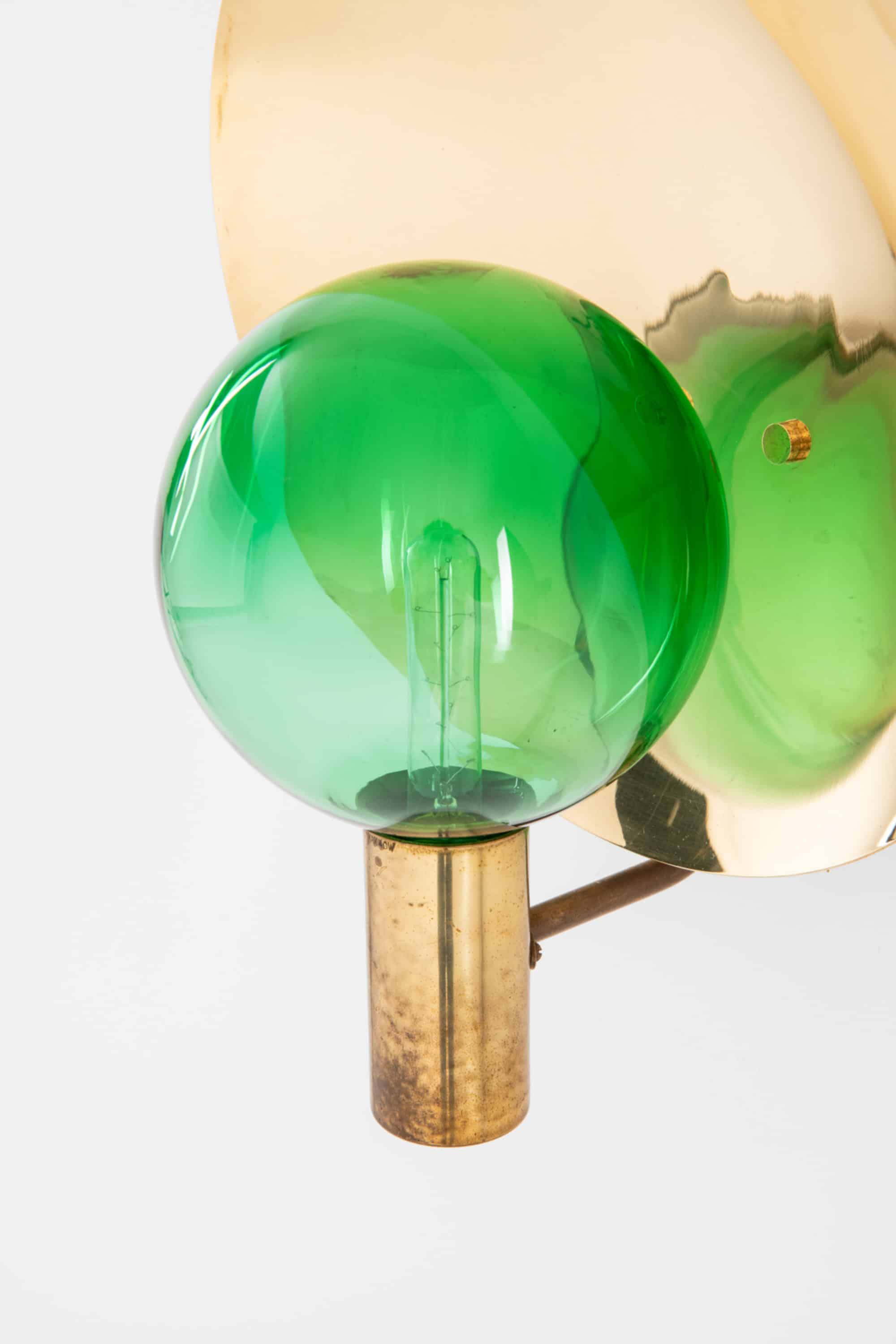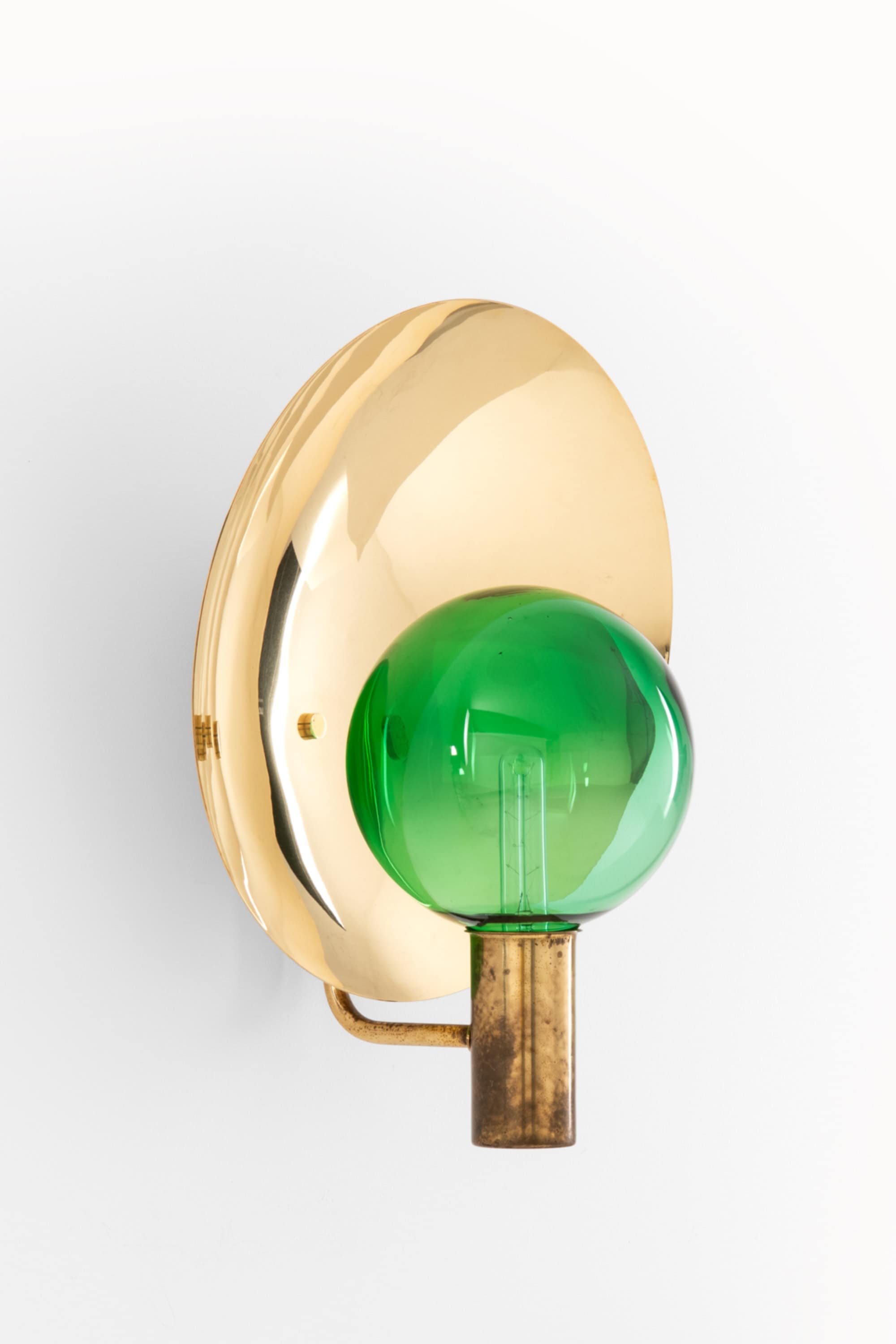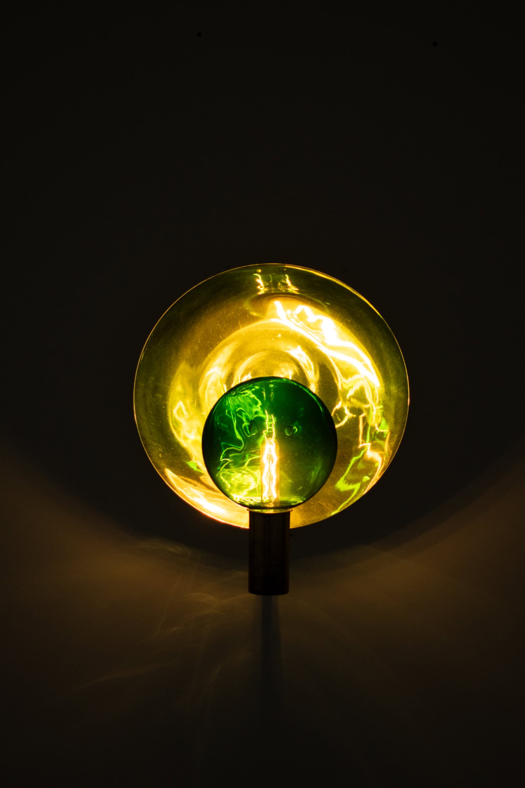 The lamp consists of a polished circular brass backplate with a softly convex profile, mounted slightly off the wall to enhance its reflective qualities. In front of the brass disc sits a spherical glass shade in a deep green tone, partially enclosing the light source. The glass sphere is supported by a cylindrical brass holder connected to the backplate by a short curved arm. This layered construction allows the brass surface to reflect and amplify the light emitted through the green glass, creating a complex interplay of color, reflection, and shadow.