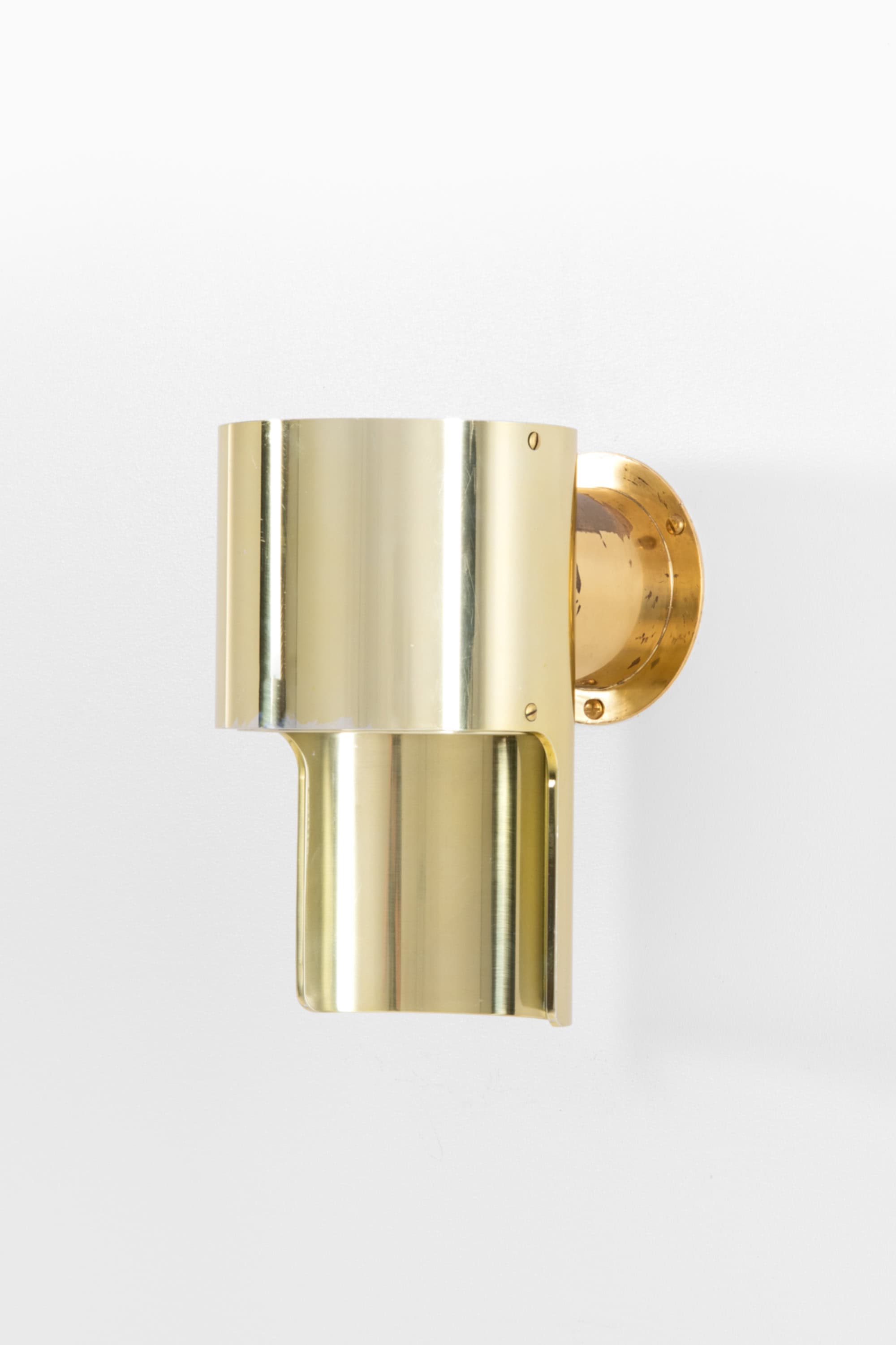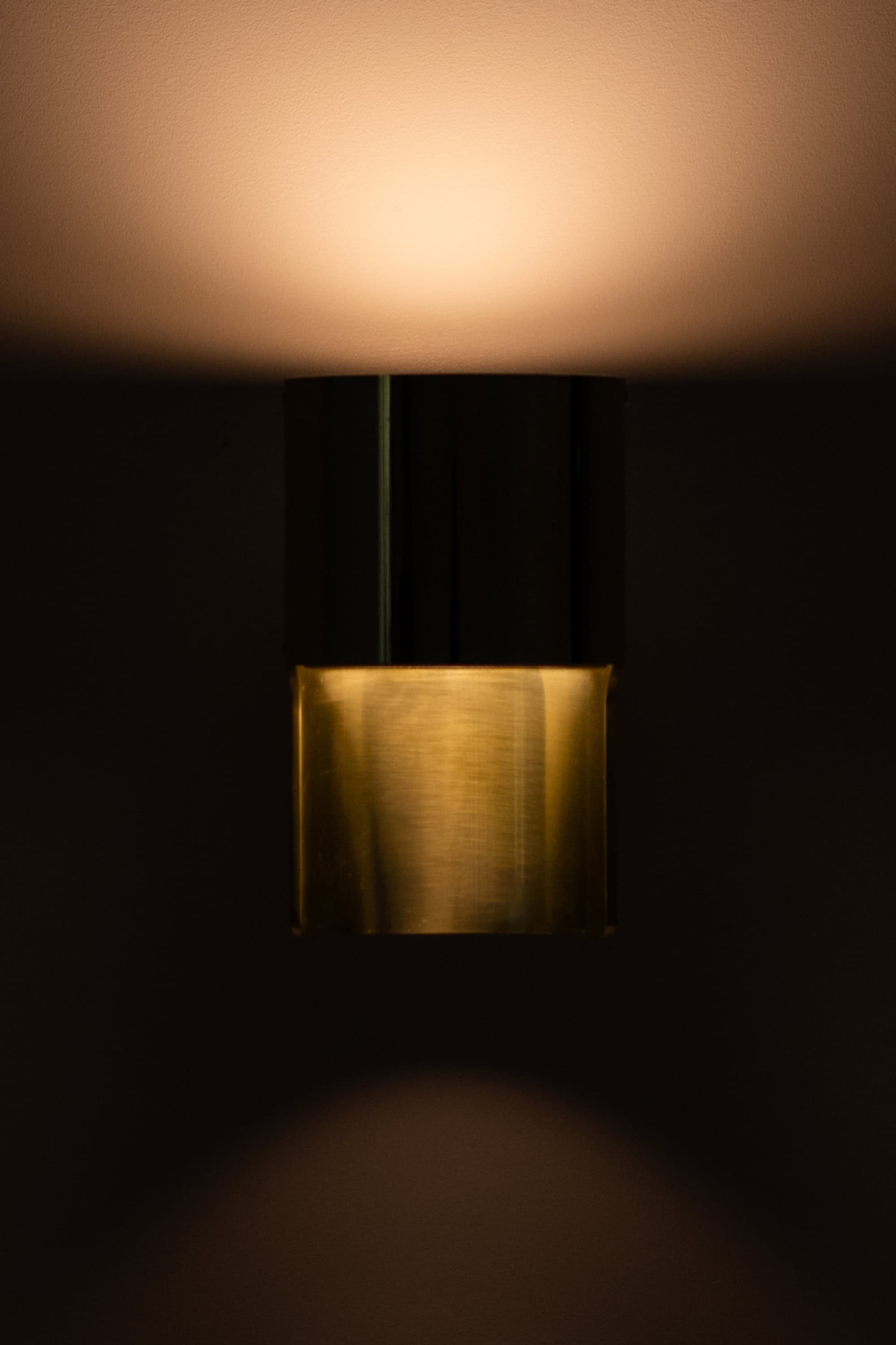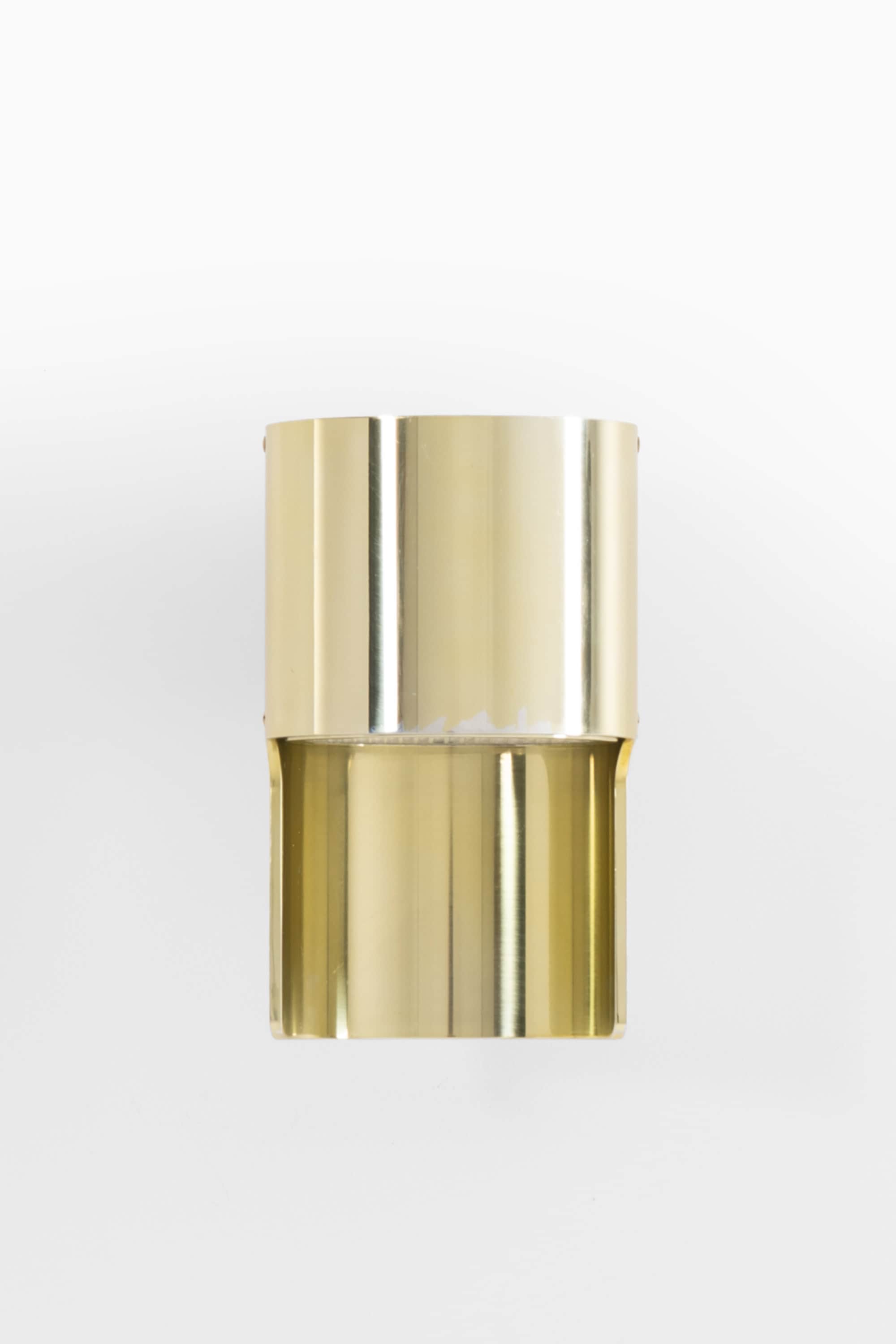 This wall lamp is a unique brass fixture designed by Hans-Agne Jakobsson and produced by Hans-Agne Jakobsson AB in Markaryd, Sweden during the 1960s. The lamp has a compact, sculptural cylindrical form with a stepped construction, where the upper body transitions into a lower curved brass section. The design is characterized by clean vertical surfaces, precise cut-outs, and a carefully controlled opening that directs the light in a defined arc rather than exposing the light source directly.